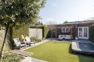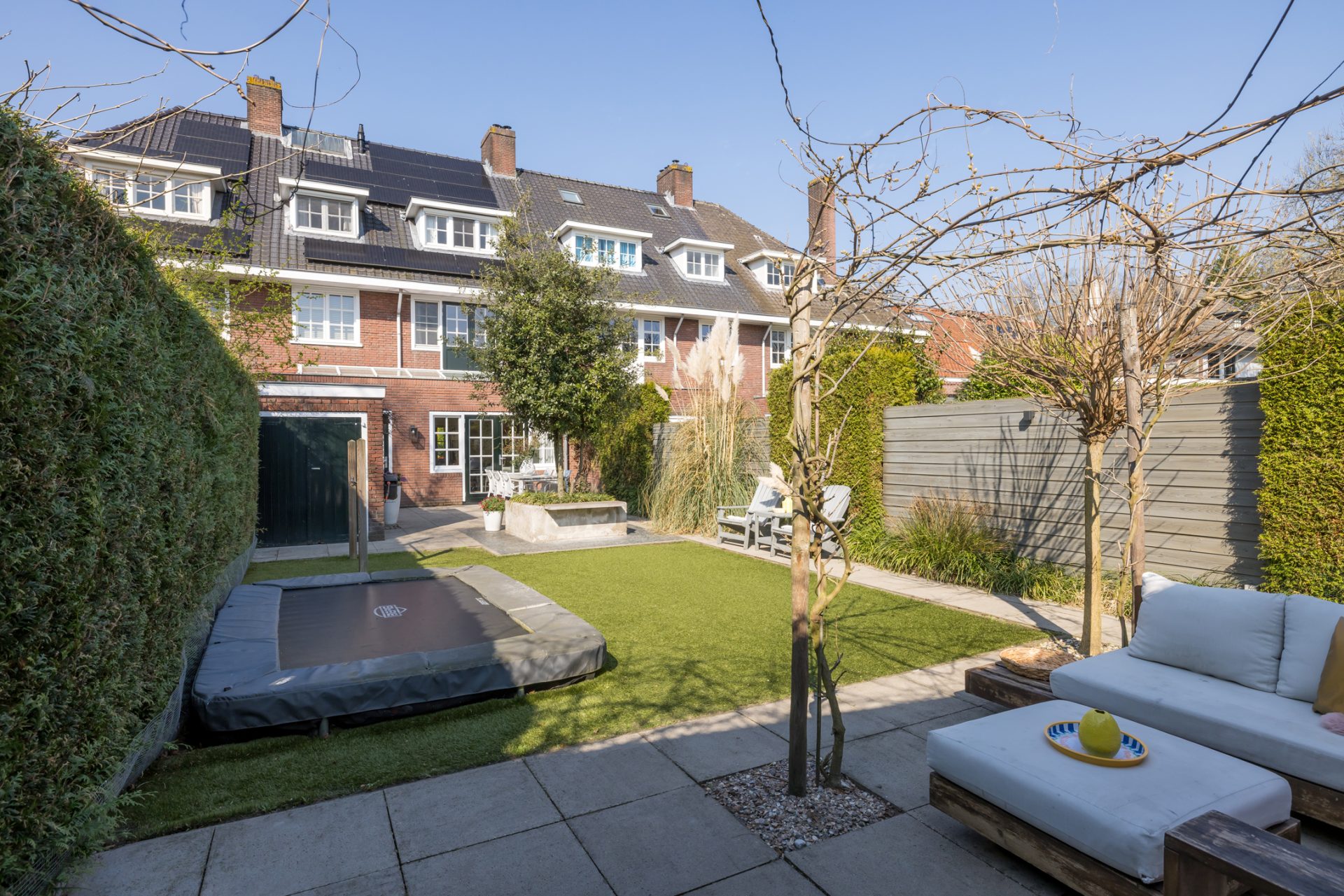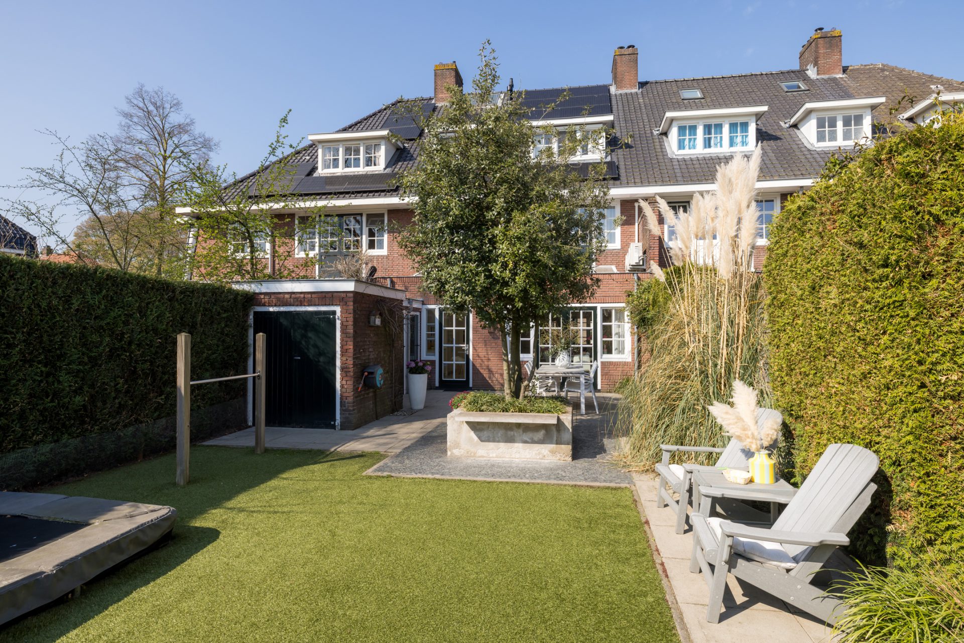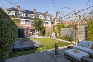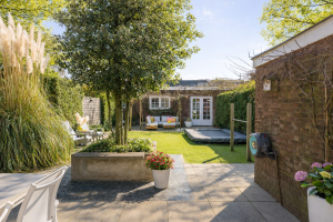 De diepe achtertuin op het zuidoosten is optimaal ingedeeld met twee grote terrassen, gevarieerde beplanting en een fijne speelplek voor de kinderen. Er zijn meerdere bergingen, voor tuingereedschap en andere spullen, en aan de achterzijde geven dubbele deuren toegang tot de garage.