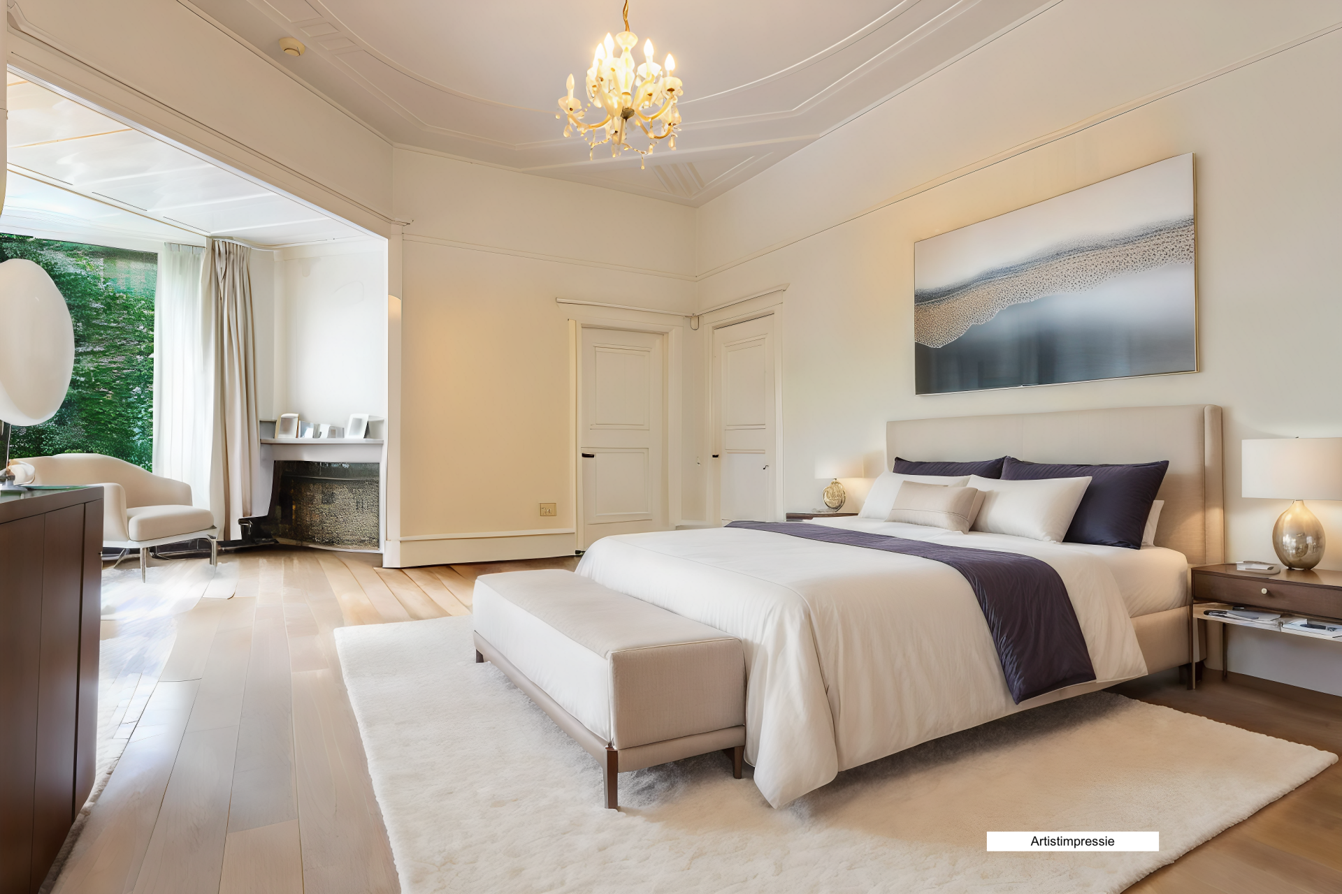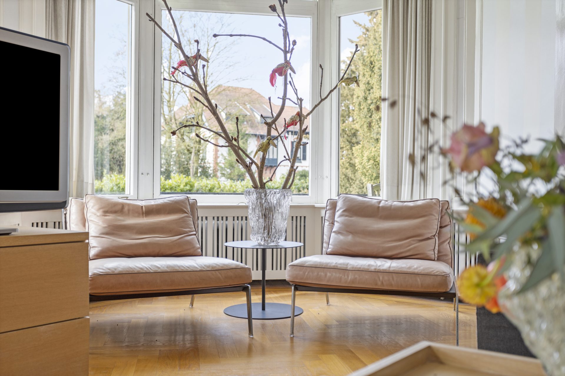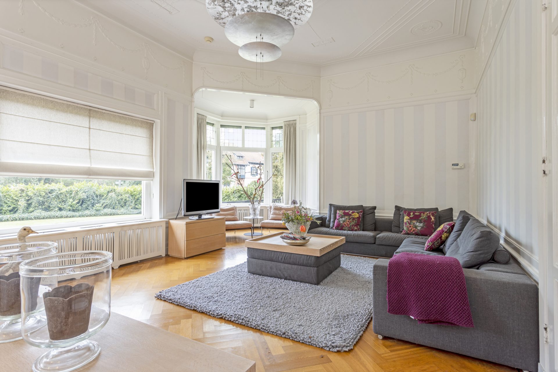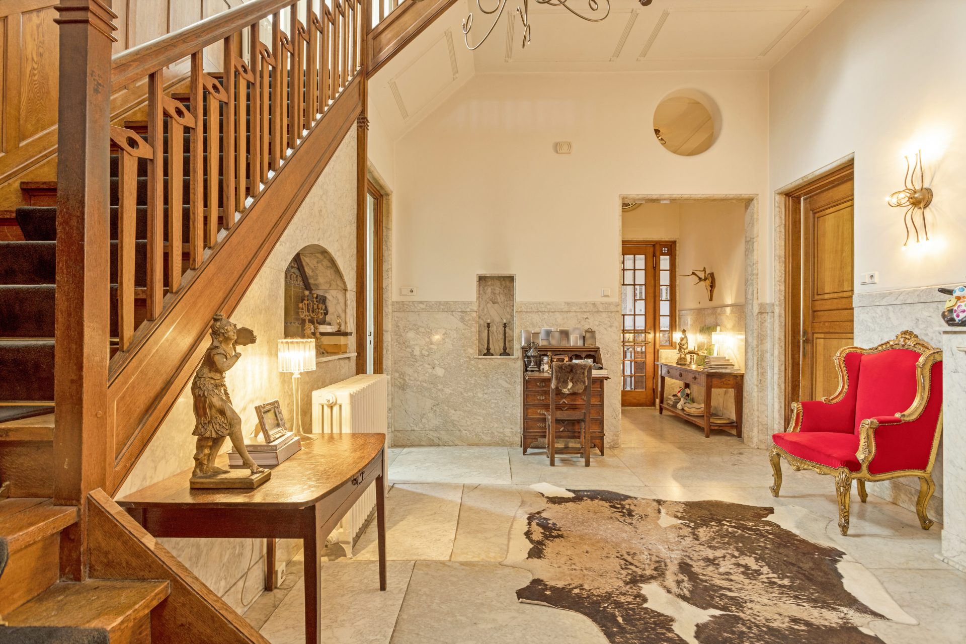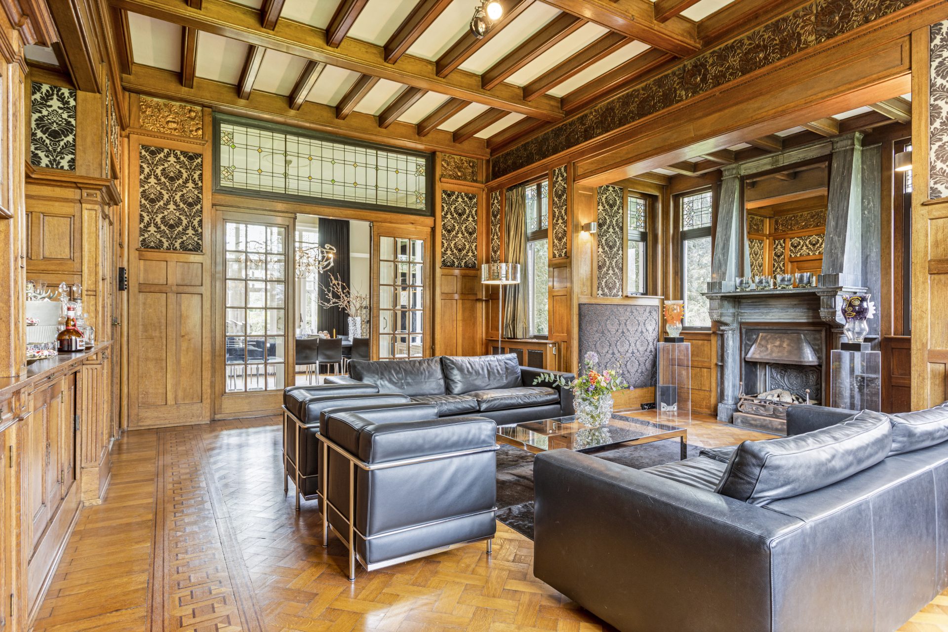 Wanneer u deze villa binnenkomt, wordt u verwelkomd door een schitterende hal die precies doet waarvoor hij ontworpen is: indruk maken. Het prachtige marmer op de vloeren en wanden, en een charmant glas-in-lood kajuitraampje boven de authentieke voordeur was en is indrukwekkend. De villa biedt nog veel meer indrukwekkende ruimtes die tegelijkertijd toch ook verrassend huiselijk zijn. Zo is er onder meer een sfeervolle werkkamer met een adembenemend uitzicht over de voortuin en de President Rooseveltlaan, een grote living met een prachtige visgraatvloer en een schouw (Boley gashaard), een kamer-en-suite met marmeren schouw en openslaande deuren naar het terras in de tuin.