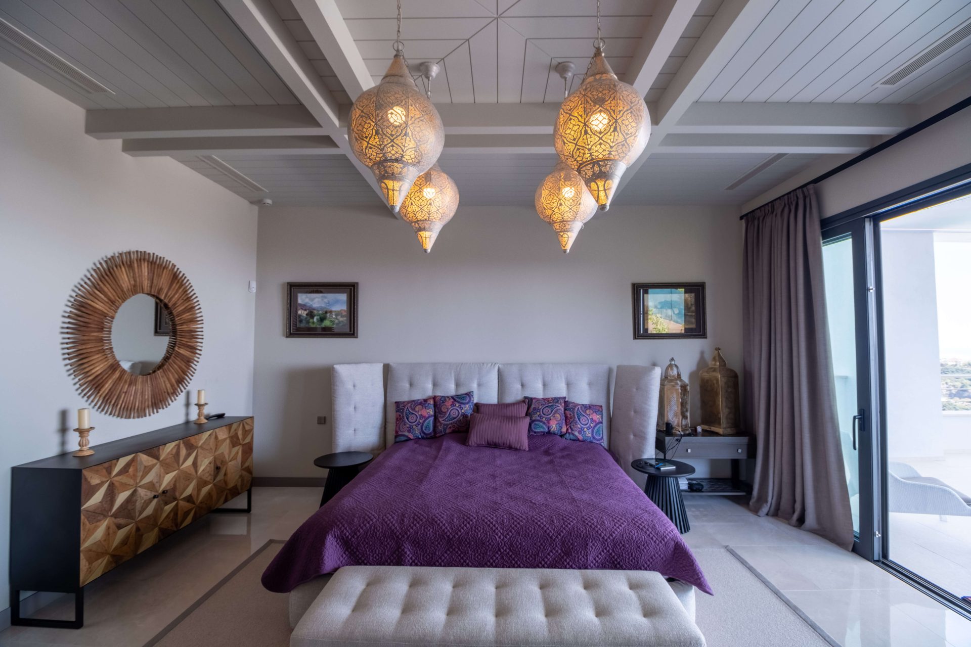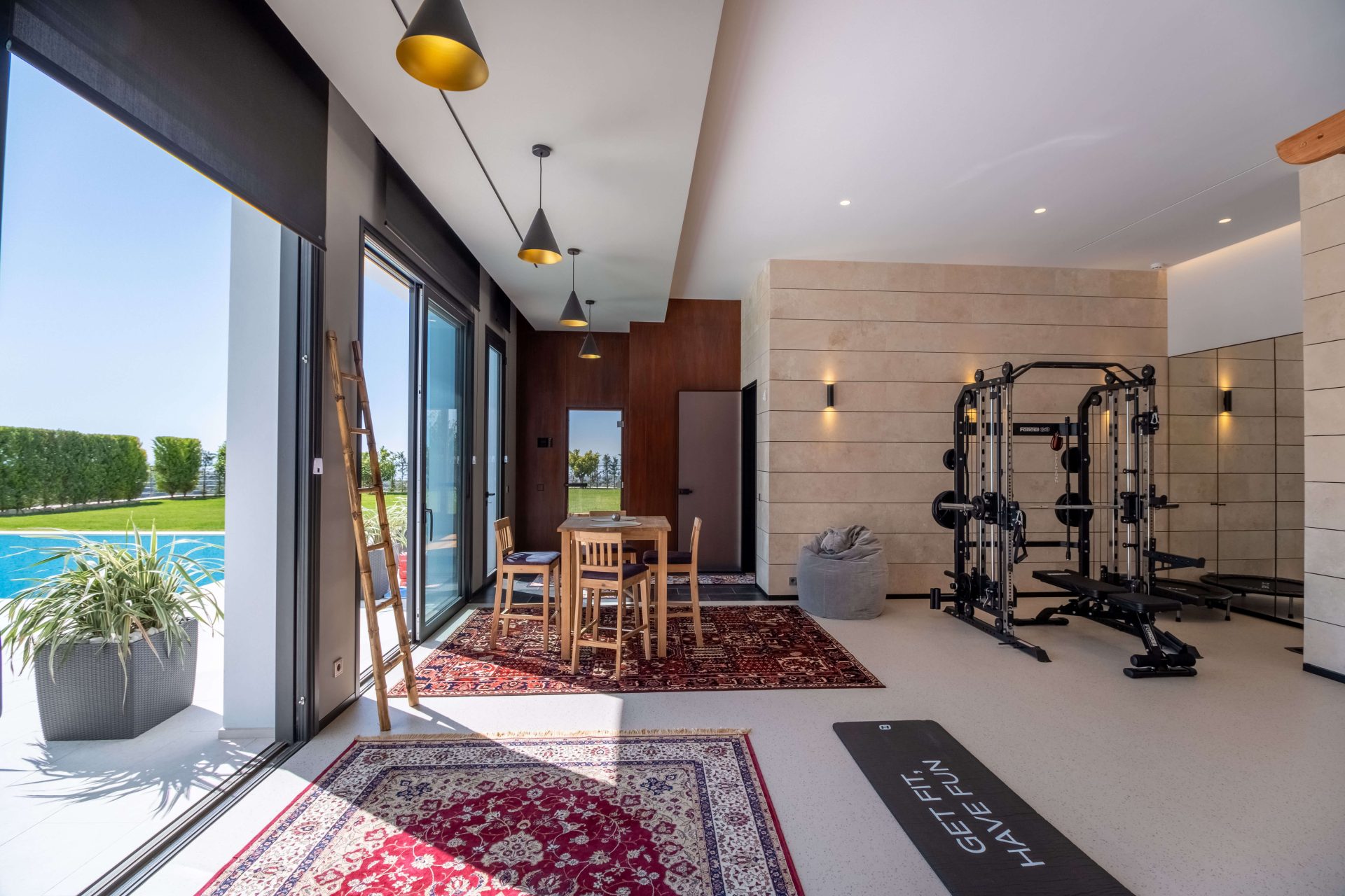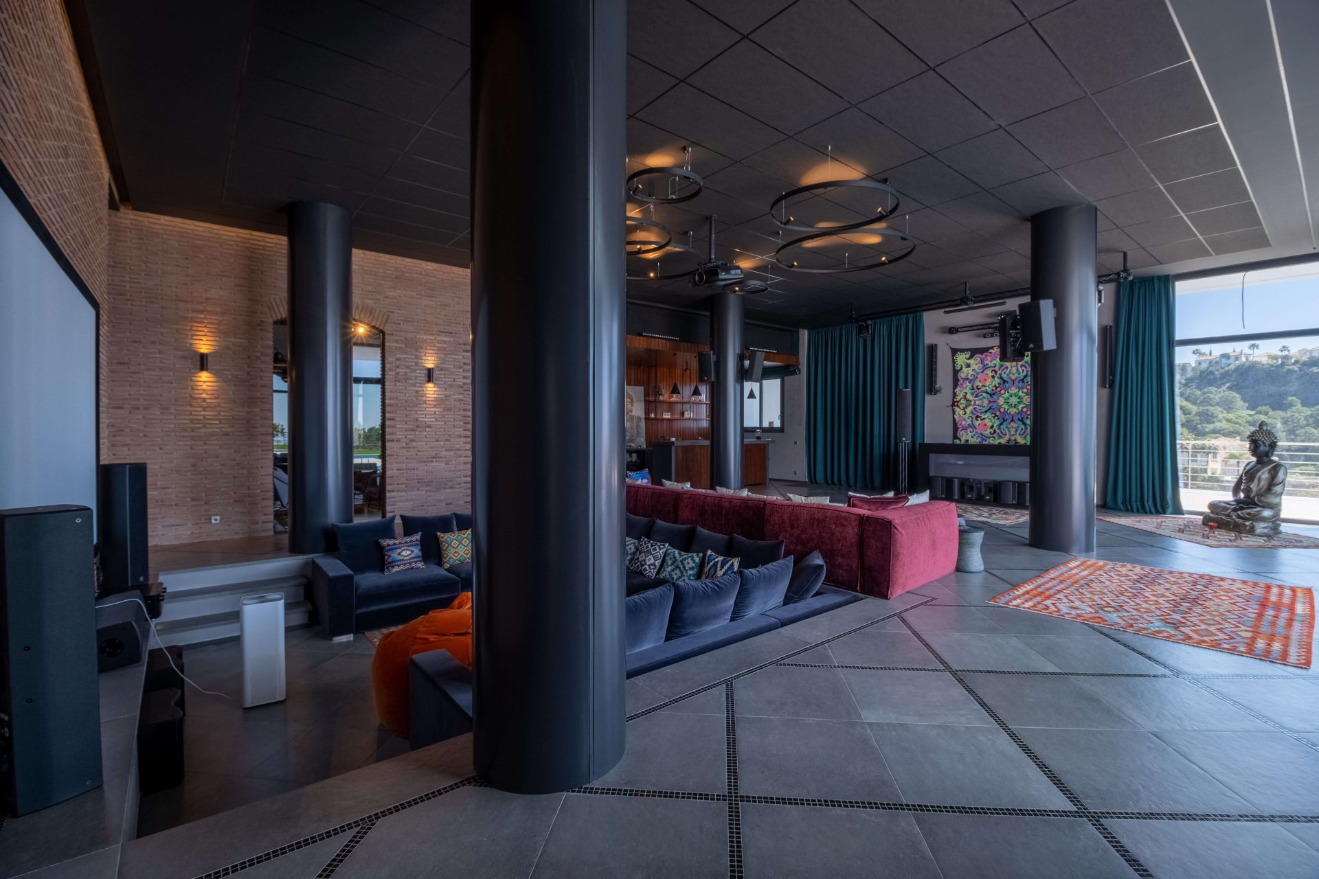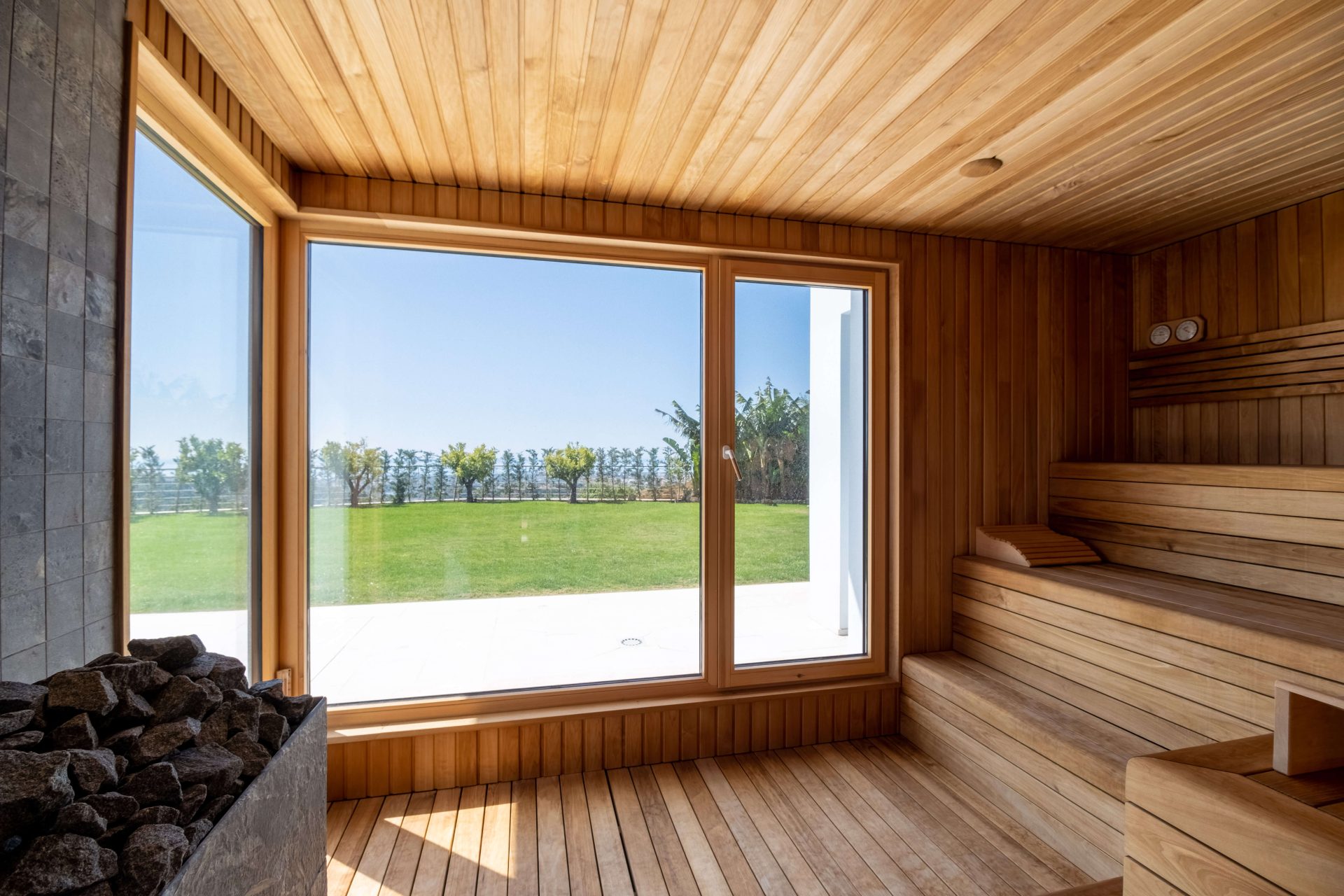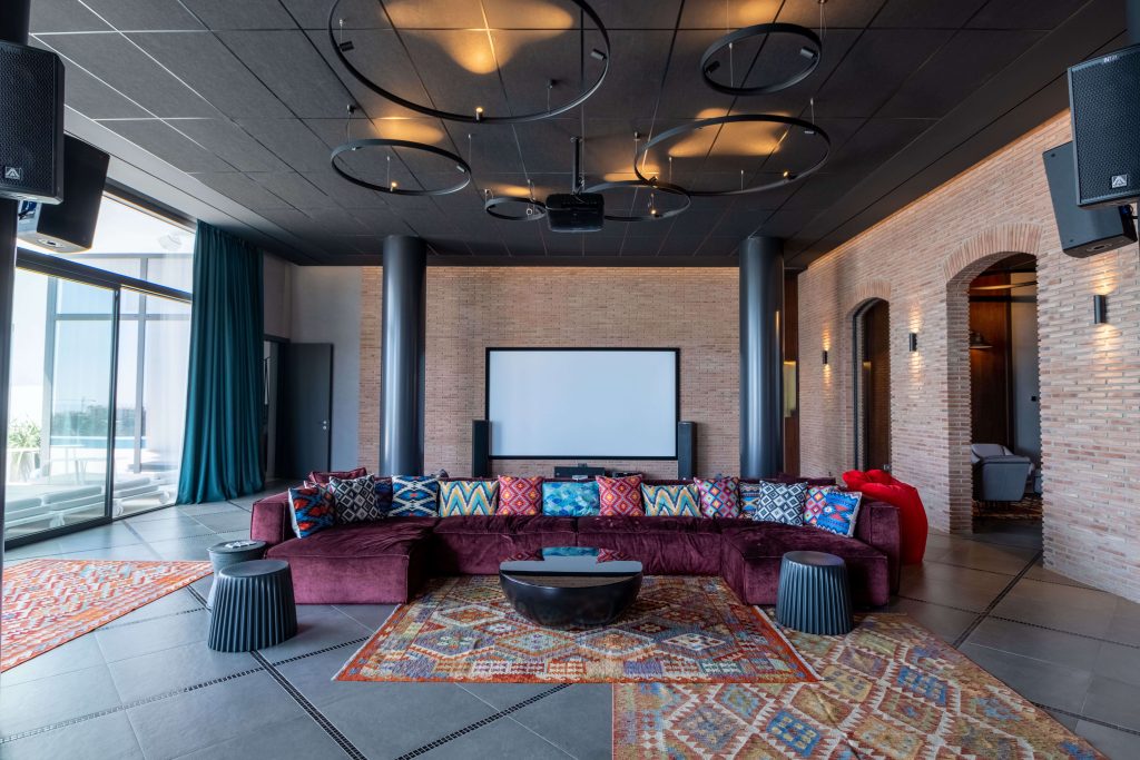 De hoofdkeuken is volledig uitgerust en biedt een eetkamer met panoramisch uitzicht, terwijl er ook nog eens 3 extra keukens verspreid zijn over de villa. Er is zelfs een aparte ruimte met een bioscoop, een dansvloer met bar en een professionele wijnkelder. Voor de sportievelingen is er een fitnessruimte met uitzicht, gevolgd door een ontspannende sauna.