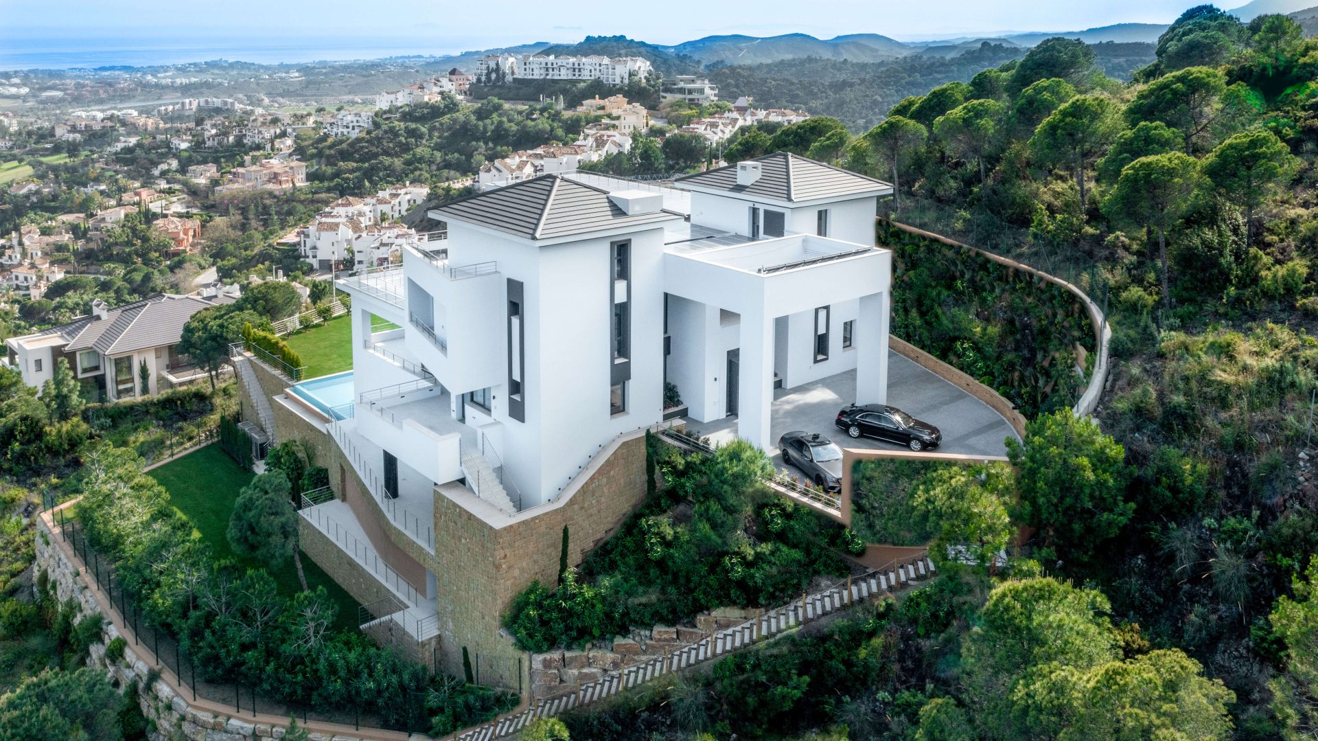 Het personeel verblijft op een aparte verdieping, terwijl de ruime garage plaats biedt aan maar liefst 6 auto’s, met nog eens 6 op het buitenterrein. Het verwarmde oneindige zwembad wordt omringd door een prachtige tuin, waardoor een oase van rust ontstaat.