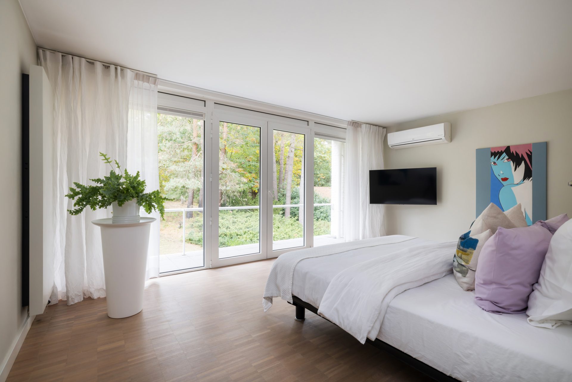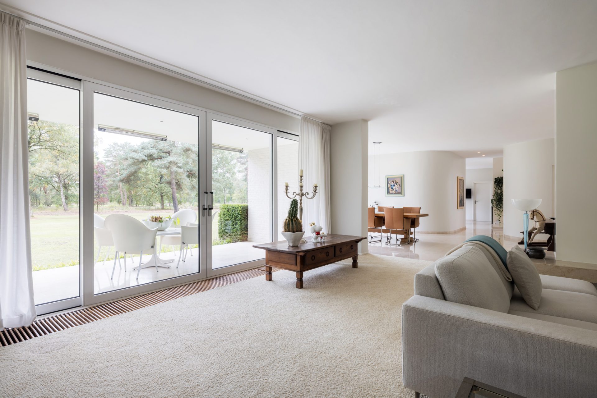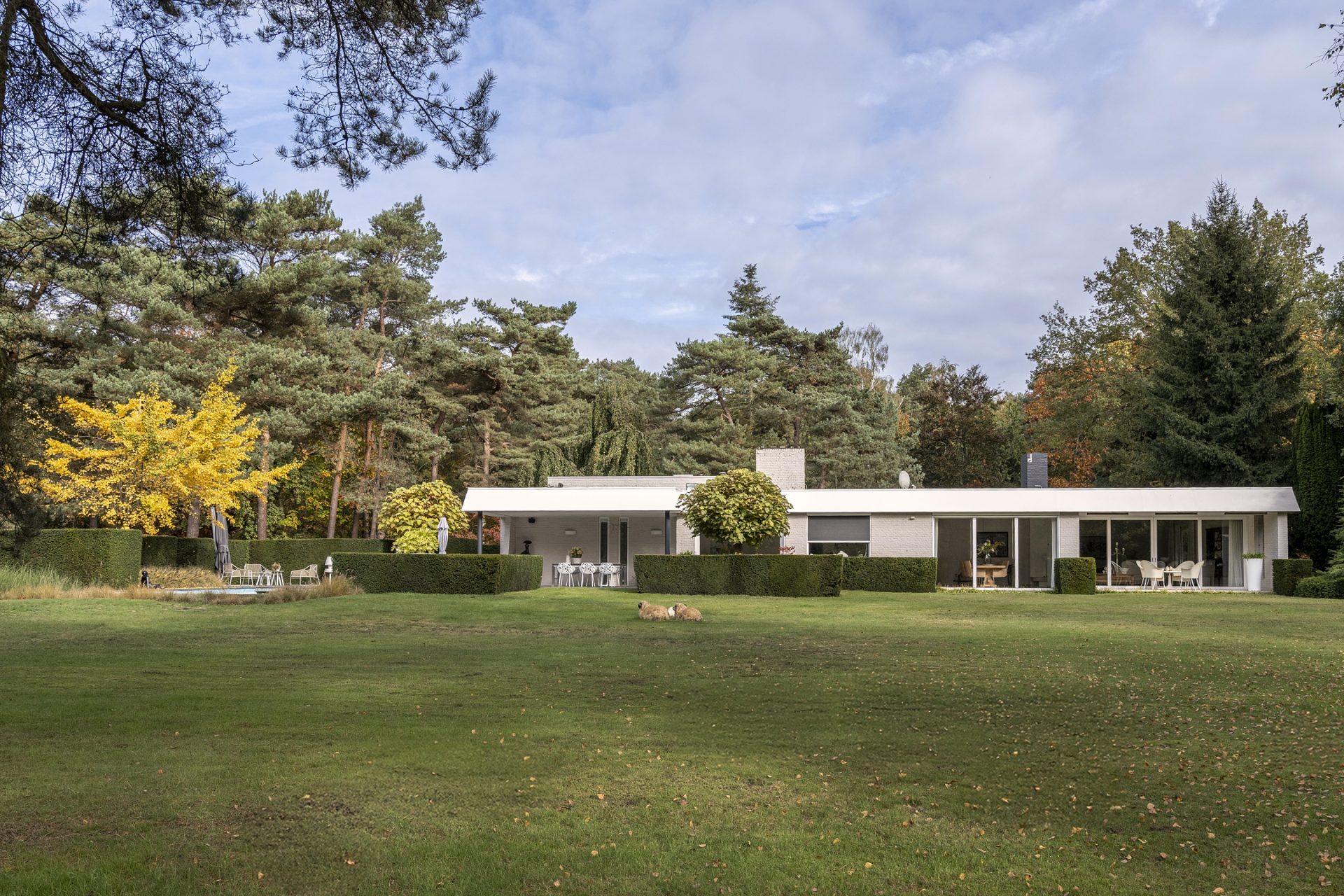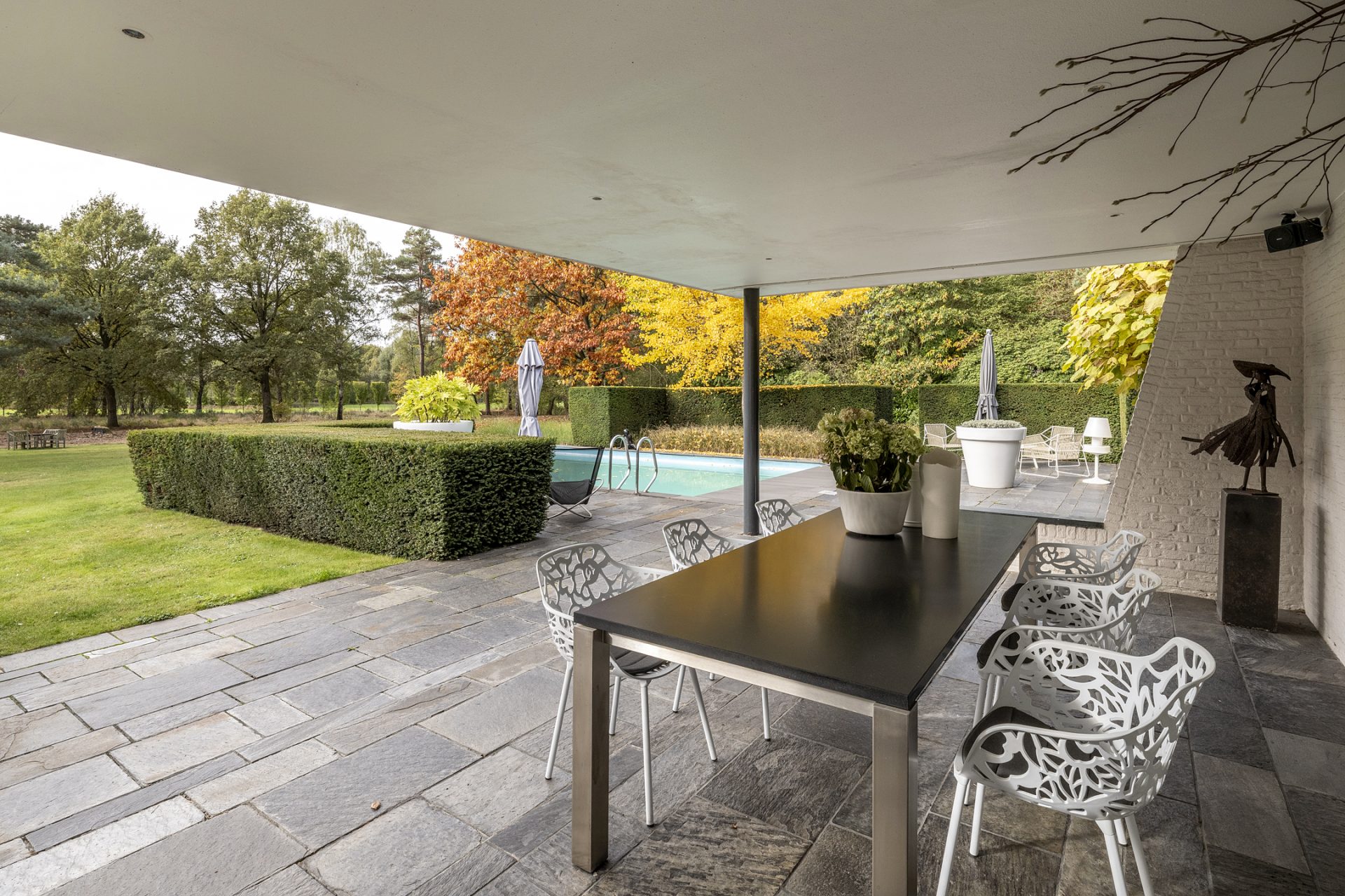 Vanaf de Rederijklaan rij je de oprijlaan op, omringd door bomen en prachtige beplanting. Parkeer de auto, stap uit en neem de tijd om de villa en omgeving te bewonderen. Je ervaart direct dat je op een bijzondere plek bent, met optimale privacy en een aangename rust.
