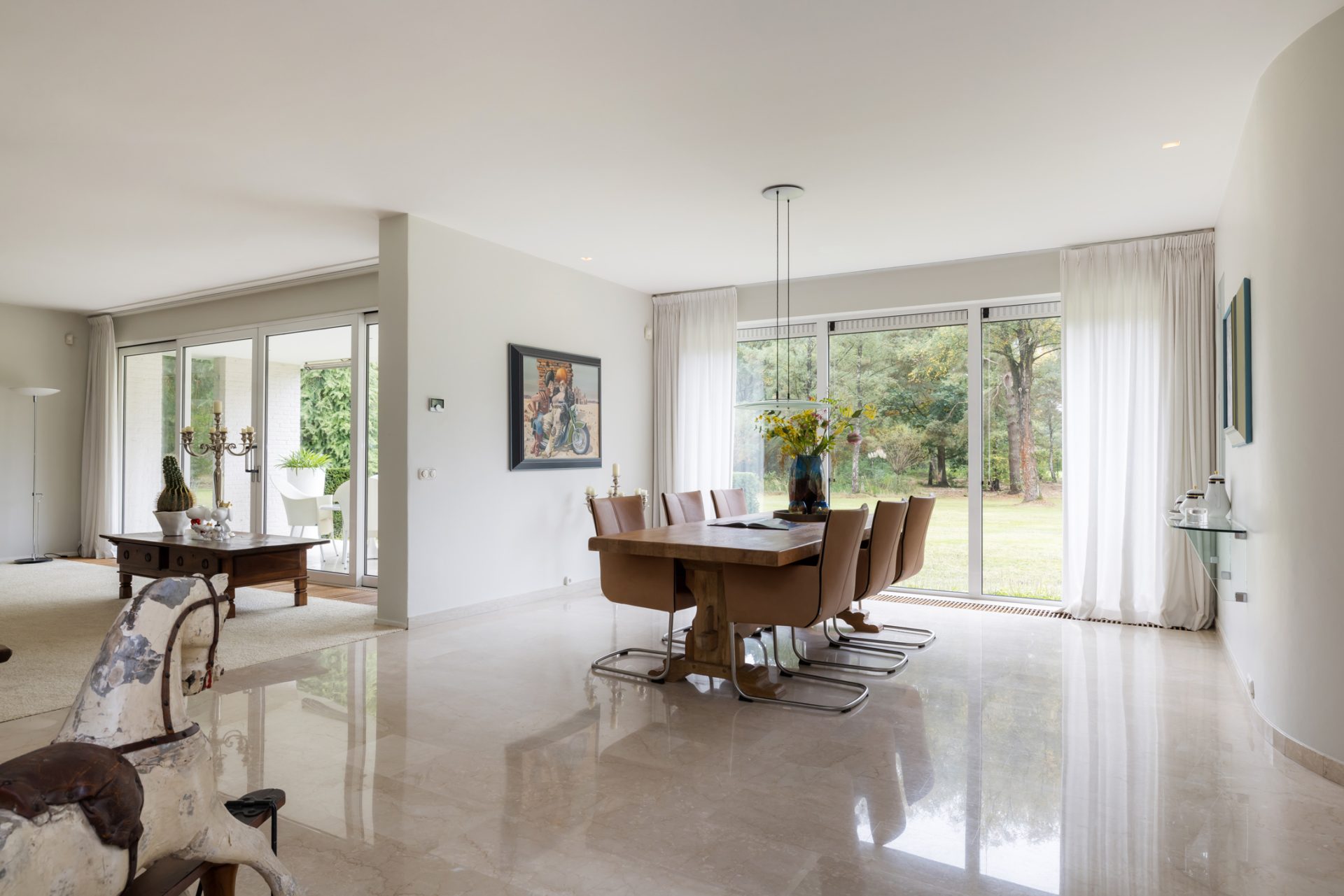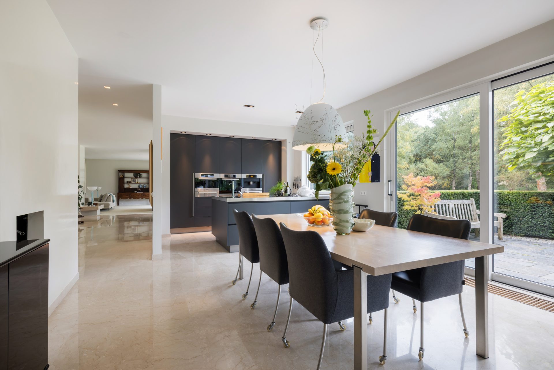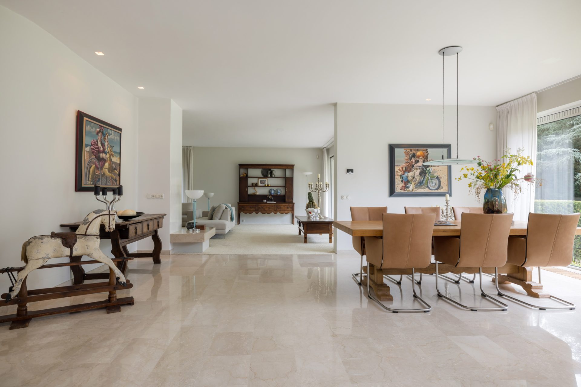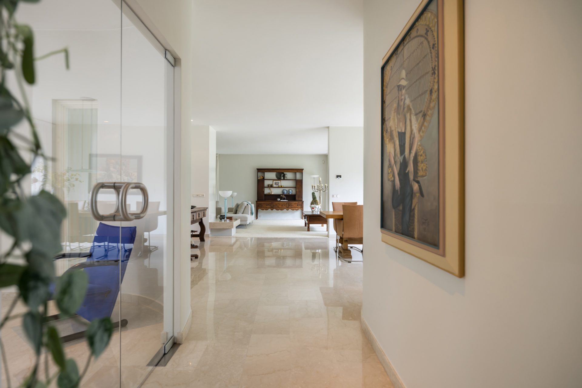 De entree is indrukwekkend, vanwege het formaat en de lichtinval. Marmer is gecombineerd met stucwerk en het trappenhuis met rvs-leuning verbindt de hal met het souterrain en de slaapvleugel.