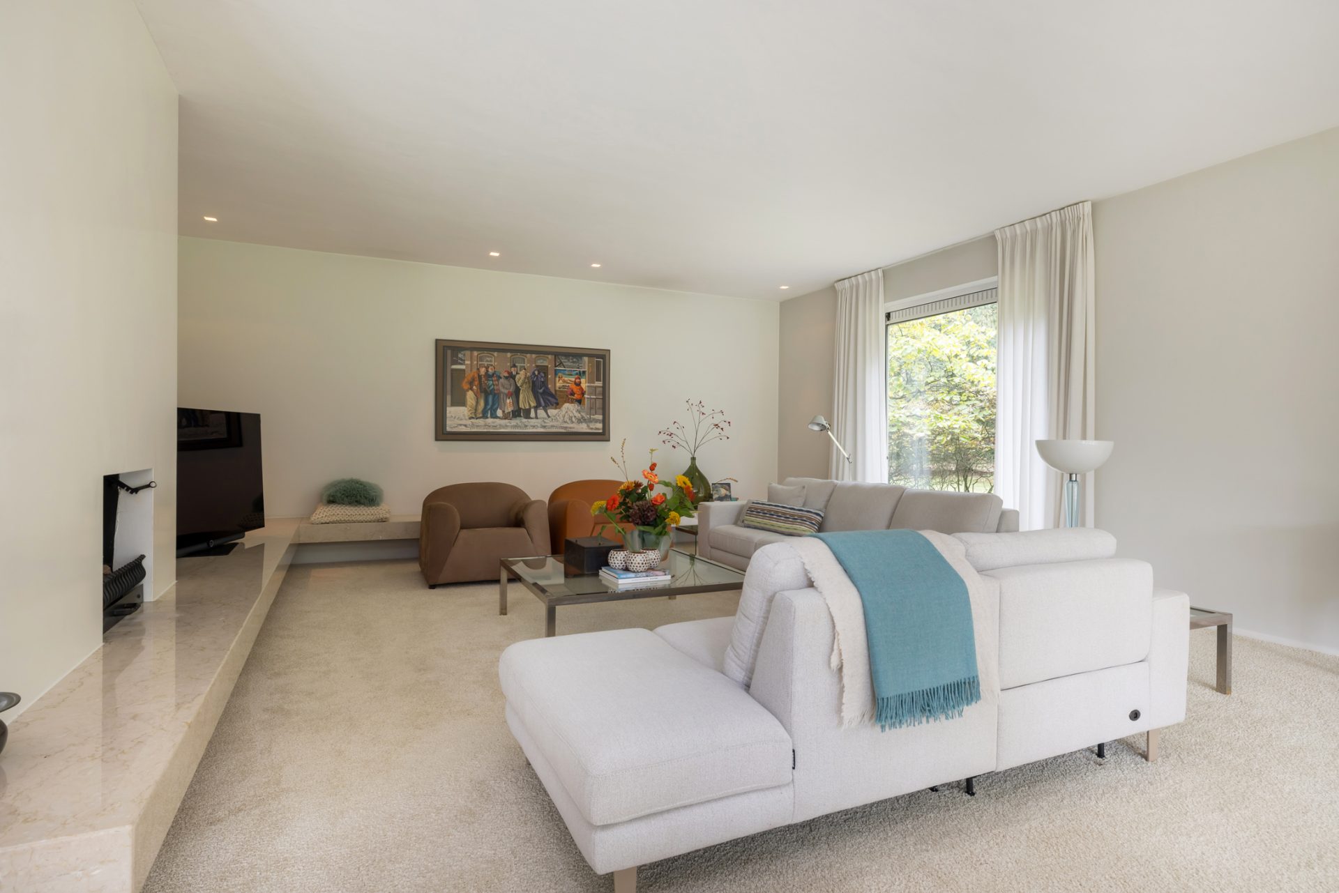 Twee glazen deuren in de hal geven toegang tot de woon-/eetkamer en woonkeuken. Groot van formaat, maar met een prettige indeling in meerdere ruimtes. De zit-/tv-kamer bij de gashaard is een geliefde plek, net als de eetkamer waar je in stijl kunt dineren met vrienden of familie. Er is een aparte home-office, die ook als speelkamer of tv-kamer van de kinderen gebruikt kan worden.