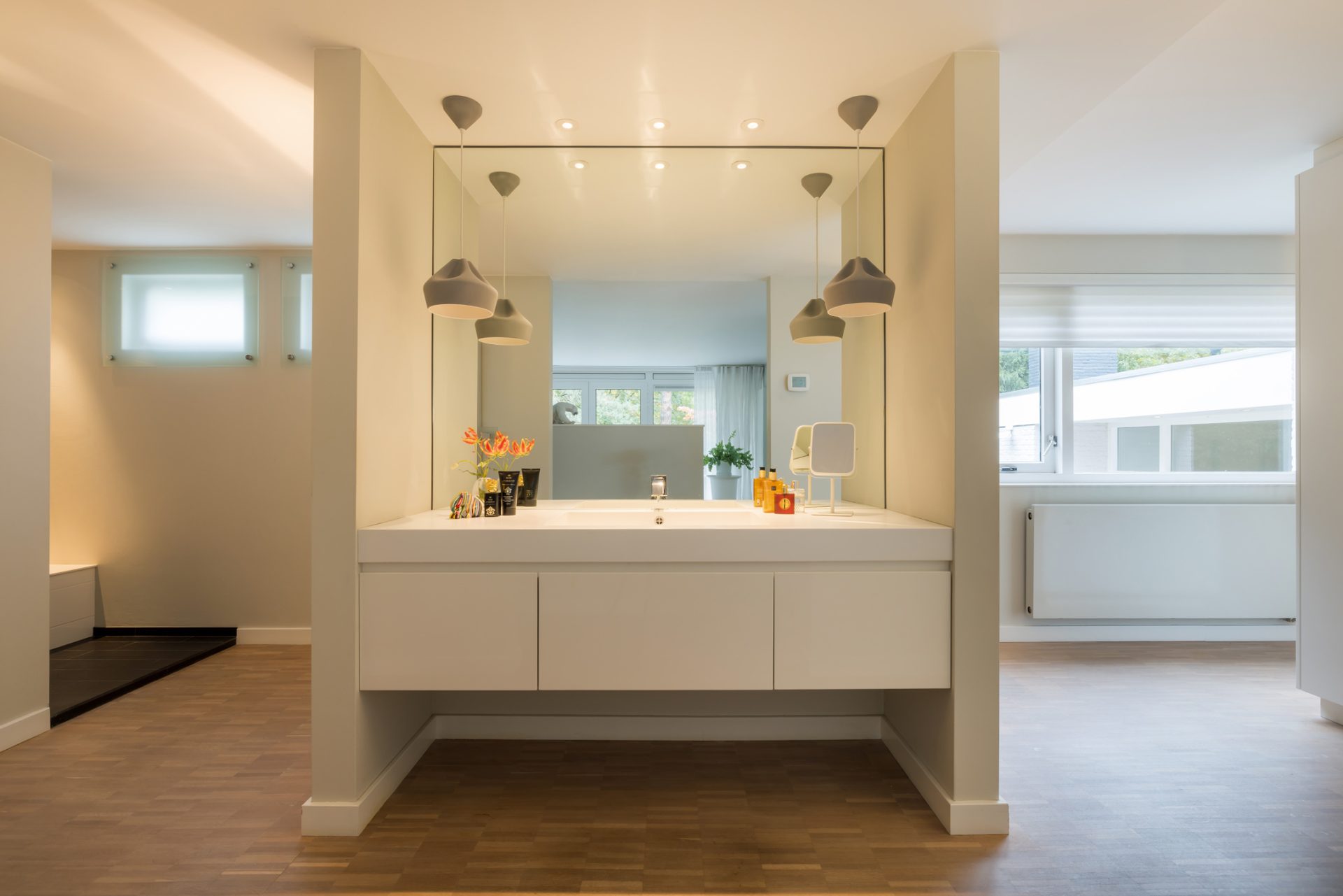 De badkamer bij de master bedroom is heel ruimtelijk ingedeeld met een grote inloopdouche, een toiletgelegenheid en een maatwerk badmeubel. In de tweede badkamer is de ruimte ingedeeld met een douche, wastafelmeubel en een toilet.