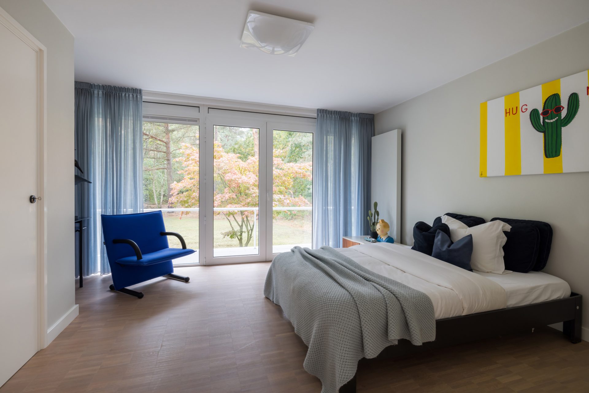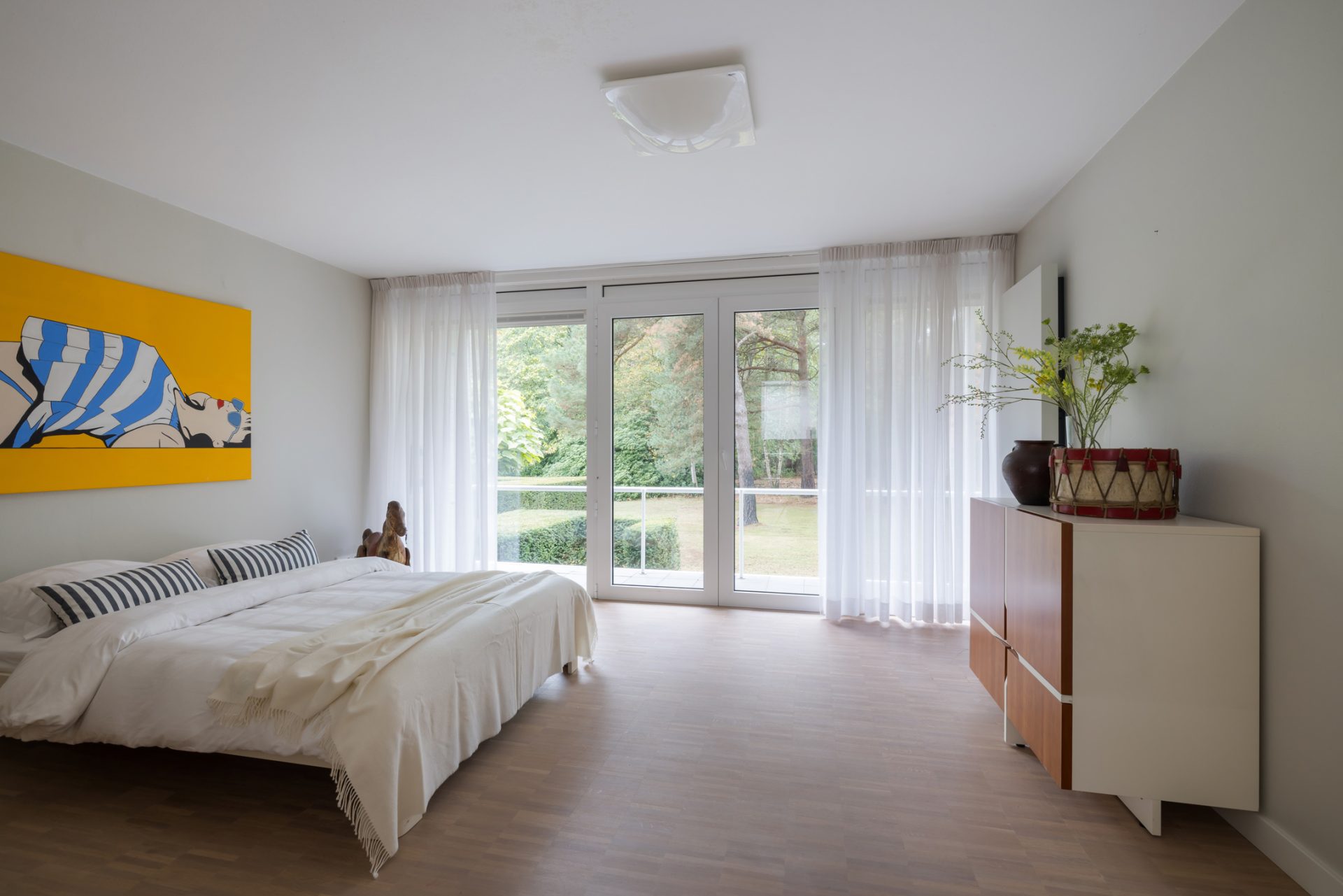Via de trap in de hal bereik je de overloop, met een grote ronde lichtkoepel in het dak. Vanaf hier zijn twee kinderkamers, een badkamer en de master bedroom met eigen badkamer en walk-in closet te bereiken. Alle slaapkamers grenzen aan het balkon en worden gekenmerkt door een aangename, rustige sfeer. Het uitzicht naar de tuin is vanuit elke kamer van ongekende schoonheid …