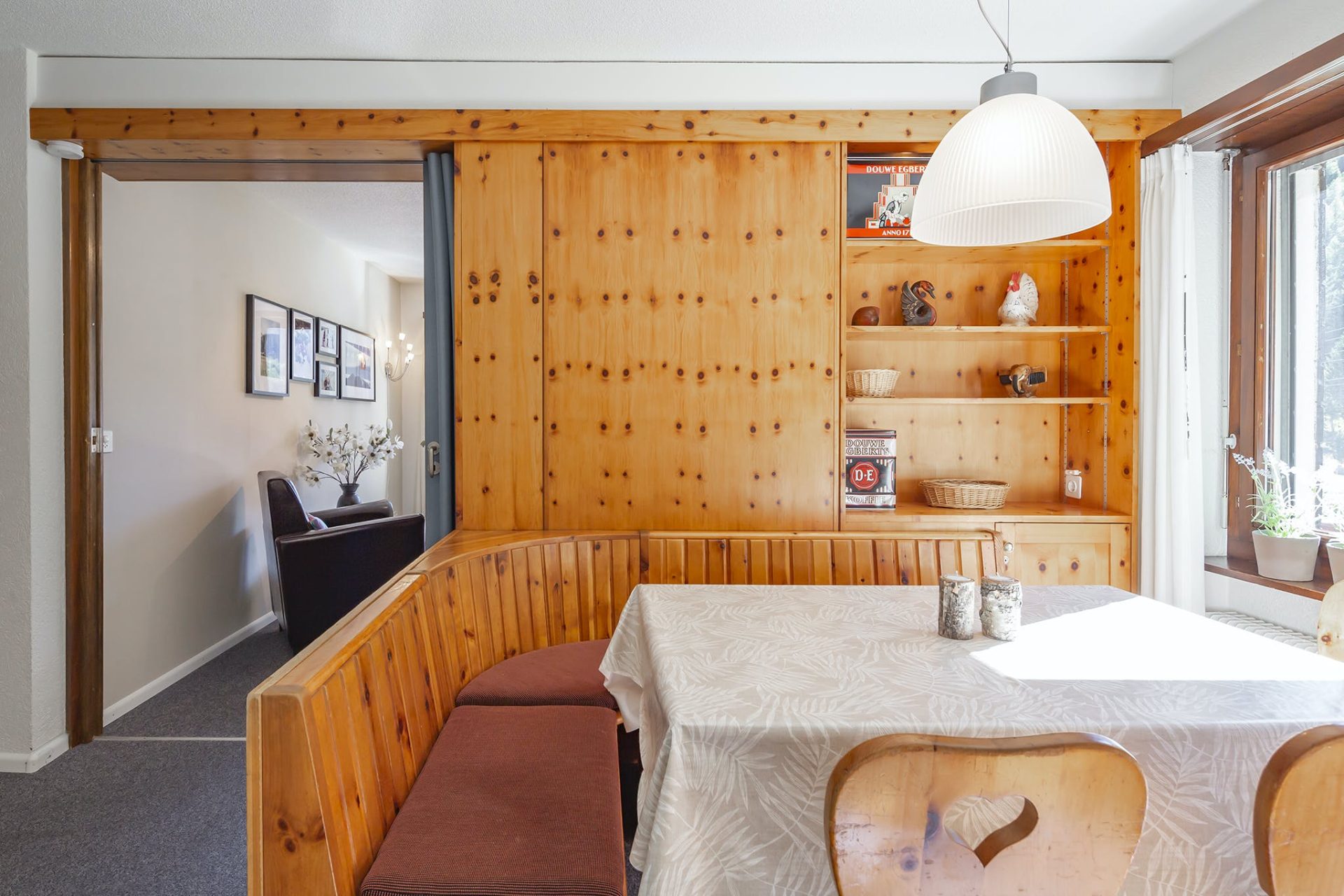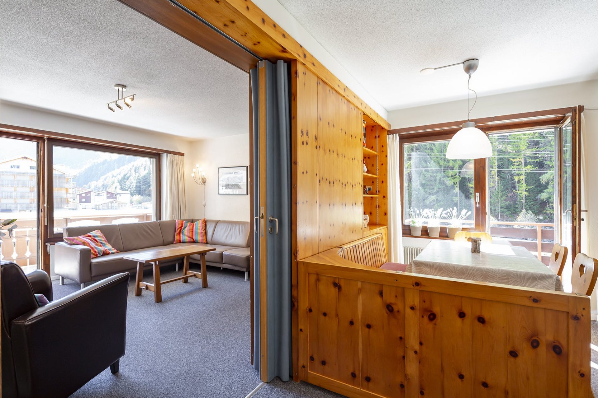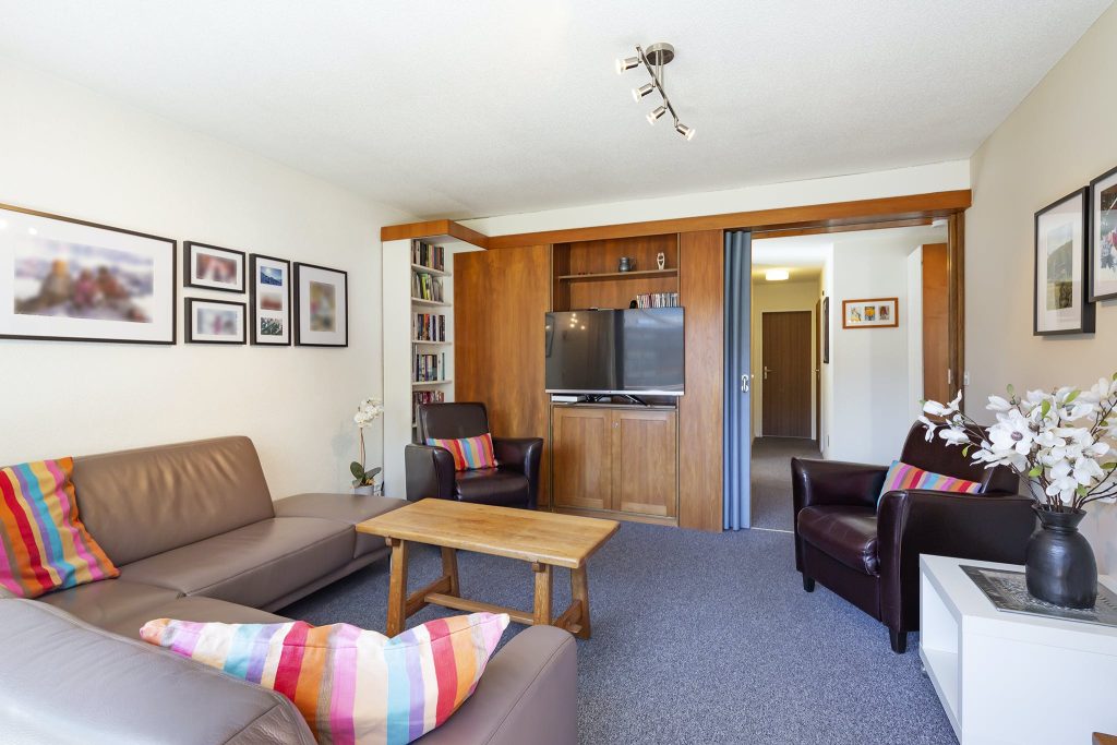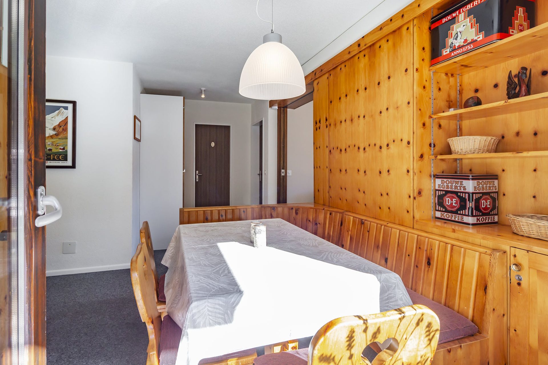 Woonkamer met ingebouwde kastenwand en toegang tot ruim balkon op het zuiden met prachtig vrij uitzicht op berglandschap. Separate eethoek annex half open keuken met eenvoudige keukenapparatuur. Twee ruime slaapkamers, beide met toegang tot balkon. Badkamer met ligbad, toilet en wastafel.