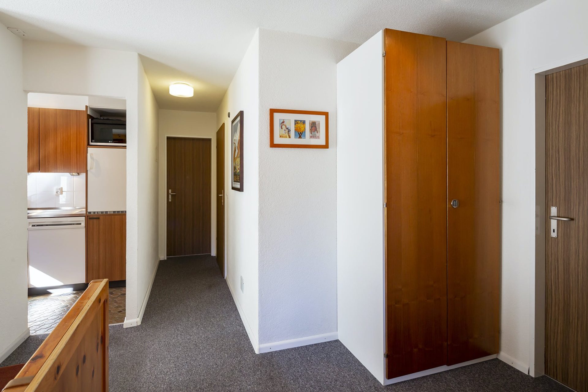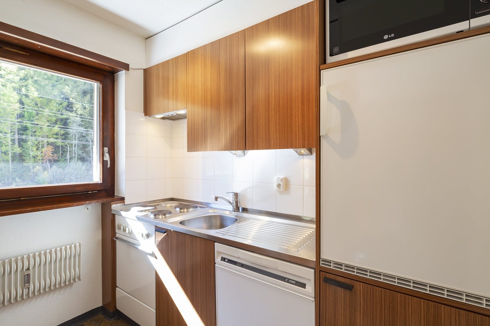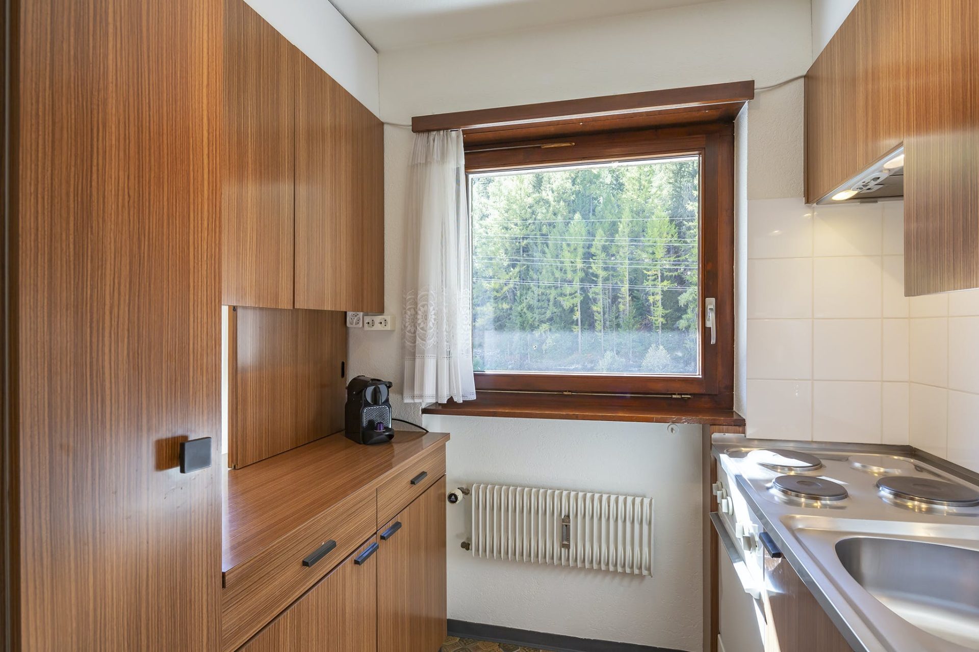 Woonkamer met ingebouwde kastenwand en toegang tot ruim balkon op het zuiden met prachtig vrij uitzicht op berglandschap. Separate eethoek annex half open keuken met eenvoudige keukenapparatuur. Twee ruime slaapkamers, beide met toegang tot balkon. Badkamer met ligbad, toilet en wastafel.