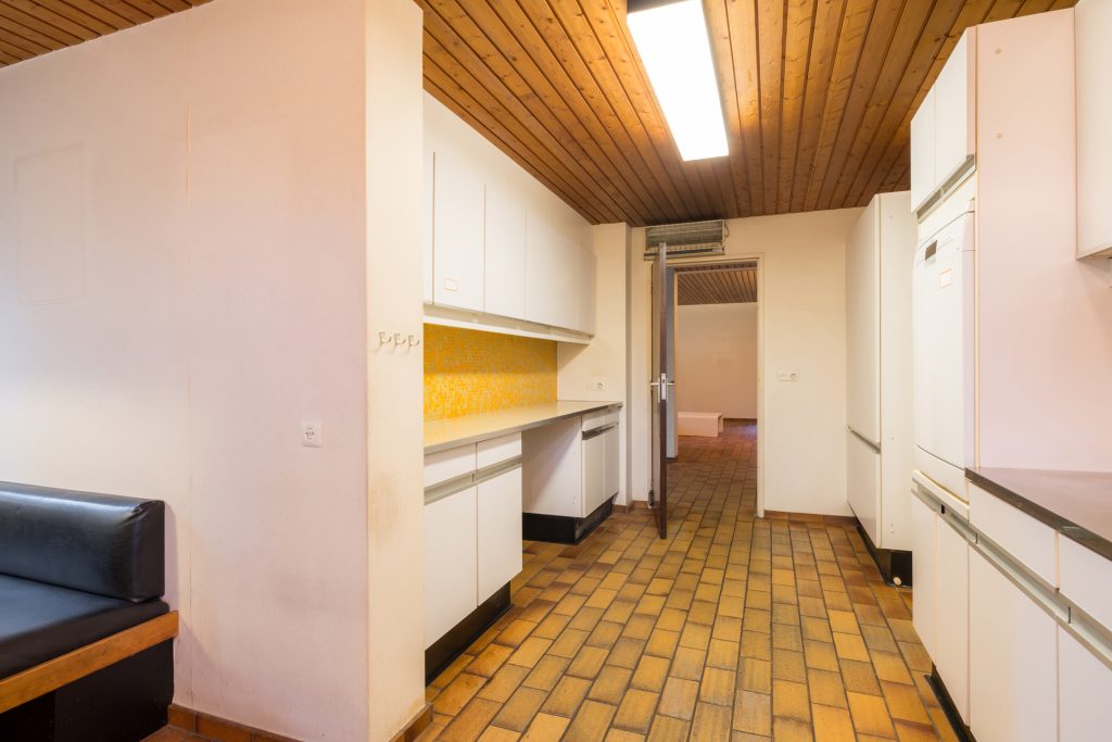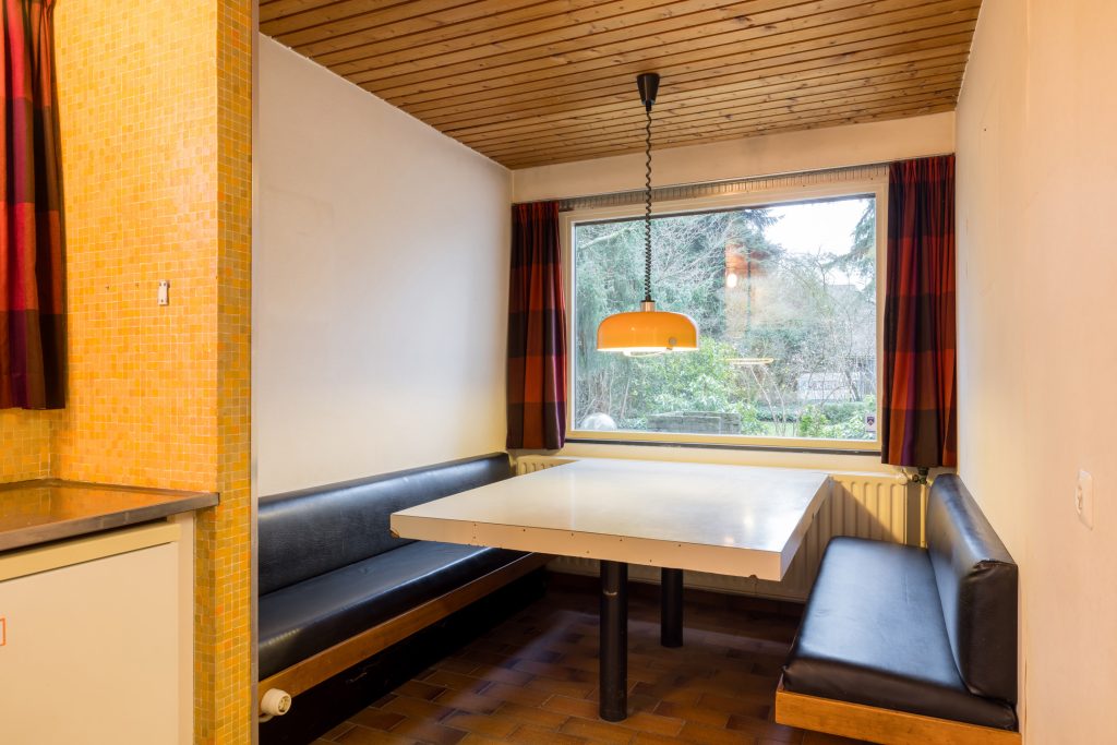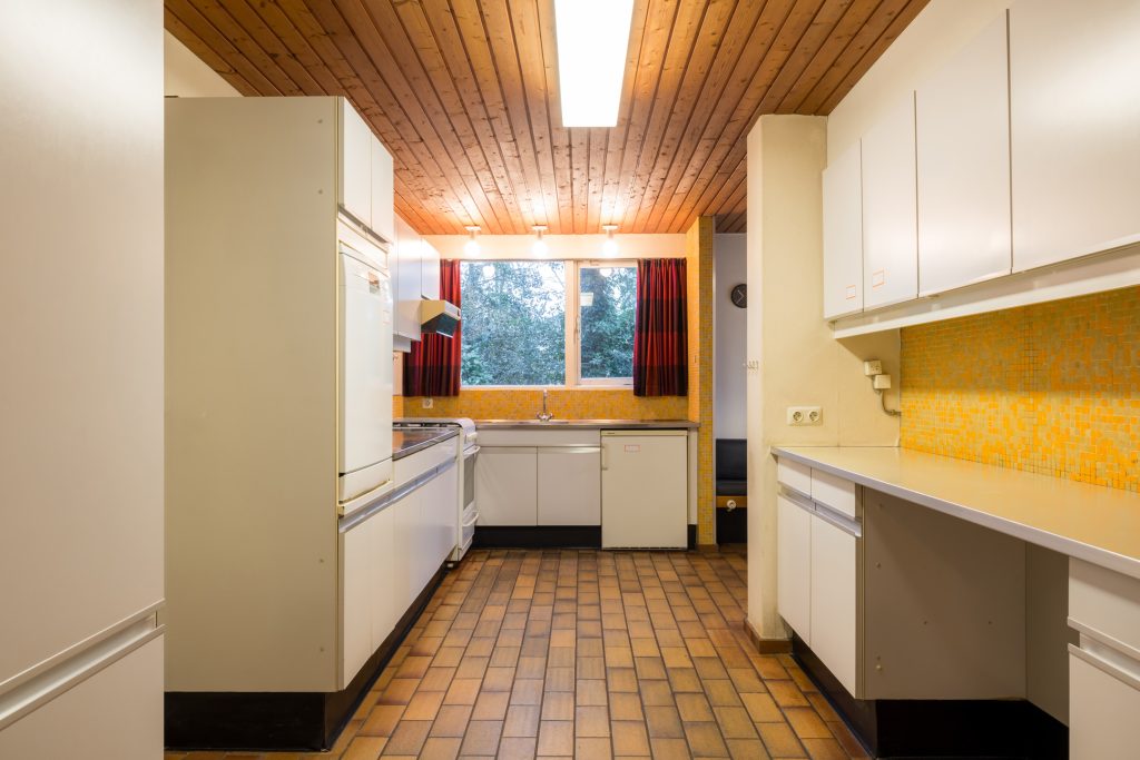 In de L-vormige keuken is er ruime eethoek om te ontbijten of huiswerk te maken tijdens het koken. De keukenopstelling met losse apparatuur dateert uit 1969 en is toe aan vernieuwing. Naast de keuken is er de royale bijkeuken met vaste kasten en een deur naar buiten, de achterom.