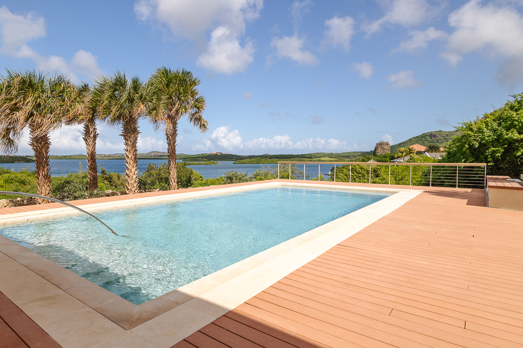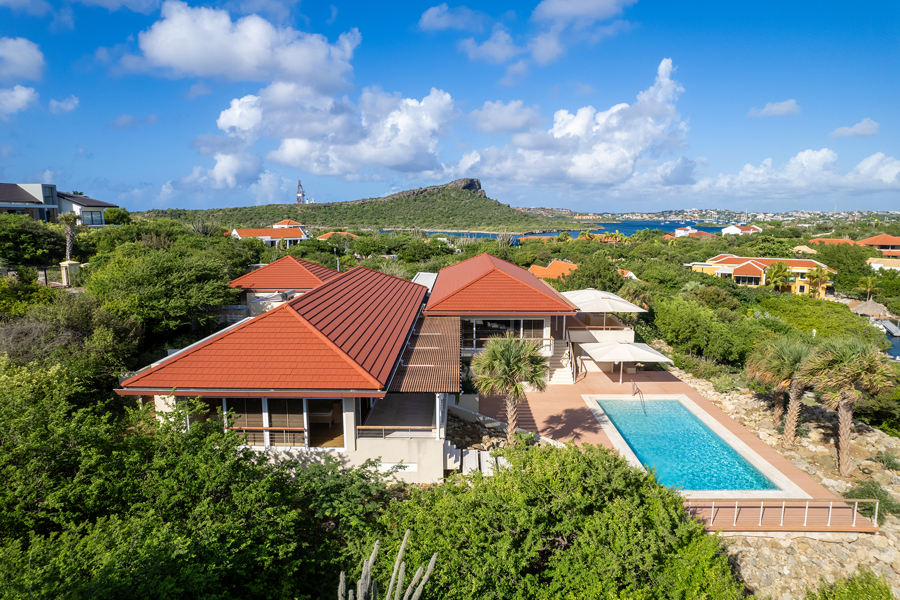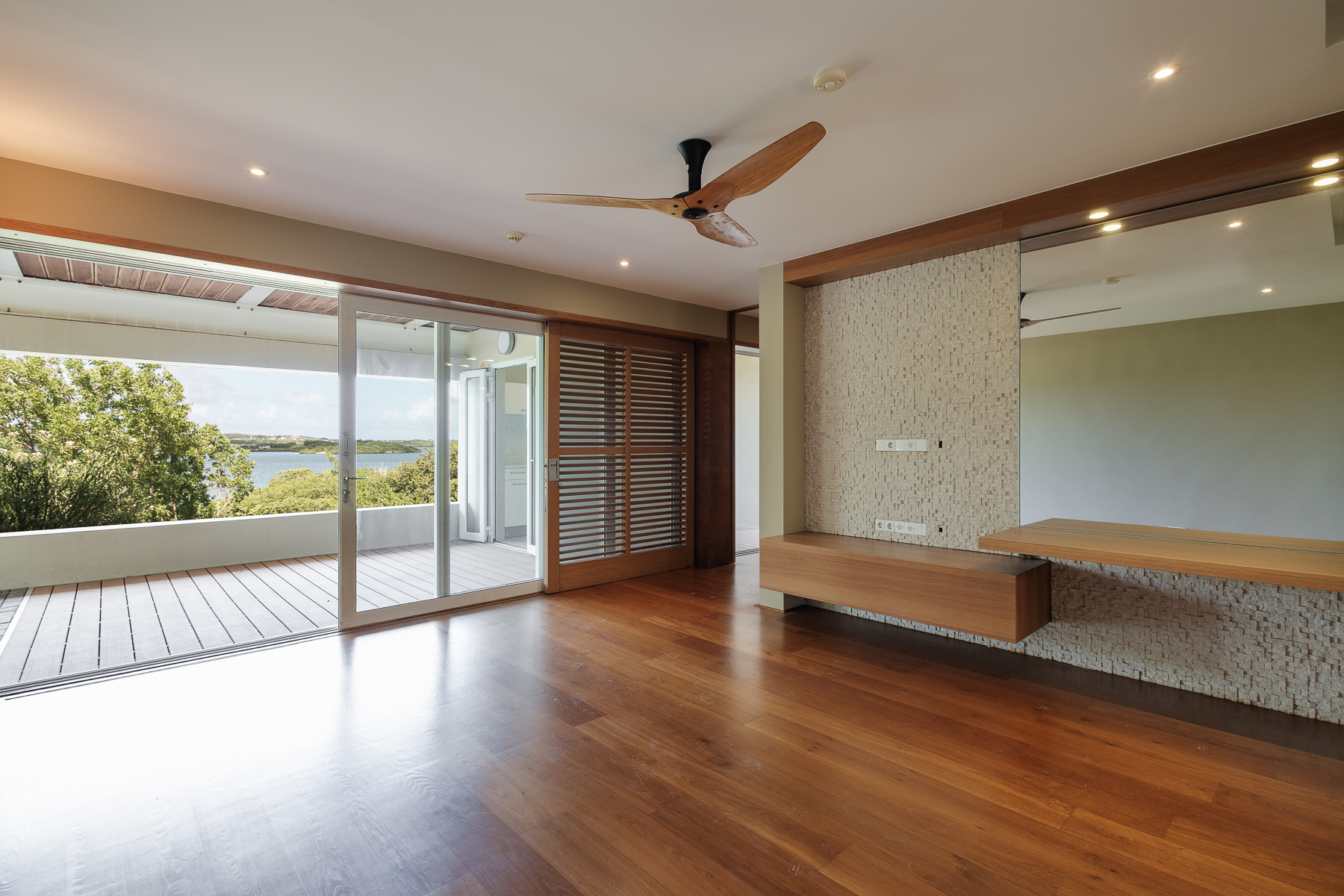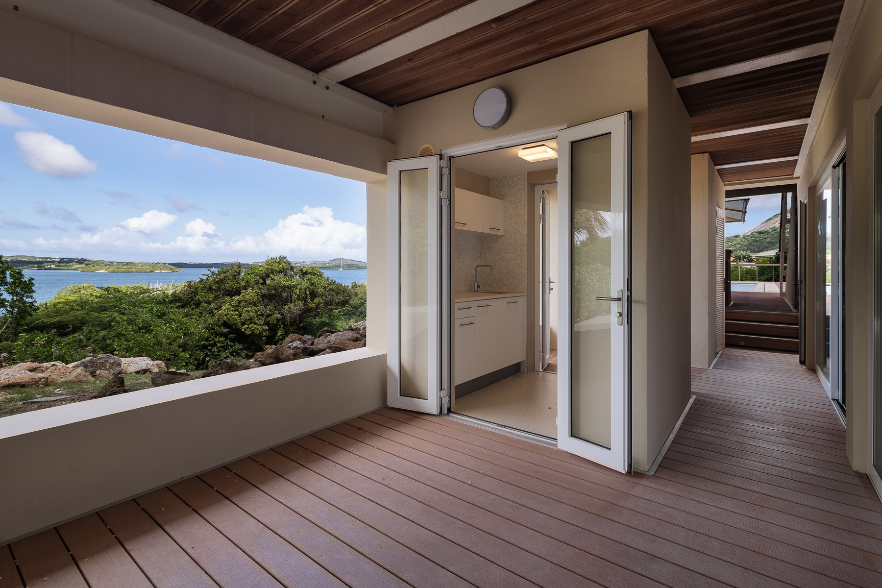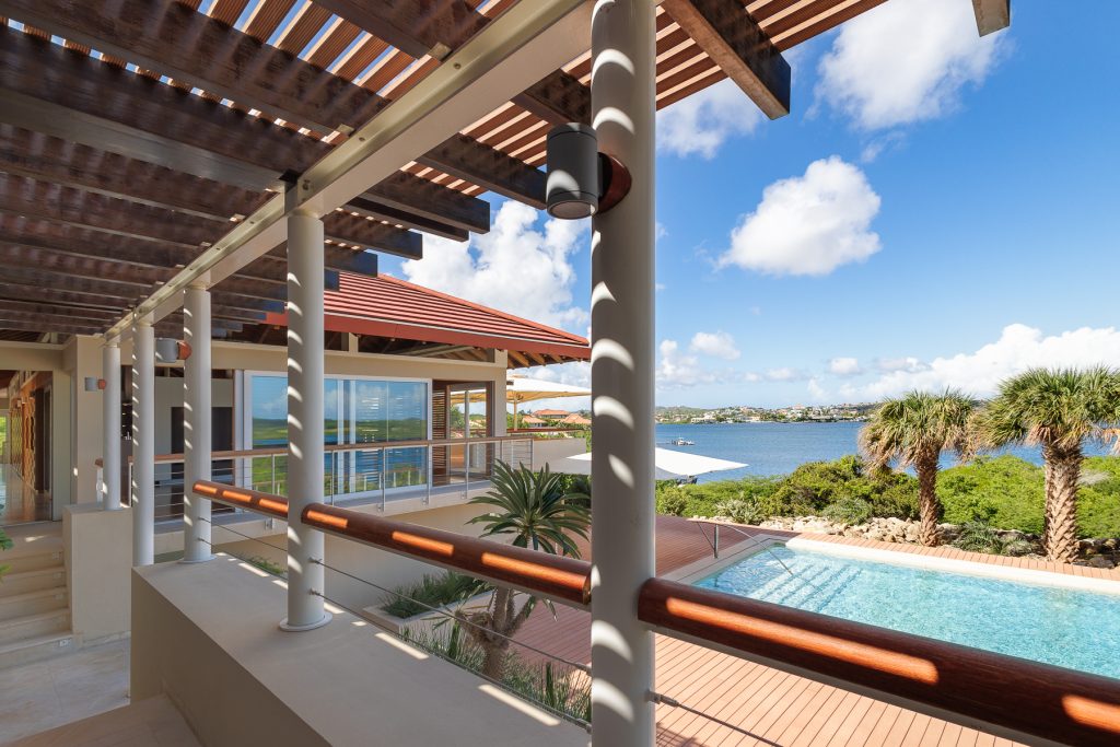Buiten ligt een ingebouwd zwembad met composiet vlonders, een loungegedeelte en een bar, omgeven door een tropische tuin die de perfecte setting biedt voor entertainment of ontspanning. Via een trap kom je op het bovenste terras, dat een adembenemend uitzicht biedt op de Spaanse Water Baai. Het terras is overdekt met een roodcederen pergola en wordt omringd door een tuin. Vanaf het terras zijn de master suite en de andere slaapkamers bereikbaar. De master suite straalt een rustige en serene sfeer uit, met een naadloze overgang tussen binnen en buiten. De master suite beschikt over een dressoir, kledingkast, een verhoogde televisie en een ruime privébadkamer met een vierkant ligbad, dubbele wastafel en toilet, aangevuld met een inloopkast. De twee andere slaapkamers zijn identiek en bieden alle comfort die nodig is om je thuis te voelen, met ruime kastruimte, een bureau en een eigen badkamer.