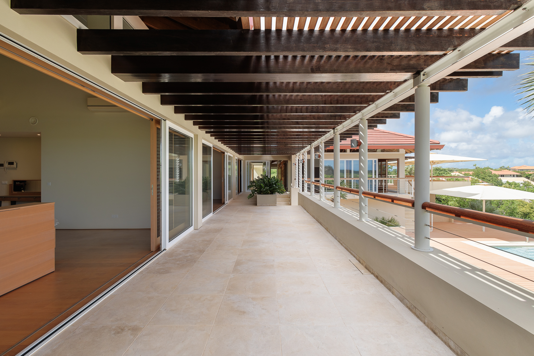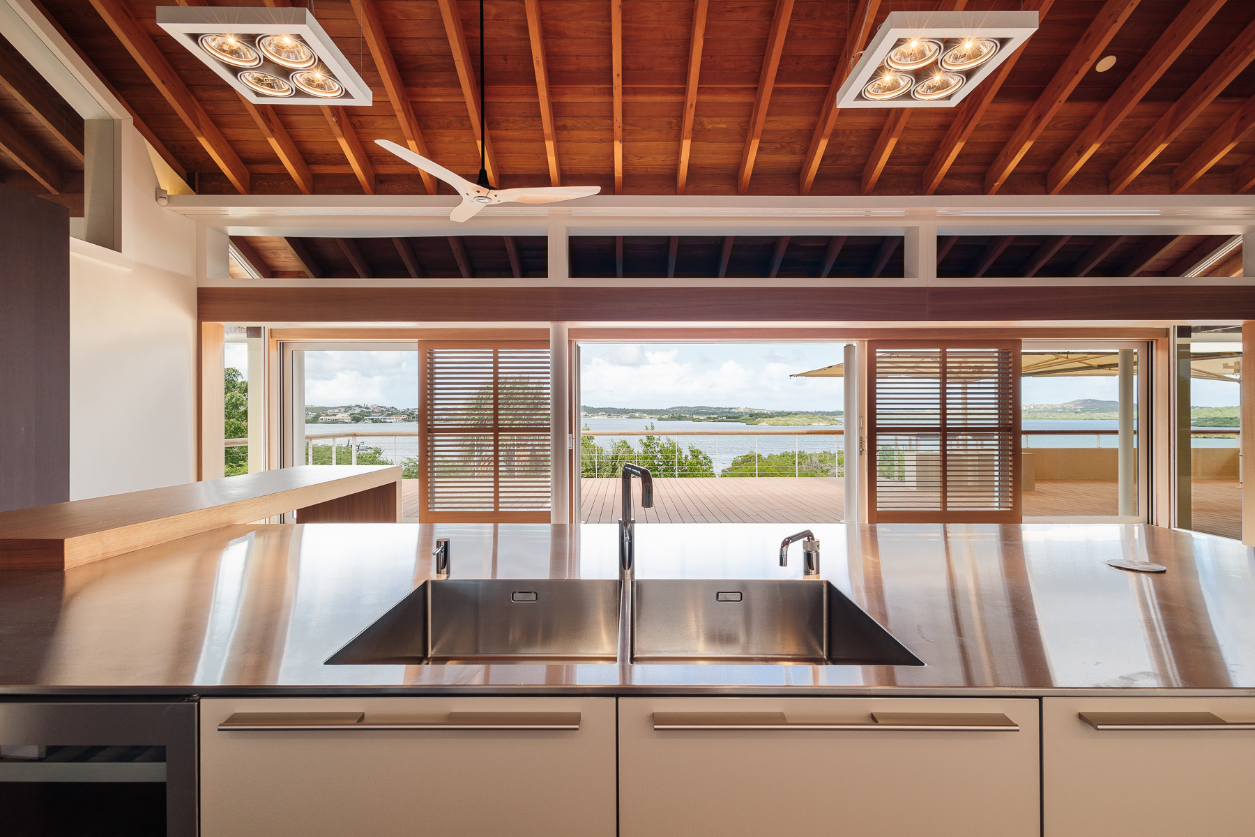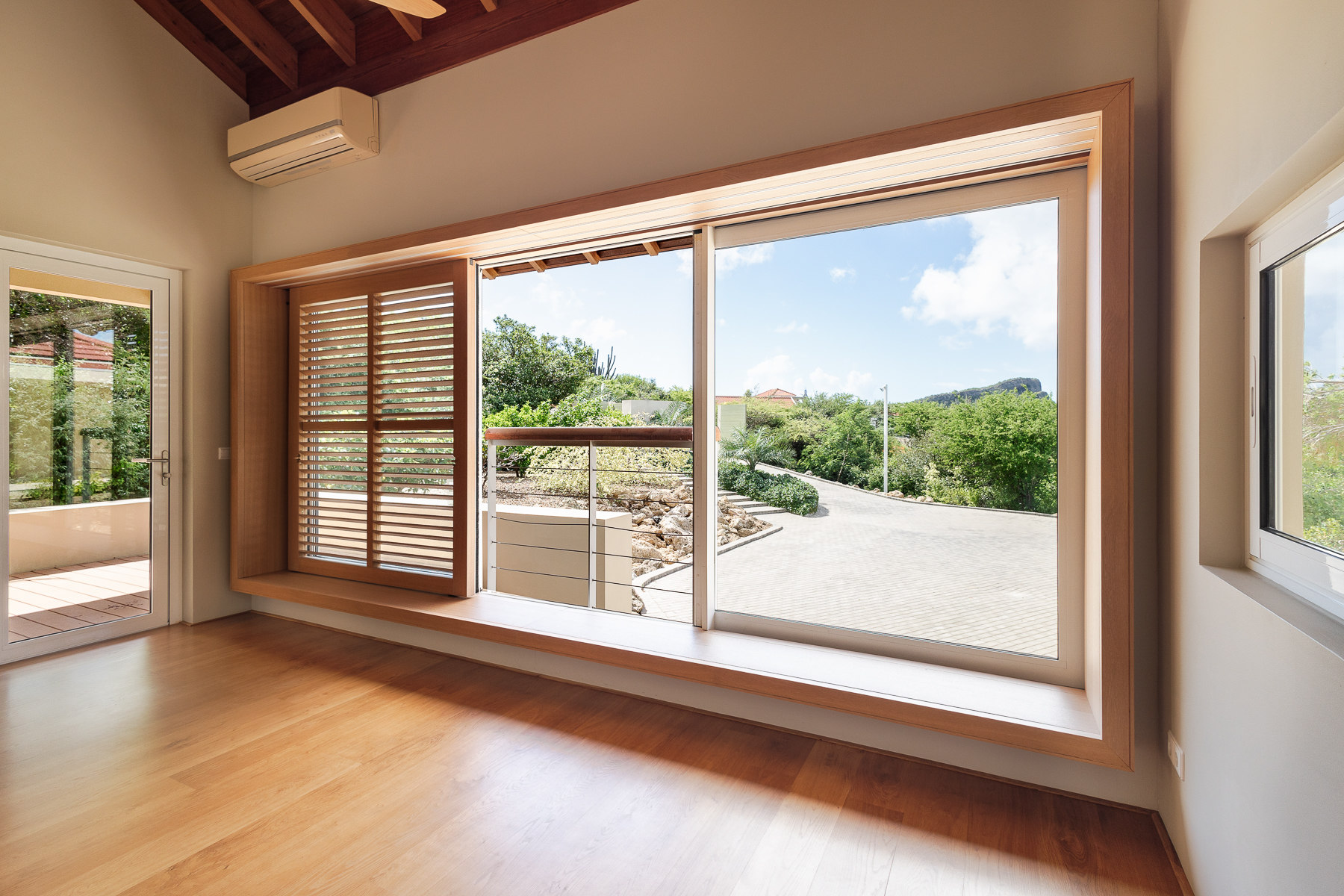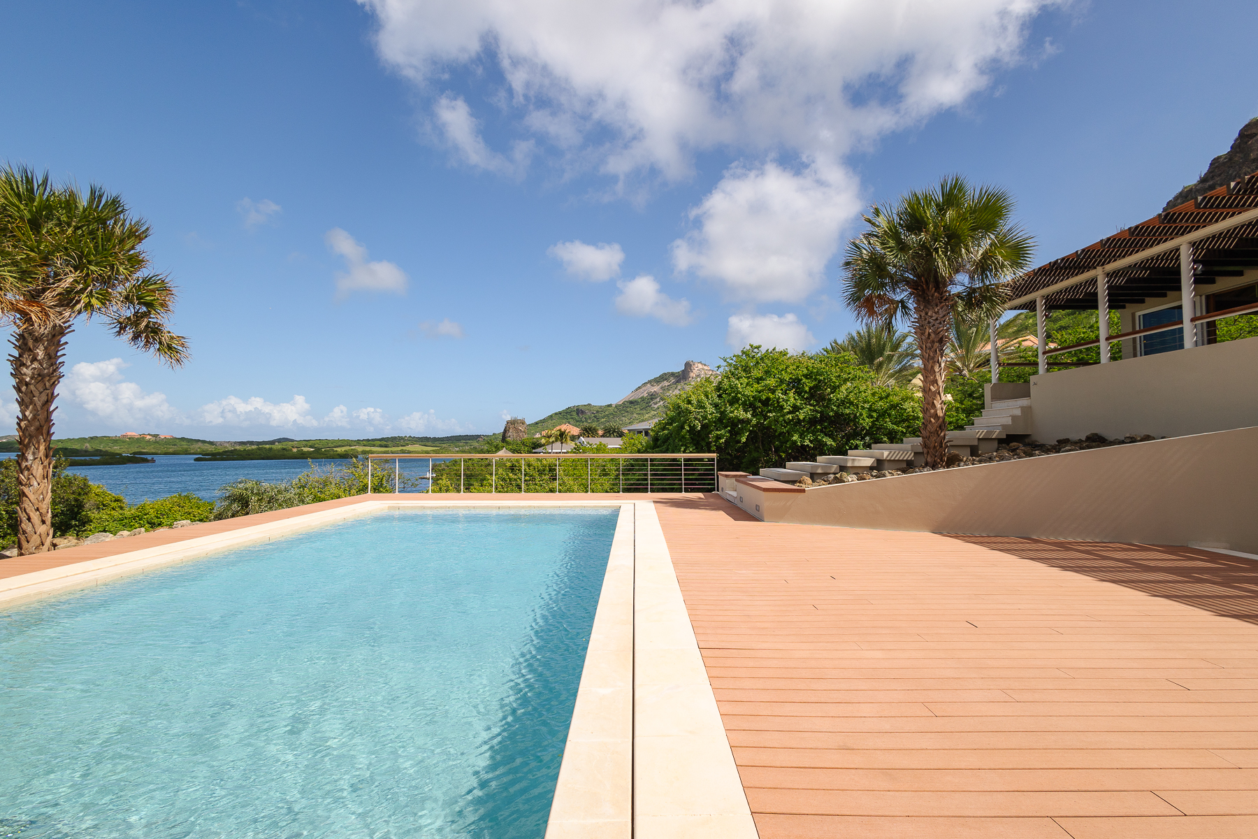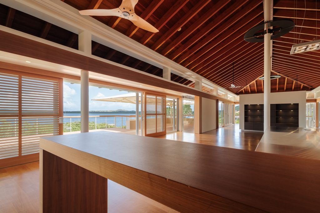Buiten ligt een ingebouwd zwembad met composiet vlonders, een loungegedeelte en een bar, omgeven door een tropische tuin die de perfecte setting biedt voor entertainment of ontspanning. Via een trap kom je op het bovenste terras, dat een adembenemend uitzicht biedt op de Spaanse Water Baai. Het terras is overdekt met een roodcederen pergola en wordt omringd door een tuin. Vanaf het terras zijn de master suite en de andere slaapkamers bereikbaar. De master suite straalt een rustige en serene sfeer uit, met een naadloze overgang tussen binnen en buiten. De master suite beschikt over een dressoir, kledingkast, een verhoogde televisie en een ruime privébadkamer met een vierkant ligbad, dubbele wastafel en toilet, aangevuld met een inloopkast. De twee andere slaapkamers zijn identiek en bieden alle comfort die nodig is om je thuis te voelen, met ruime kastruimte, een bureau en een eigen badkamer.