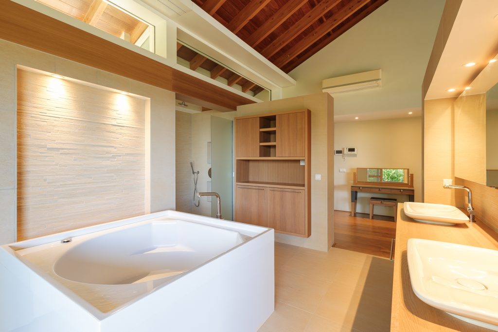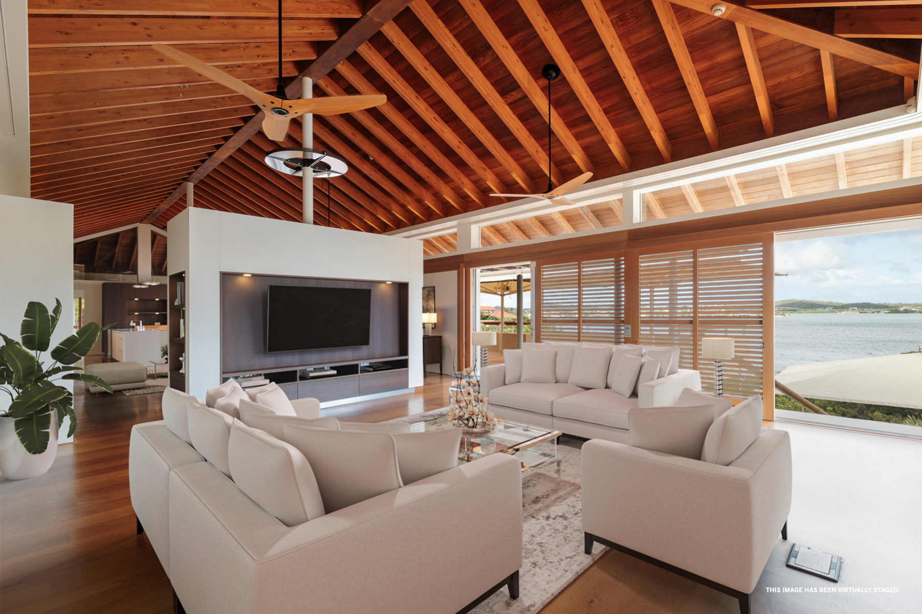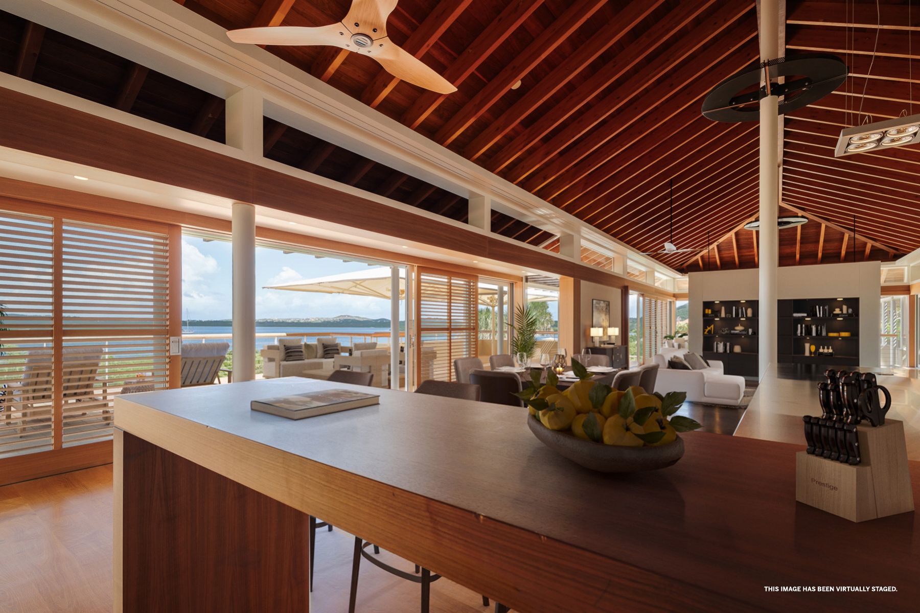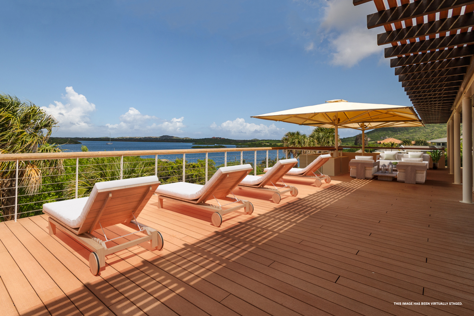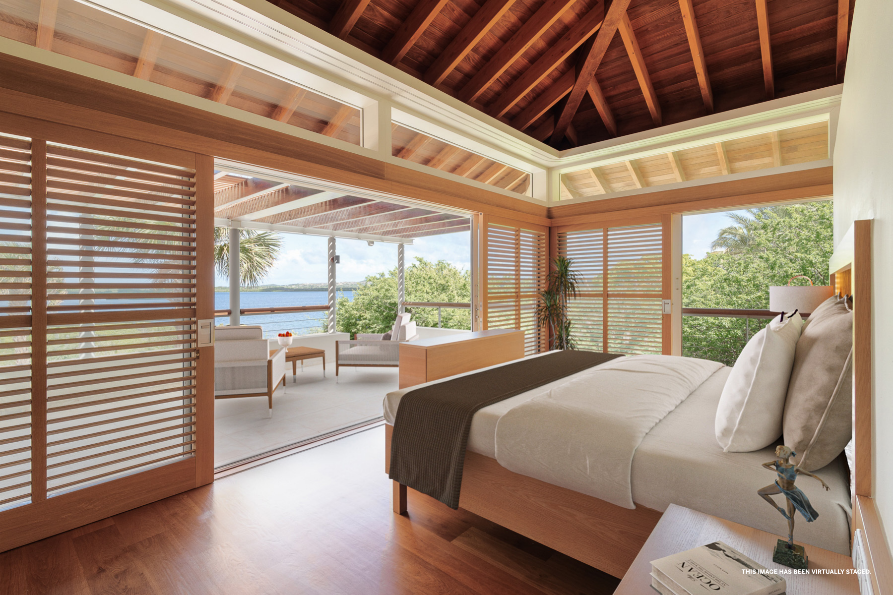Buiten ligt een ingebouwd zwembad met composiet vlonders, een loungegedeelte en een bar, omgeven door een tropische tuin die de perfecte setting biedt voor entertainment of ontspanning. Via een trap kom je op het bovenste terras, dat een adembenemend uitzicht biedt op de Spaanse Water Baai. Het terras is overdekt met een roodcederen pergola en wordt omringd door een tuin. Vanaf het terras zijn de master suite en de andere slaapkamers bereikbaar. De master suite straalt een rustige en serene sfeer uit, met een naadloze overgang tussen binnen en buiten. De master suite beschikt over een dressoir, kledingkast, een verhoogde televisie en een ruime privébadkamer met een vierkant ligbad, dubbele wastafel en toilet, aangevuld met een inloopkast. De twee andere slaapkamers zijn identiek en bieden alle comfort die nodig is om je thuis te voelen, met ruime kastruimte, een bureau en een eigen badkamer.