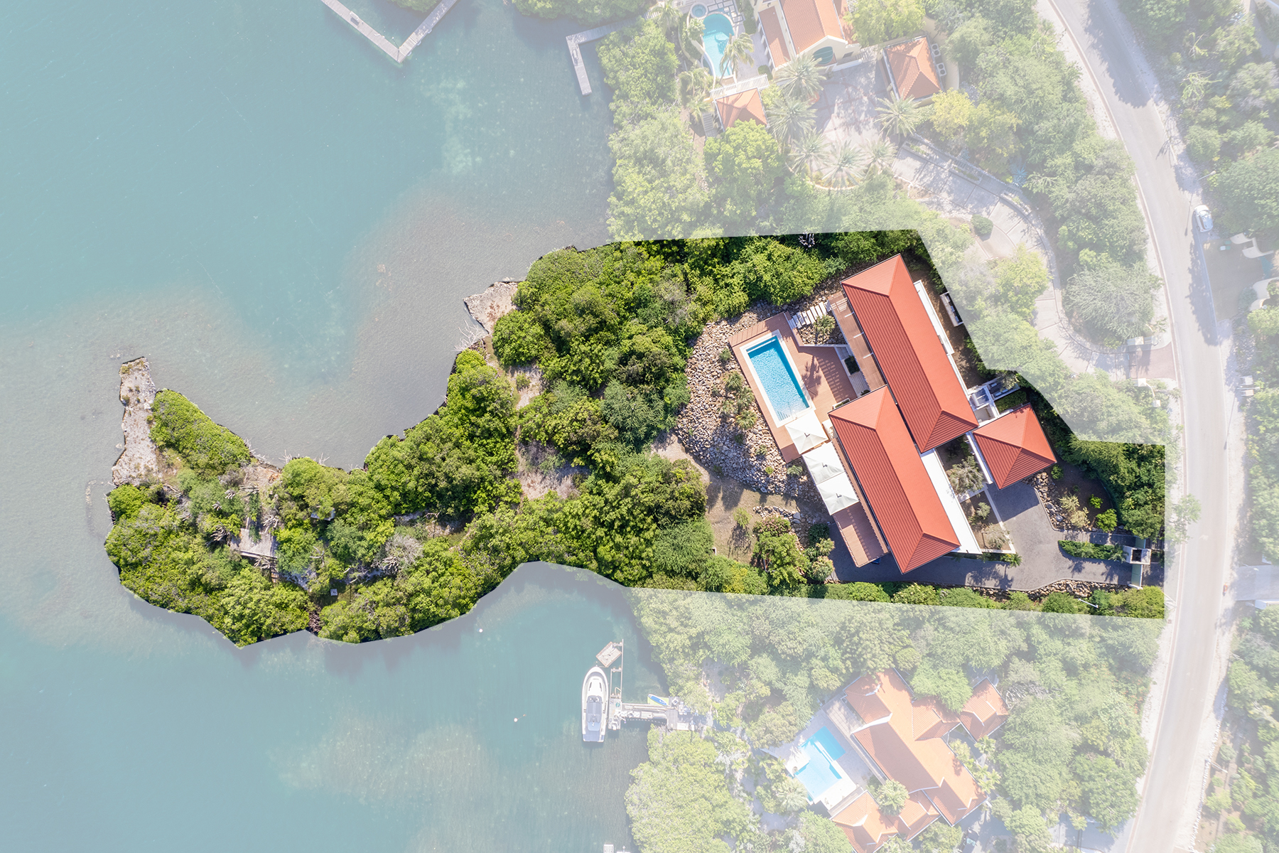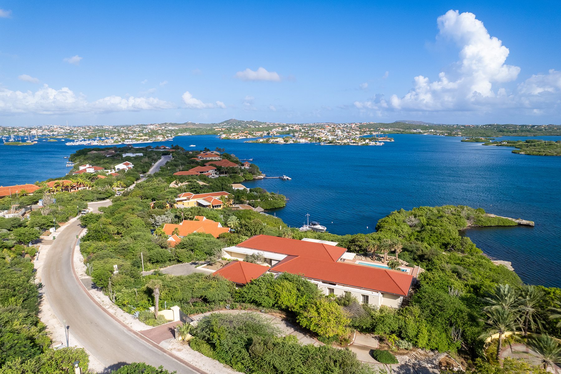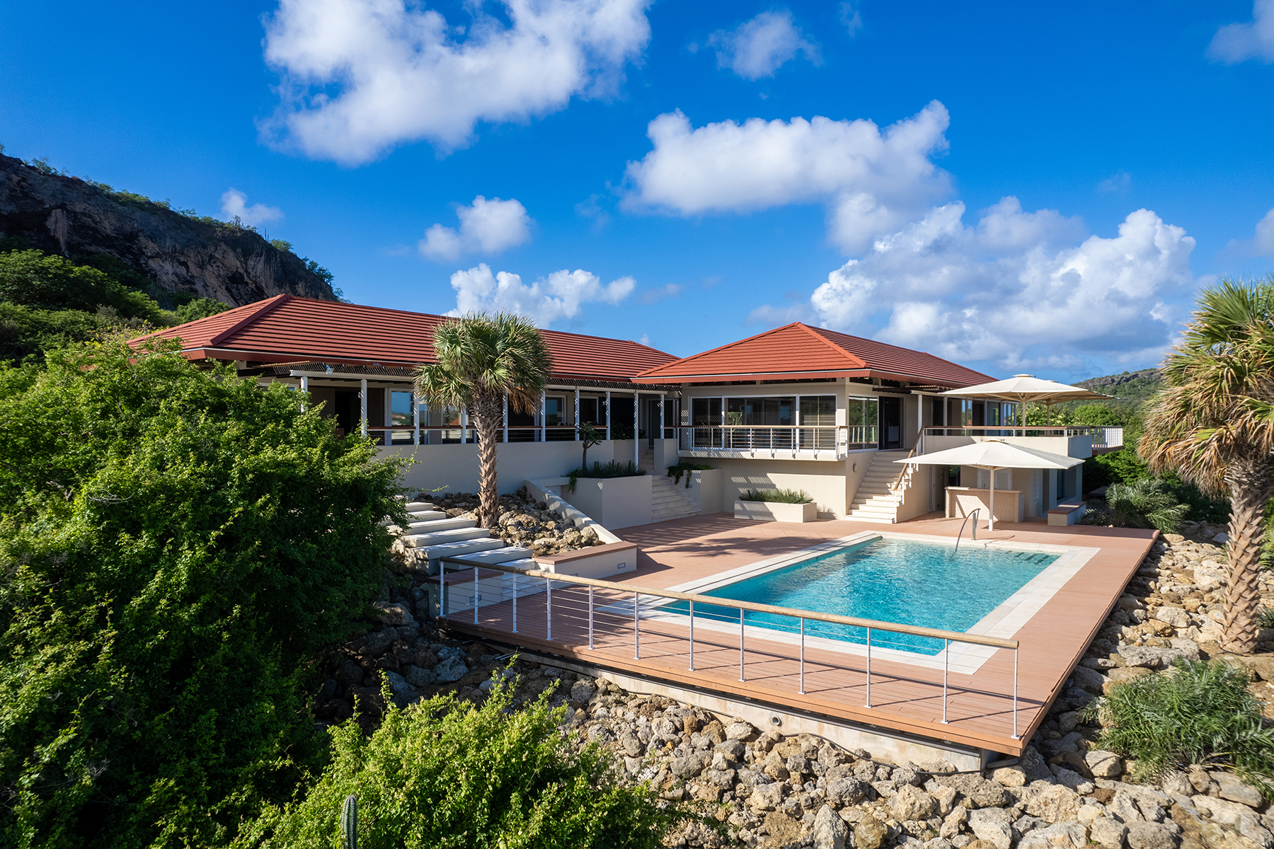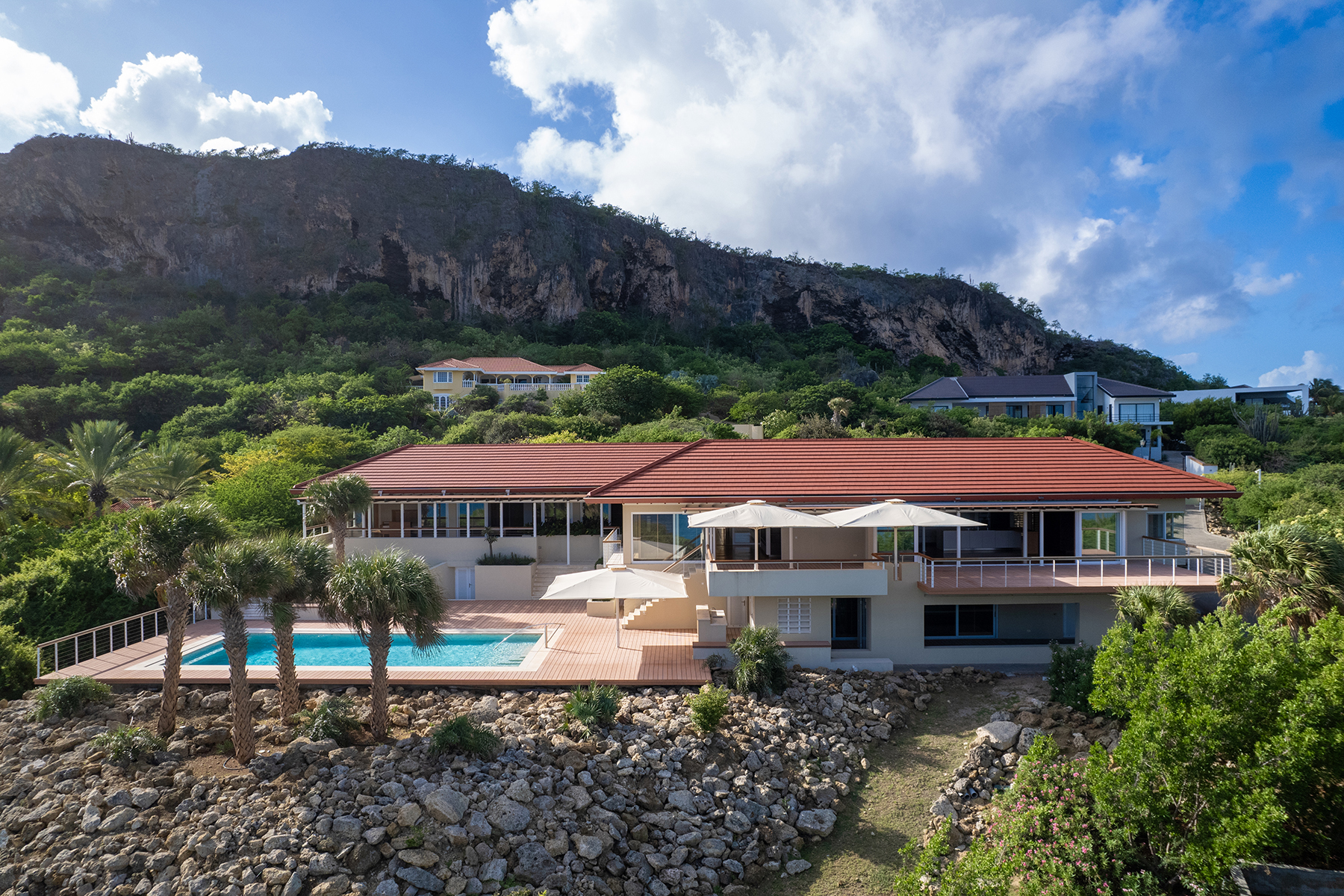 Deze indrukwekkende villa beslaat ongeveer 920 m² en beschikt over 6 slaapkamers en 7,5 badkamers. Gelegen op een perceel van 6.850 m² met een schiereiland, is dit een opvallende en unieke woning in Seru Boca Estate. De villa is verdeeld over twee verdiepingen en heeft een garage voor twee auto’s en extra parkeergelegenheid. Het hele jaar door geniet de villa van aangename passaatwinden, wat zorgt voor een perfecte balans tussen luxe en natuur. Alle belangrijkste leefruimtes bevinden zich op één verdieping, waardoor de villa eenvoudig te bewonen is.