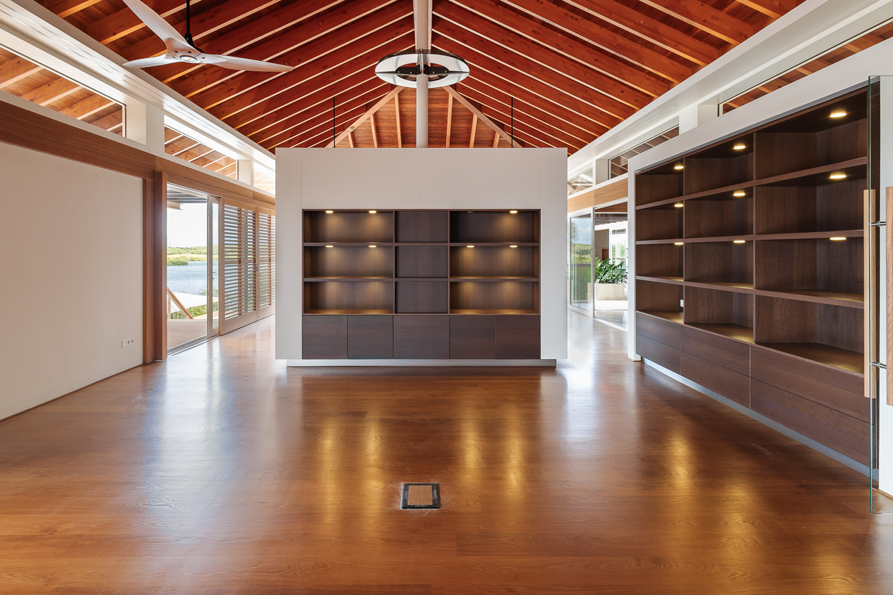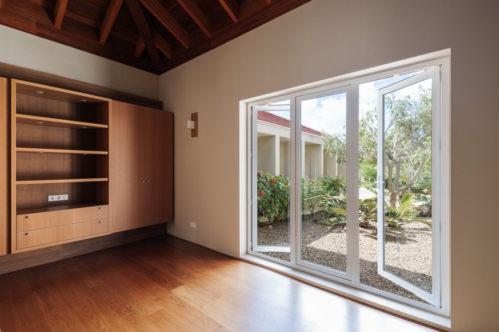 Verderop in de gang bevindt zich een kantoorruimte met een groot bureau, veel kastruimte, een uitklapbaar bed en een eigen complete badkamer, waardoor deze ruimte ook als gastenkamer kan worden gebruikt. Het kantoor biedt een inspirerend uitzicht over de Spaanse Water Baai. Via een interne trap is het lagere niveau bereikbaar, waar zich de garage, generator, een extra gastenkamer, fitnessruimte, opslagruimte en nutsvoorzieningen bevinden.