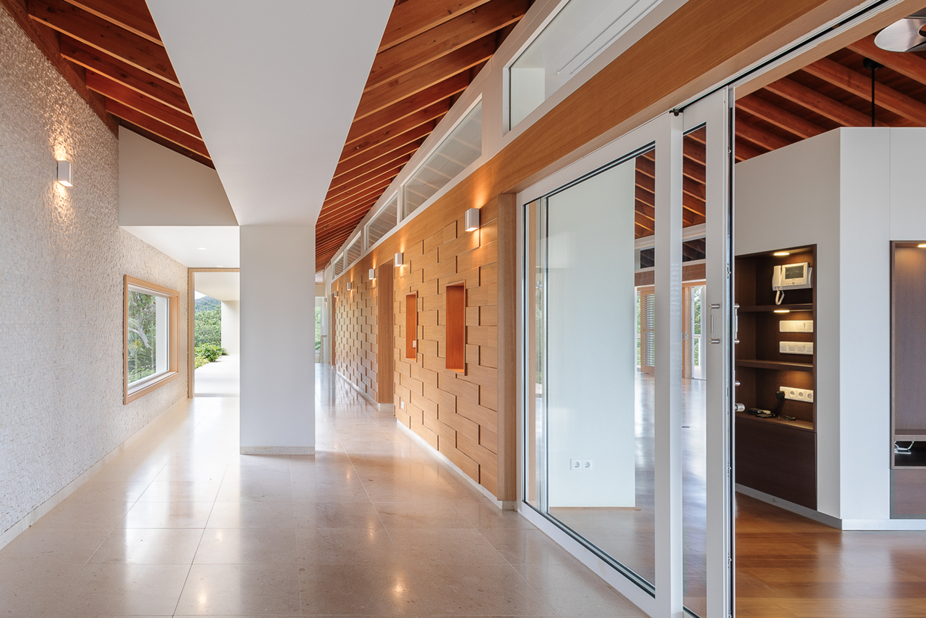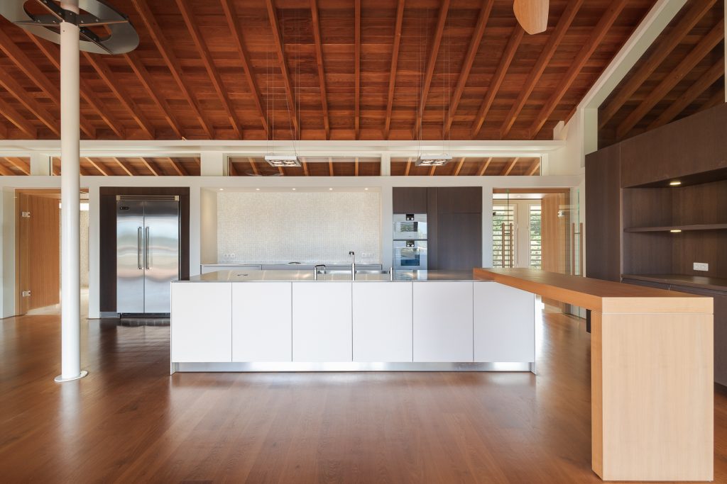 Bij binnenkomst ontvouwt de villa zich in al haar pracht. De vloeiende overgang van elke ruimte naar buiten wordt benadrukt door glazen schuifdeuren van vloer tot plafond. Aan de linkerzijde bevindt zich een luxueuze woonkamer met grote ramen. Verderop ligt een royale Bulthaup-keuken met kookeiland, Gaggenau (combi-)ovens, een Bora-inductiekookplaat en Viking-koelkast. Het moderne kookeiland, voorzien van alle benodigde apparatuur, heeft ook een uitbreiding die dienst kan doen als ontbijttafel. Een ingebouwde Otis-lift biedt een praktische oplossing om boodschappen direct van de garage naar de keuken te brengen. Alle inbouwmeubelen zijn op maat ontworpen door Kletzenbauer. Grenzend aan de keuken bevindt zich een ruim buitenterras met panoramisch uitzicht op de Spaanse Wateren.