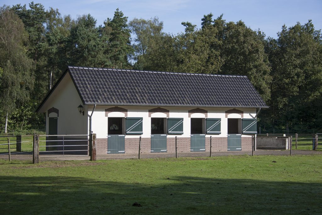 Vanaf het grote terras bij de tuinkamer zie je, tussen de bomen door, de paardenstallen staan. Ook in deze stallen is de charme van het landhuis en de garage terug te zien: de gevels zijn deels gepleisterd en in een witte kleur geschilderd, de staldeuren zijn donkergroen en op het dak liggen zwarten pannen. Er zijn vier paardenboxen, een zadelkamer en een lange gang met een eigen entree. In de nok van de paardenstallen is een grote ruimte om hooi op te slaan.