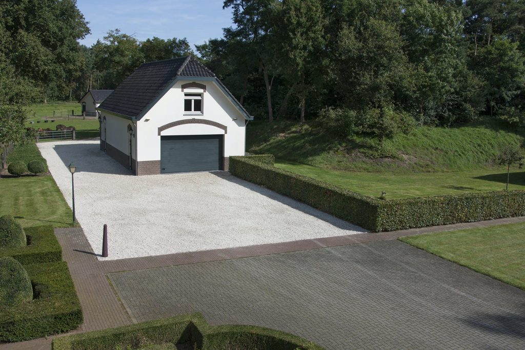 Naast het landhuis staat een grote nieuwe garage die geheel in de stijl van het landhuis is opgebouwd met een totale vloeroppervlakte van meer dan 90 m². De garage bestaat uit twee grote ruimtes elk met een brede garagedeur. Doordat de garage is gebouwd in dezelfde stijl als het landhuis vormt het een smaakvol geheel. In het achterste deel van de garage bevindt zich een vaste trap naar de verdieping die is ingericht als fitness- en bergruimte.
