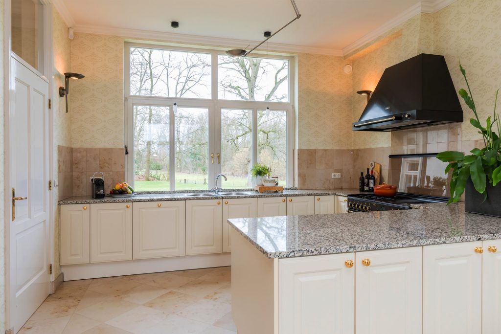 De grote woonkeuken heeft veel lichtinval door grote raampartijen. Een marmeren vloer en een fraaie keukenopstelling met alle benodigde inbouwapparatuur maakt dat de stijl is te omschrijven als chic en sfeervol en tegelijkertijd is er ook voldoende ruimte voor een grote eettafel voor het hele gezin. Vanuit deze woonkeuken is zowel de bijkeuken als de stijlvolle tuinkamer te bereiken. Deze tuinkamer is zodanig ingericht dat hij als extra zitkamer met rondom uitzicht over de tuin is te gebruiken.