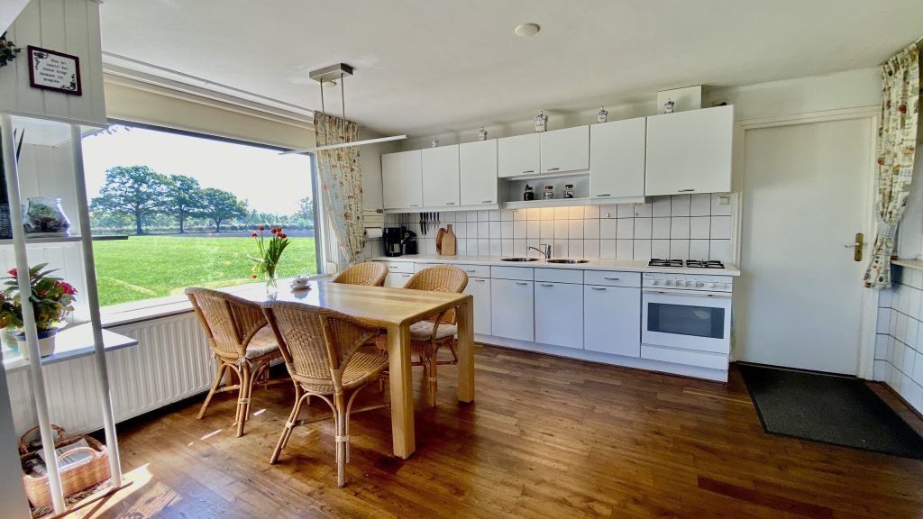 De keuken staat in directe verbinding met zowel de woonkamer als de bijkeuken. Tevens is een kelder te betreden vanuit de keuken, ideaal voor opslag van proviand. De keuken beschikt over grote raamkozijnen waardoor er ruim voldoende daglicht binnen kan treden maar men ook prachtig zicht heeft over de weilanden.