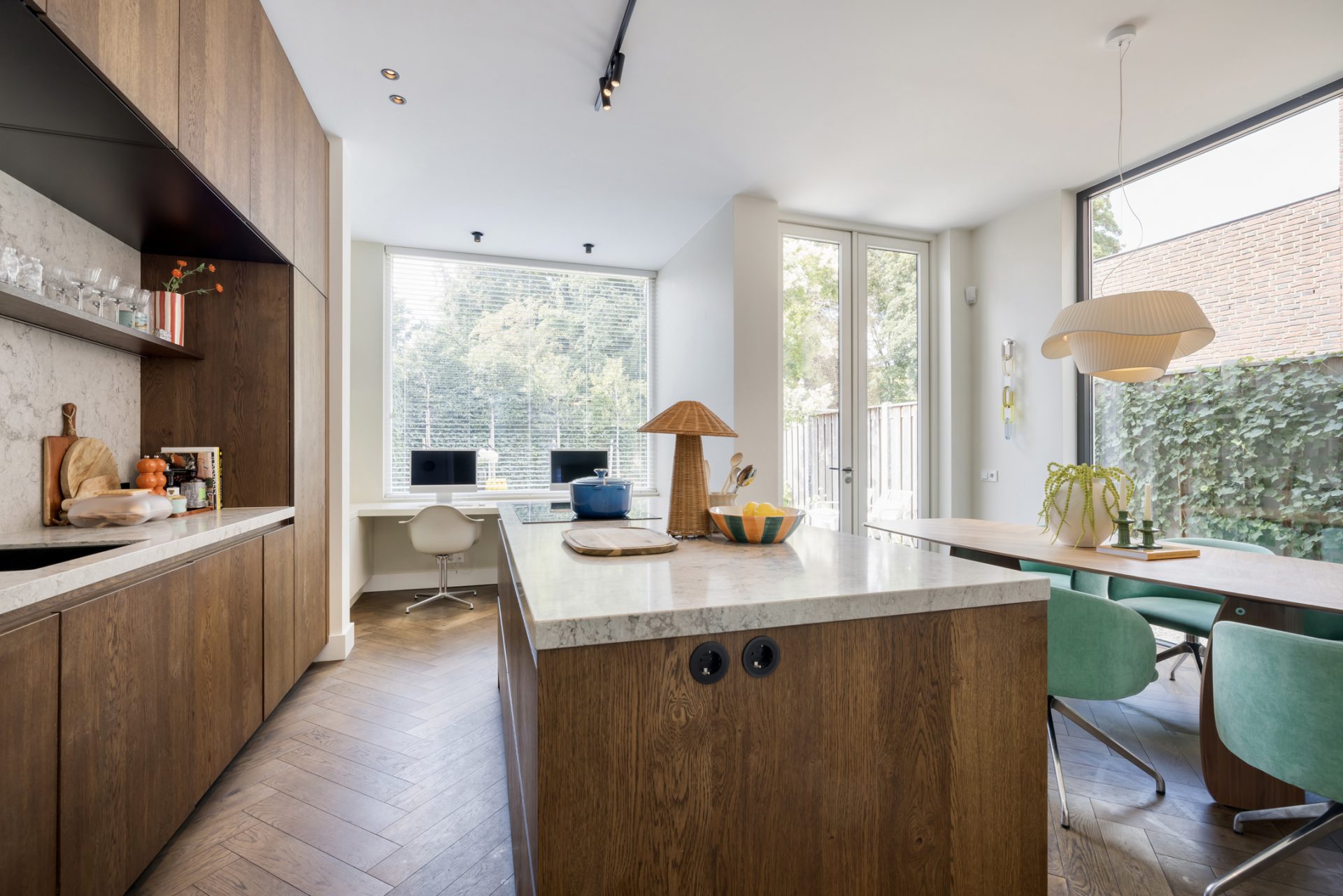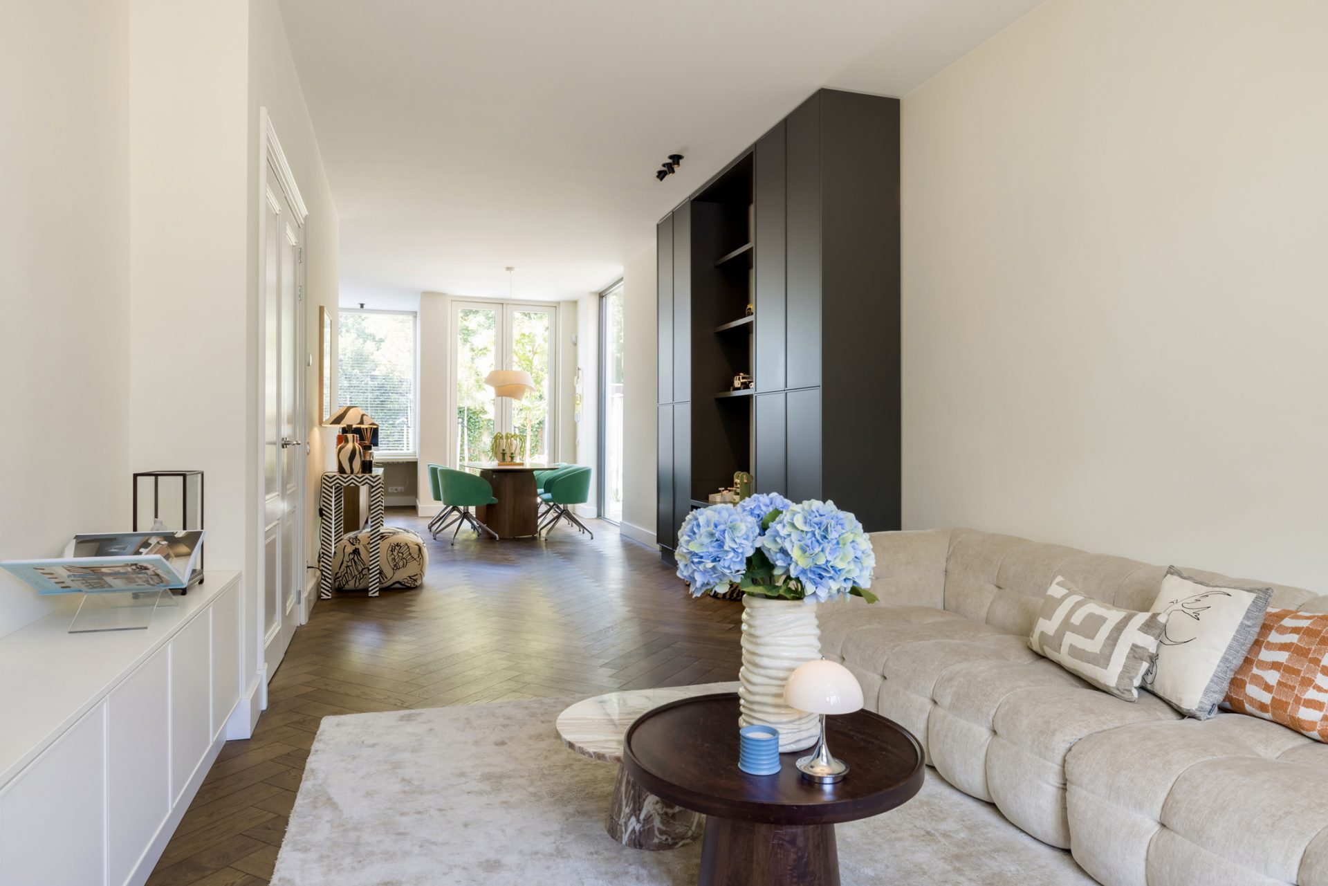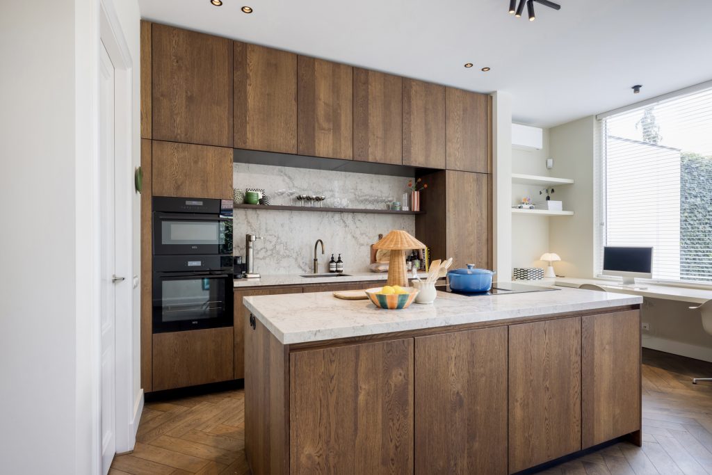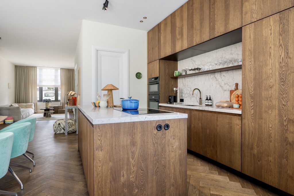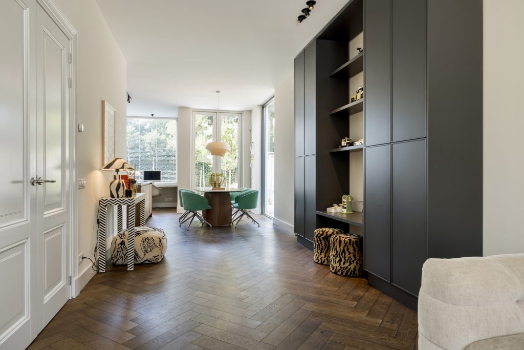 Twee paneeldeuren verbinden de hal met de woon-/eetkamer en keuken, waar de sfeer en stijl vanaf spatten. Opvallend zijn het circa 2.90 meter hoge plafond en de grote ramen, die het ruimtelijke gevoel versterken. Het zitgedeelte, met een maatwerk tv-dressoir, is aan de voorzijde en de donkere maatwerk kastenwand is de perfecte speelplek voor kinderen. Aan de tuinzijde is het eetgedeelte, dat in open verbinding met de keuken staat.