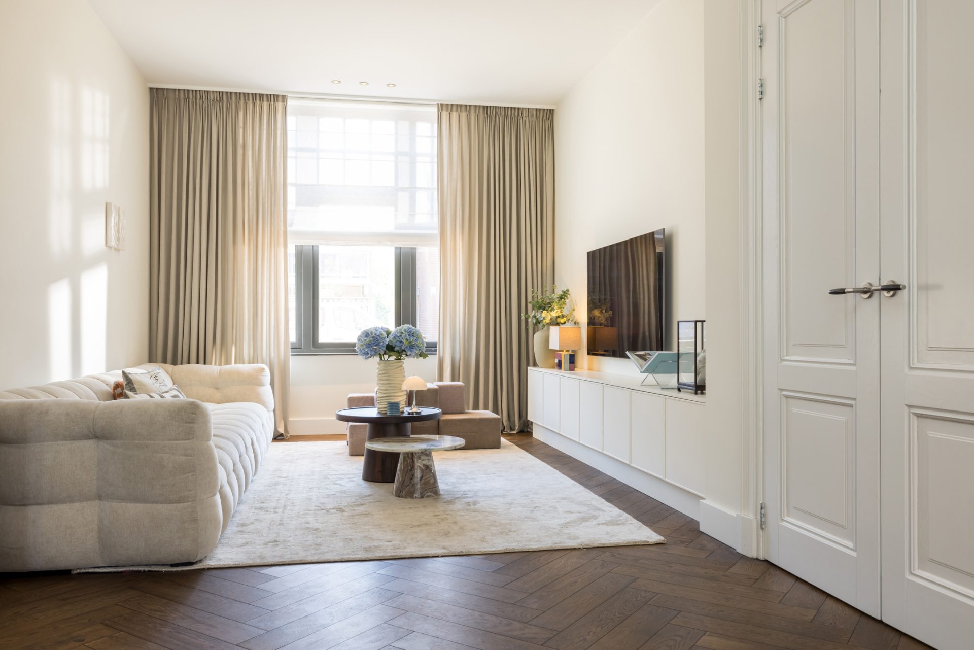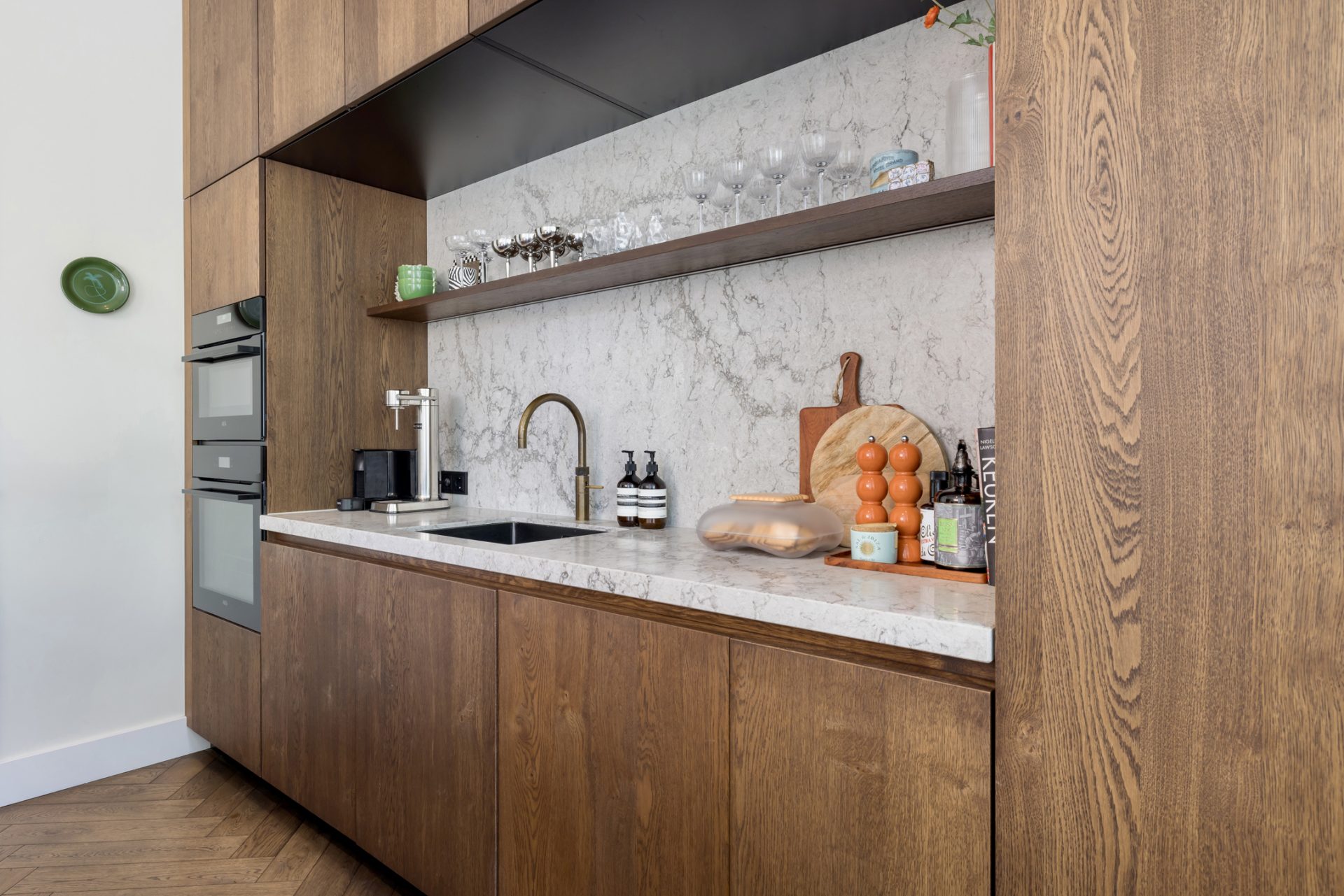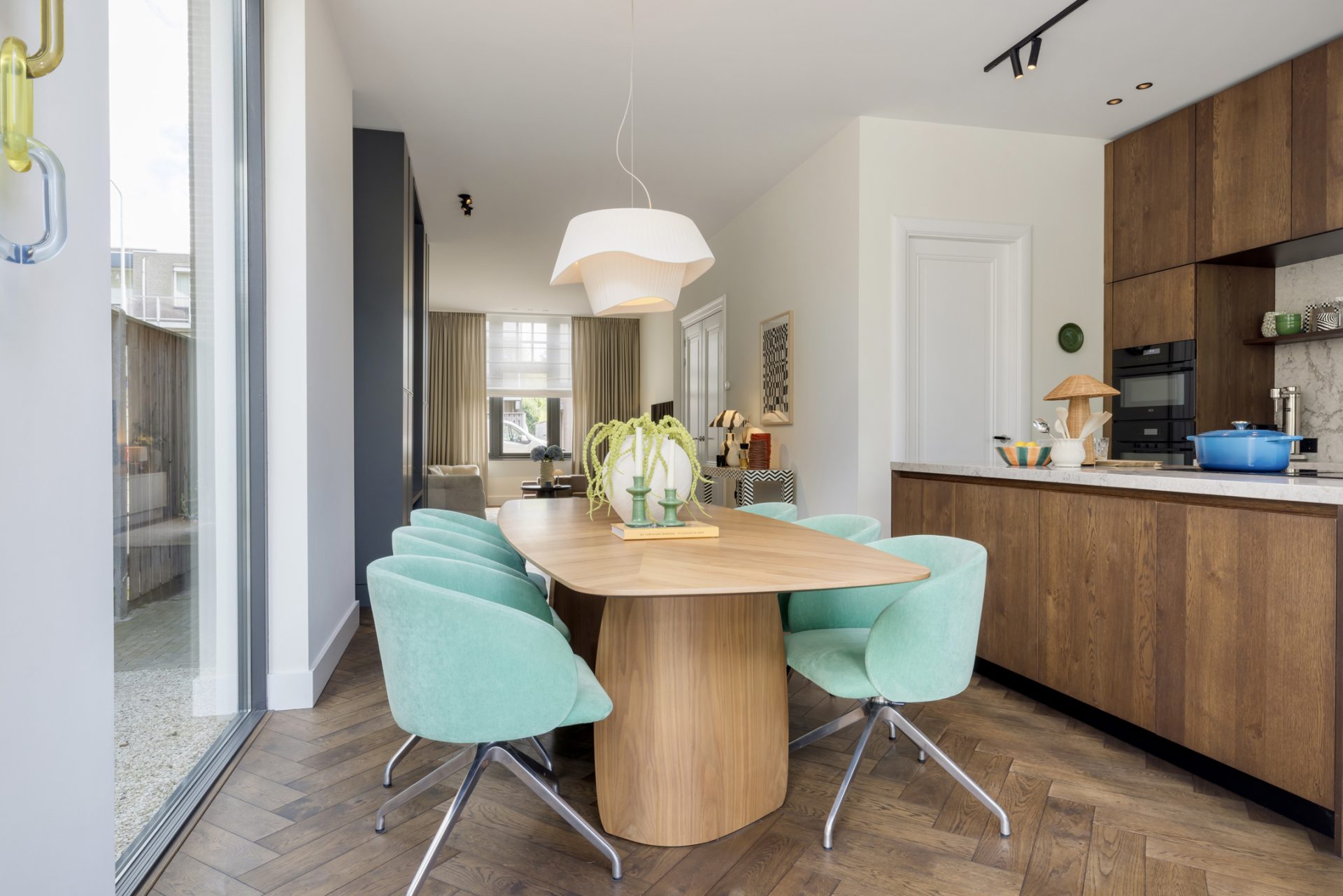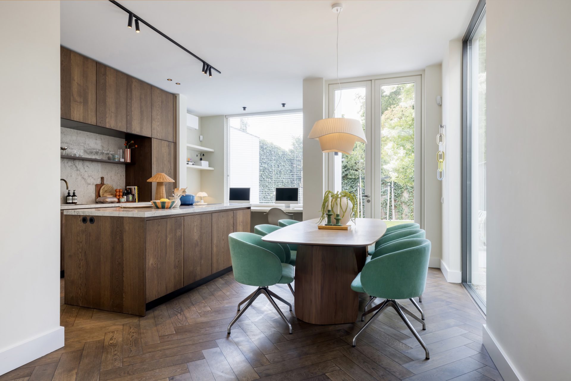 Twee paneeldeuren verbinden de hal met de woon-/eetkamer en keuken, waar de sfeer en stijl vanaf spatten. Opvallend zijn het circa 2.90 meter hoge plafond en de grote ramen, die het ruimtelijke gevoel versterken. Het zitgedeelte, met een maatwerk tv-dressoir, is aan de voorzijde en de donkere maatwerk kastenwand is de perfecte speelplek voor kinderen. Aan de tuinzijde is het eetgedeelte, dat in open verbinding met de keuken staat.