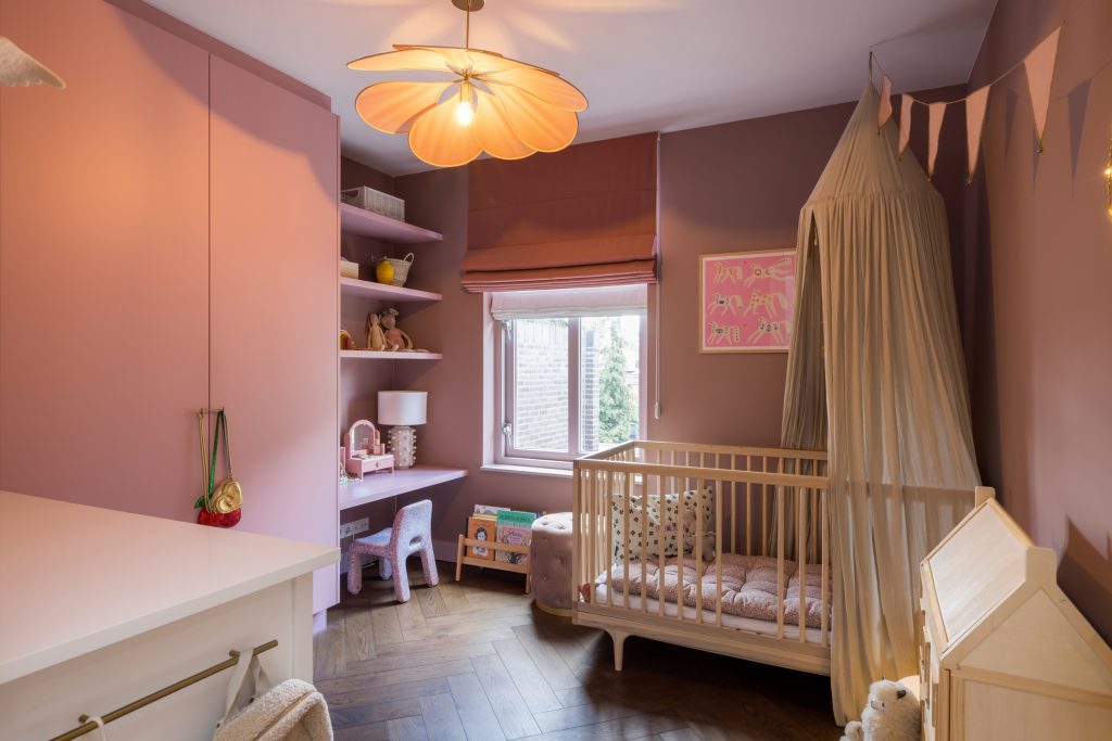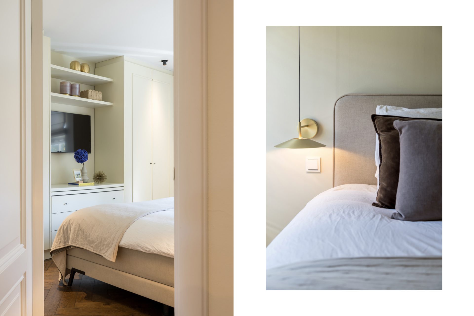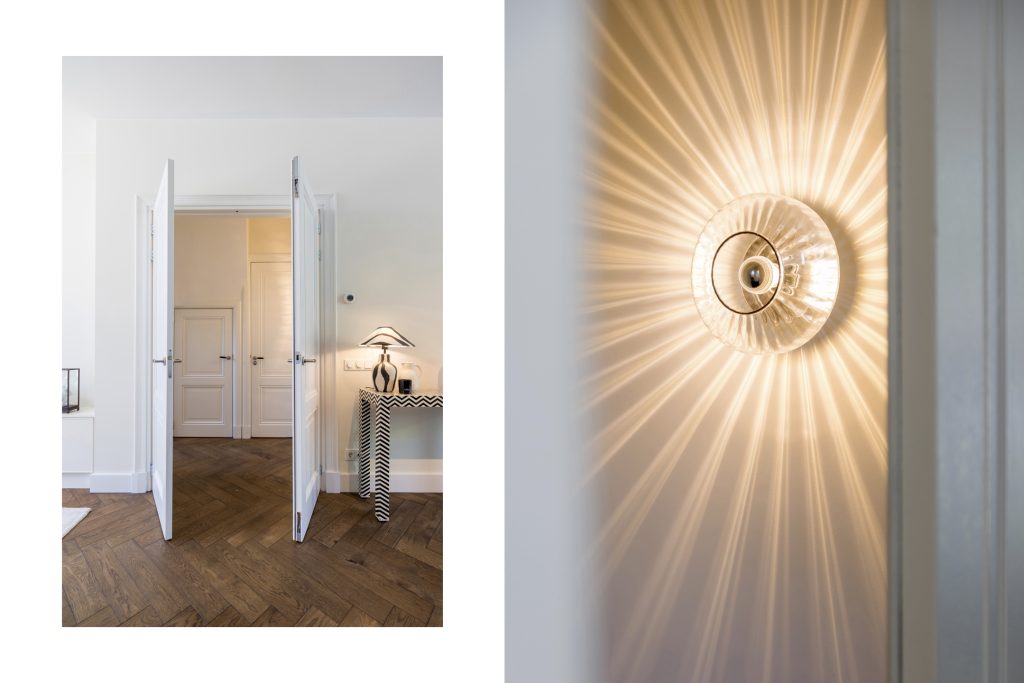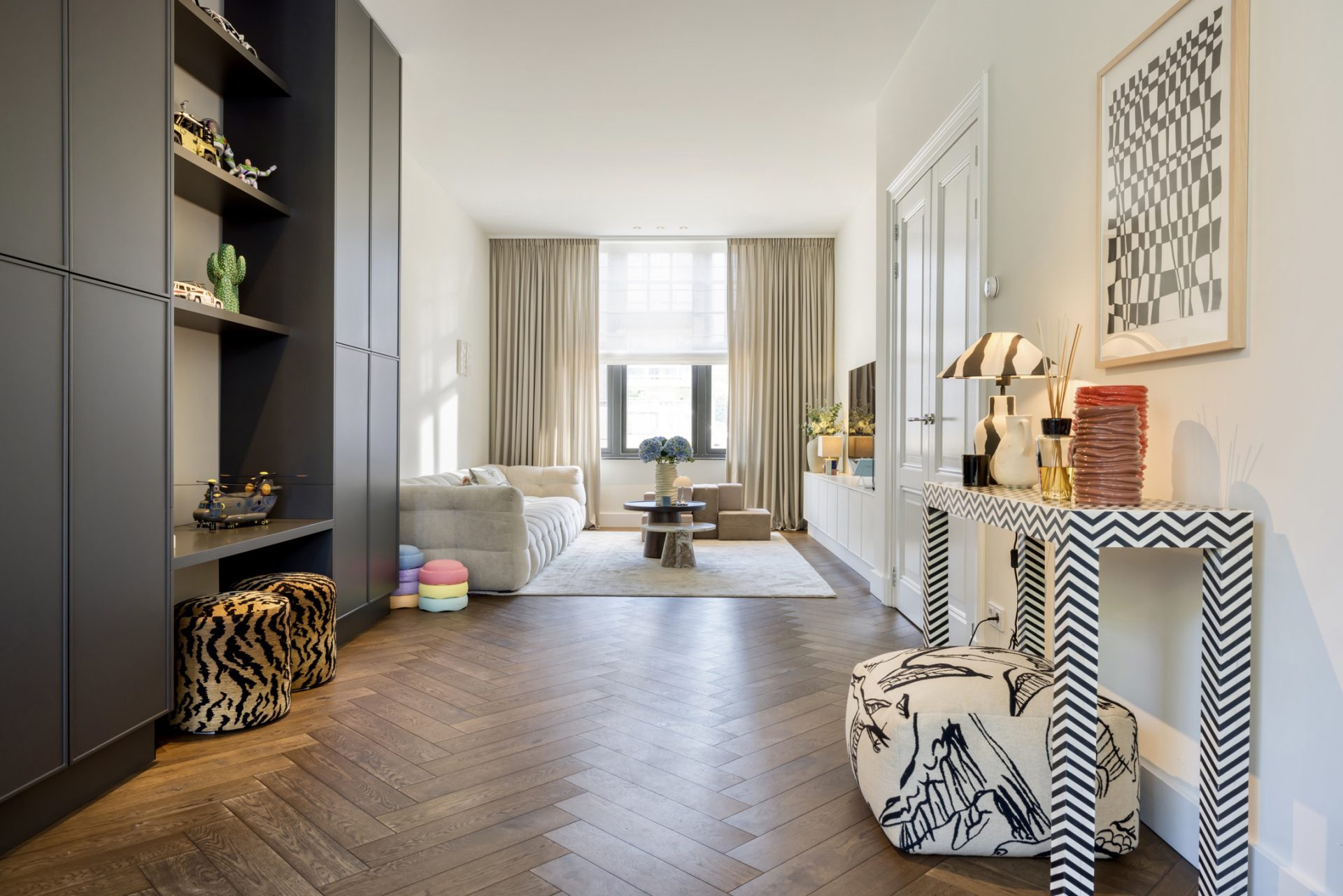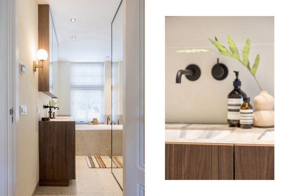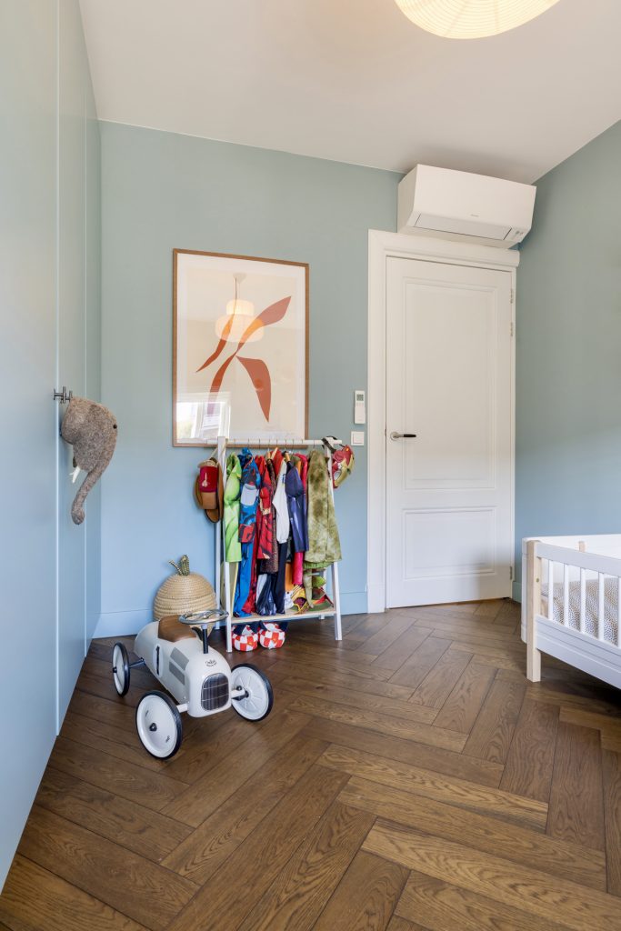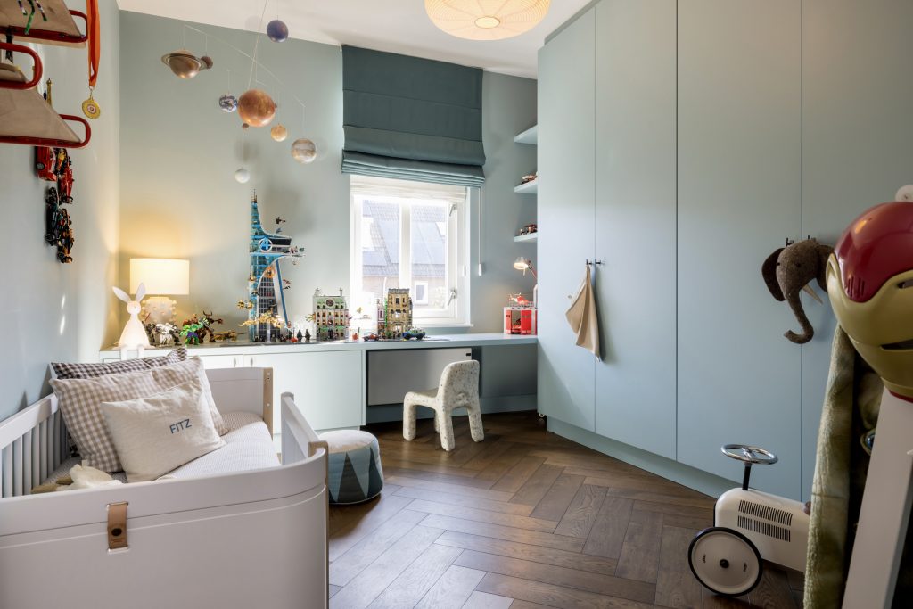 Sfeer, stijl en luxe zijn ook volop aanwezig op de eerste verdieping, waar drie royale slaapkamers zijn. Er ligt, net als op de begane grond, een visgraat parketvloer en in alle kamers zijn maatwerk kasten en bureaus gemaakt. De bureaus in de kinderkamers zijn in hoogte verstelbaar, en de kasten tot plafondhoogte zorgen ervoor dat de beschikte ruimte optimaal benut wordt. In de kinderkamers is gekozen voor kleur, en de master bedroom straalt een aangename rust uit.