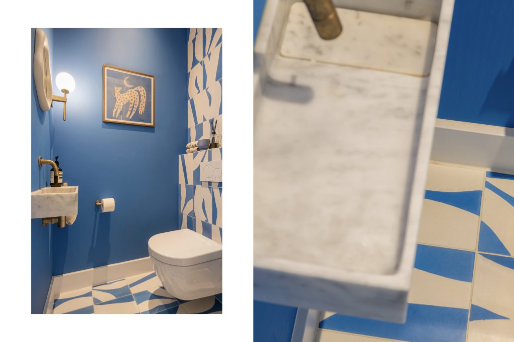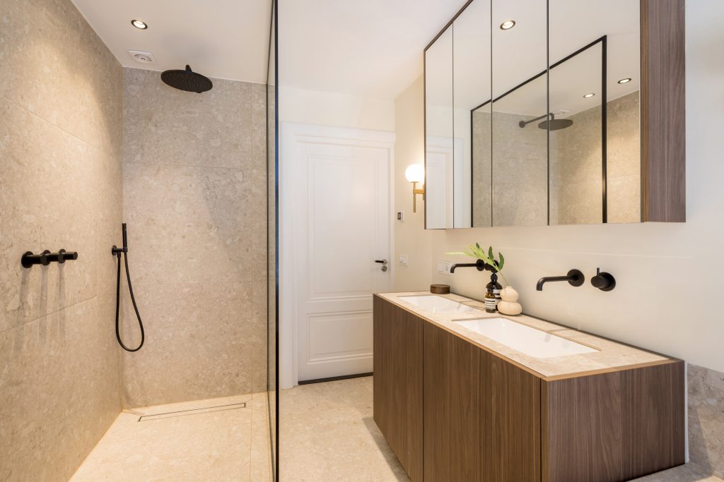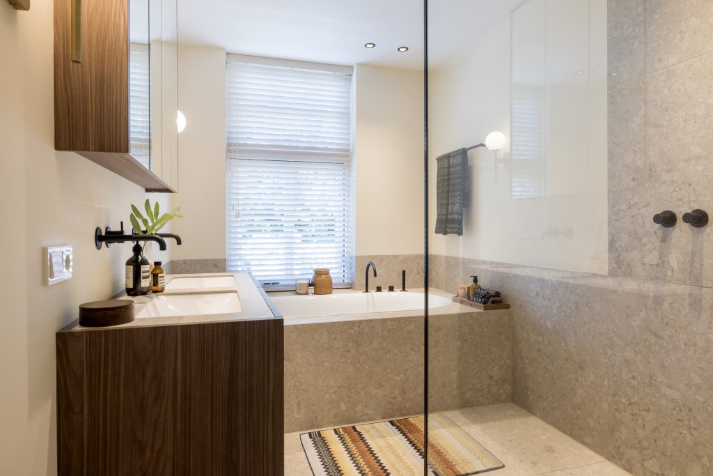 Aan de achterzijde is de luxe badkamer, waar design de boventoon voert. Het bad bij het raam is een geliefde plek, net als de zeer royale inloopdouche en het dubbele wastafelmeubel met spiegelkasten biedt volop bergruimte. Naast de badkamer is een separaat toilet, uitgevoerd in dezelfde stijl.