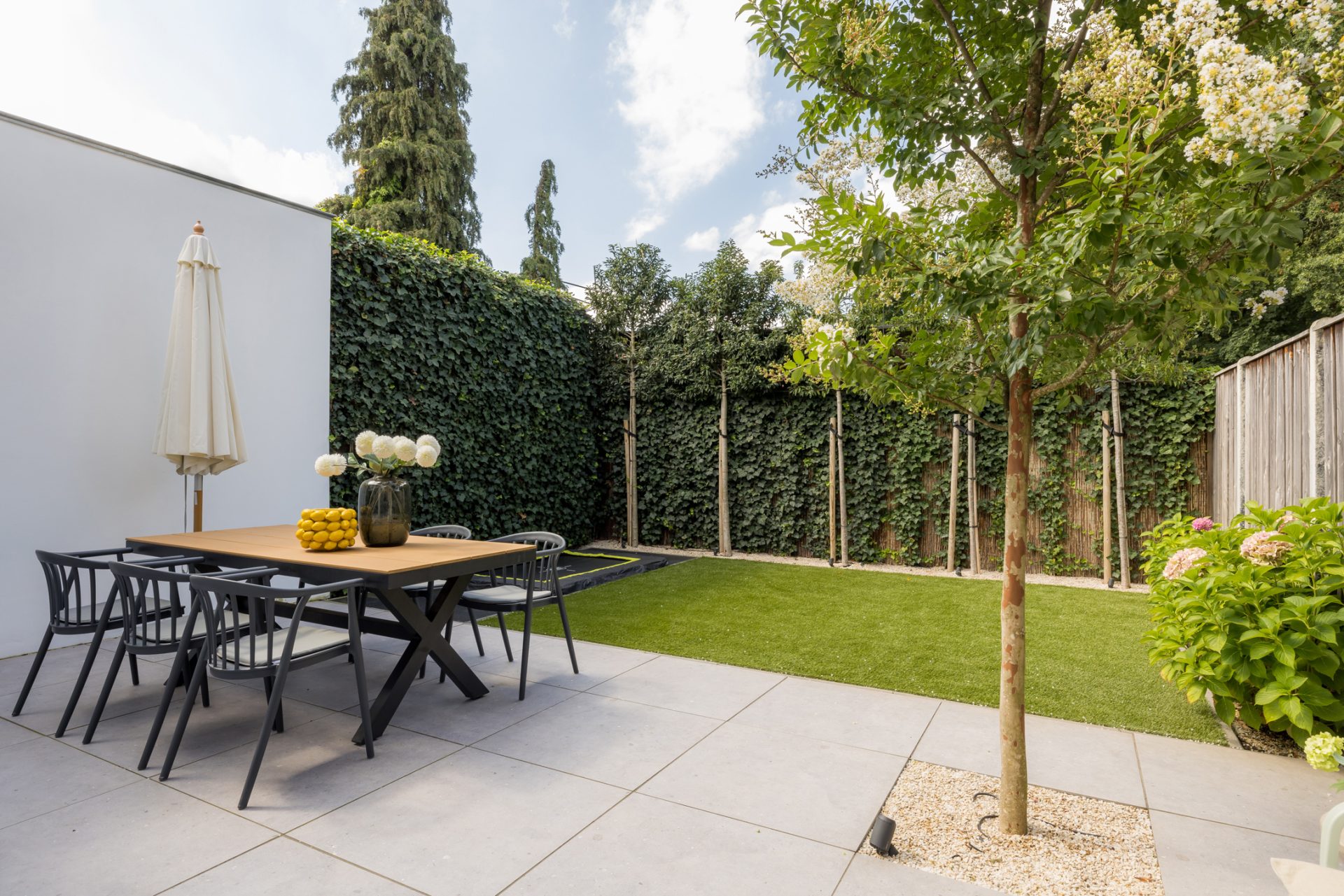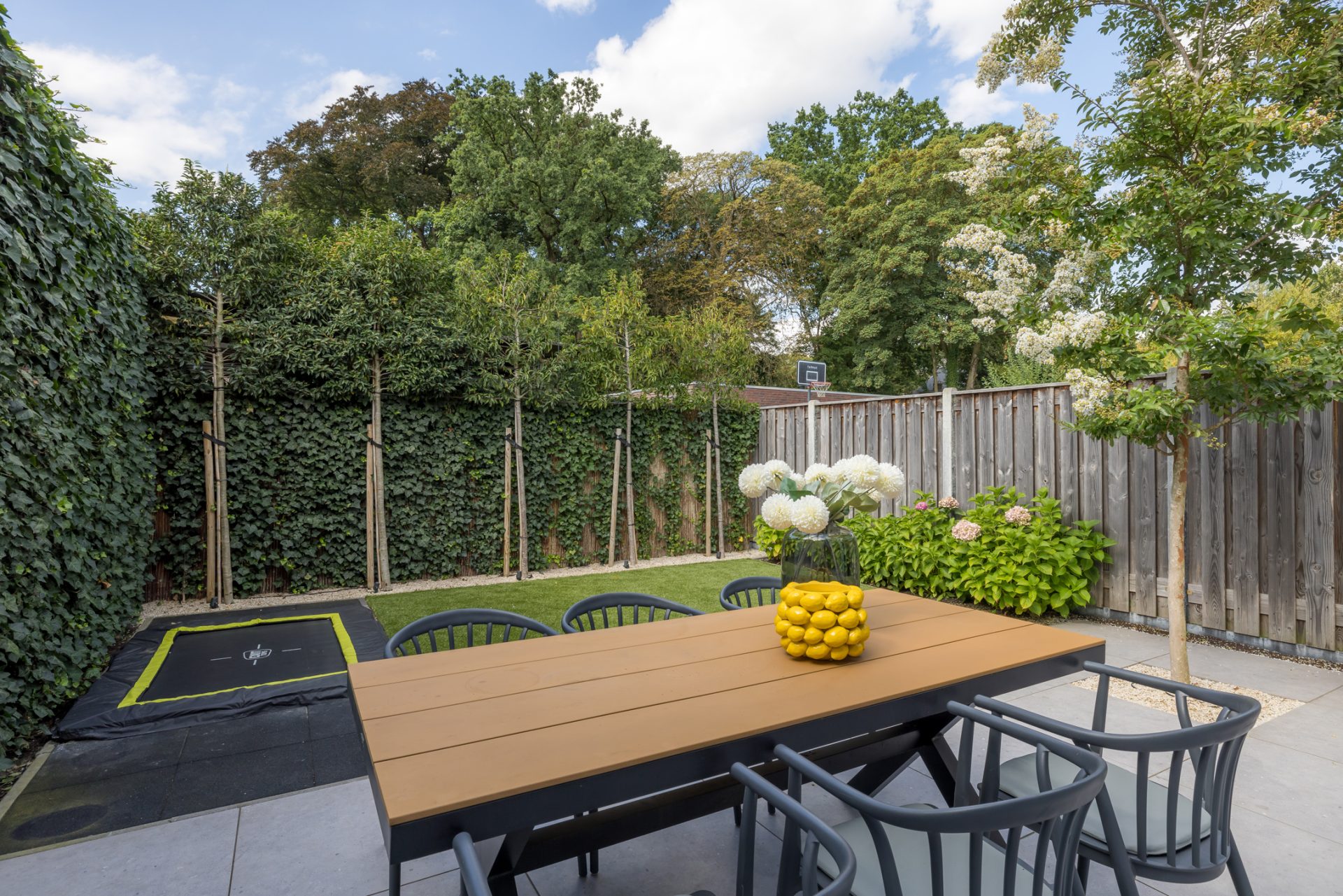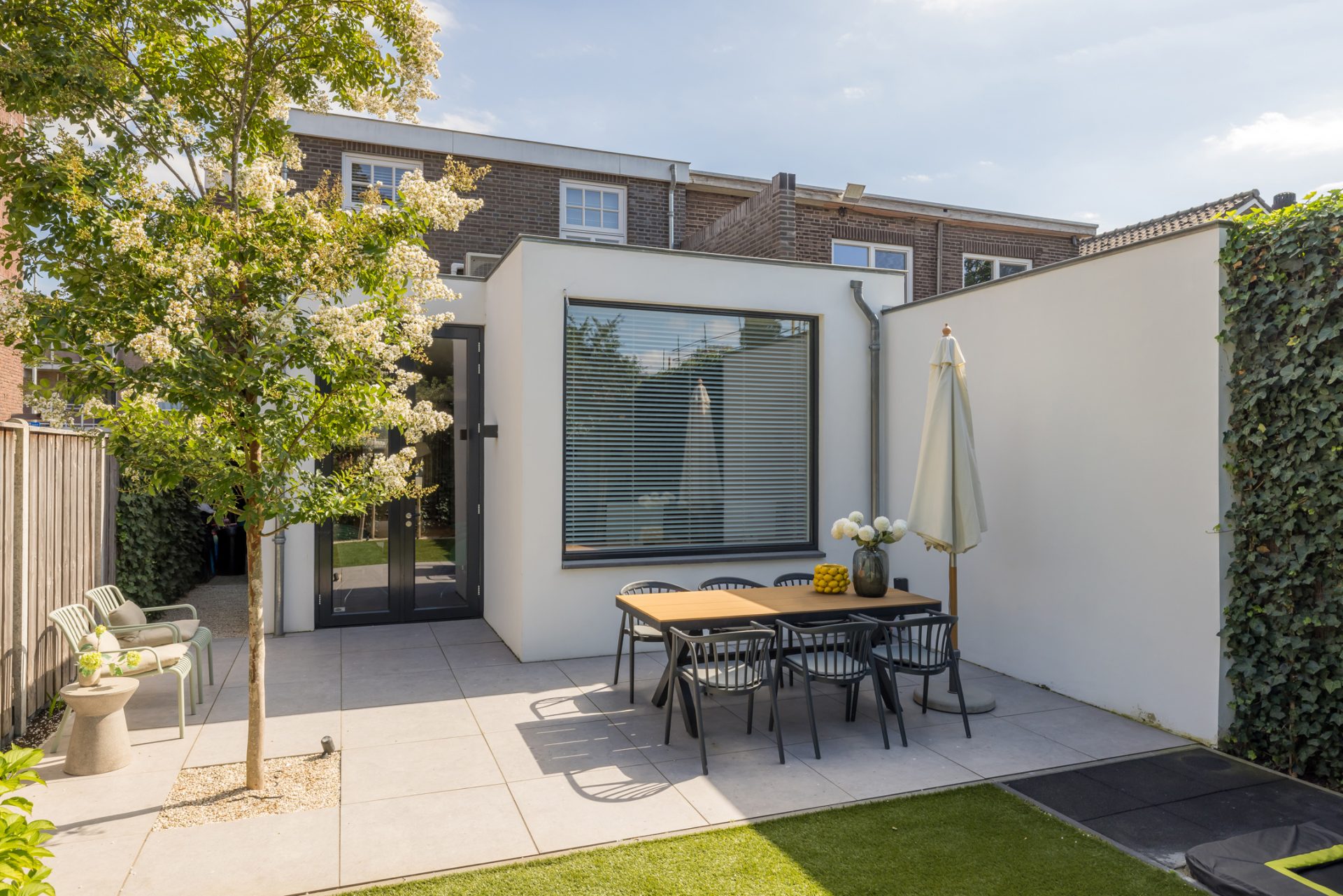Vanuit de eetkamer is er toegang tot de fraai aangelegde, onderhoudsvriendelijke tuin op het zuidwesten. Het grote terras de perfecte plek om te loungen en eten, terwijl het achterste deel van de tuin een fijne speelplek voor de kinderen is. Wat opvalt is de grote mate van privacy, dankzij de zorgvuldig gekozen beplanting die tegelijk ook heel onderhoudsvriendelijk is. Er is een eigen, overdekte doorgang van de tuin naar de voorzijde van de woning. Deze doorgang is ideaal om de (kinder)fietsen op een droge plek te stallen.
