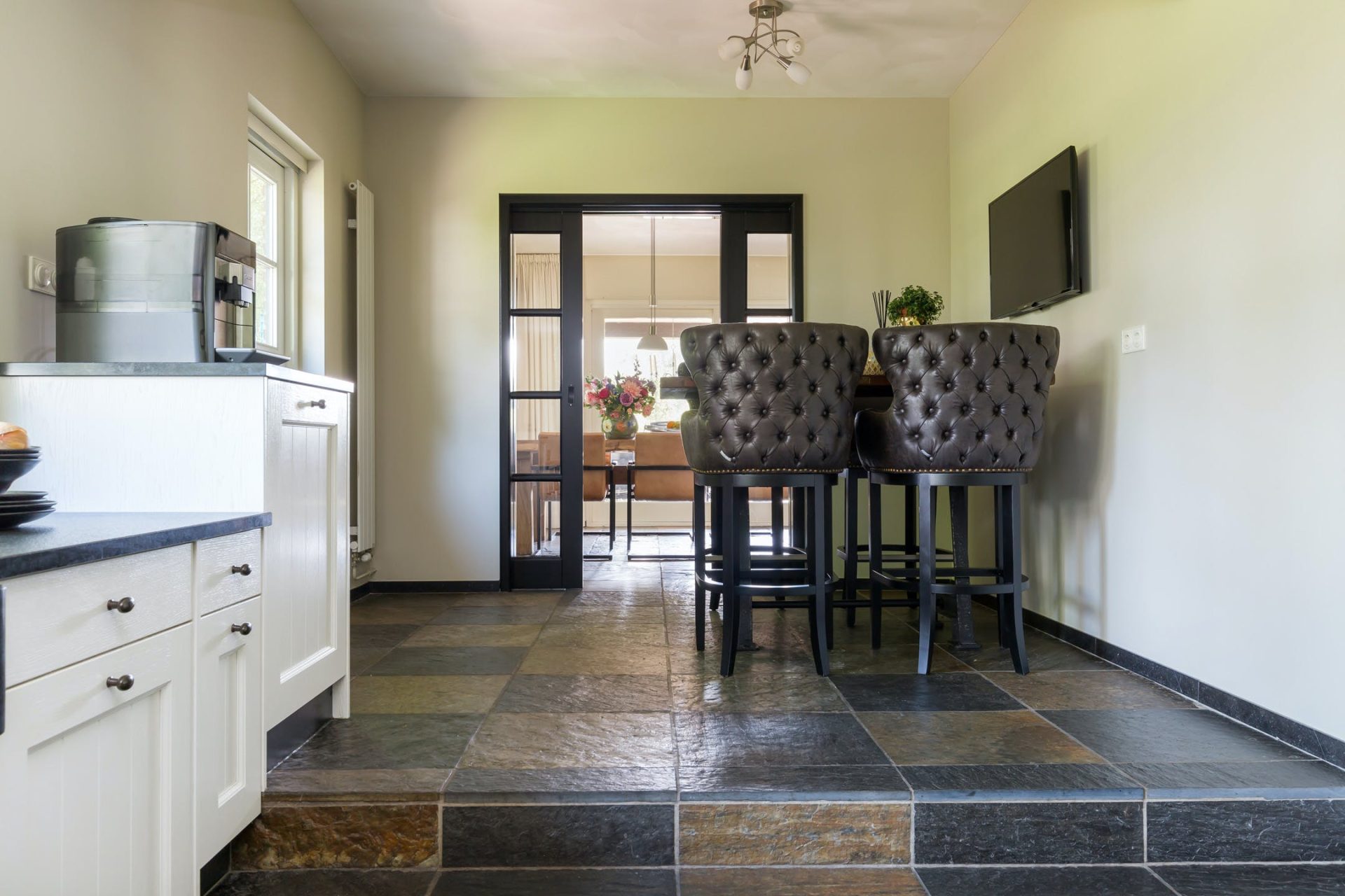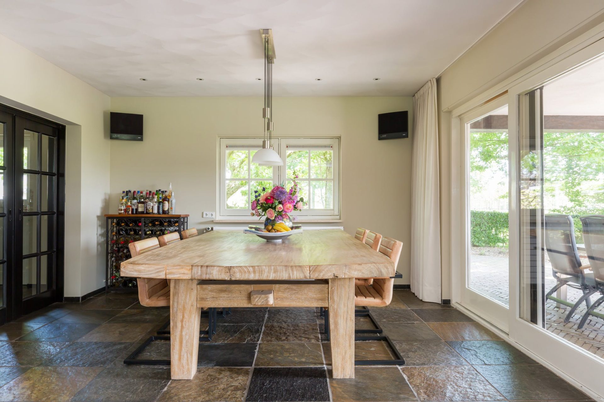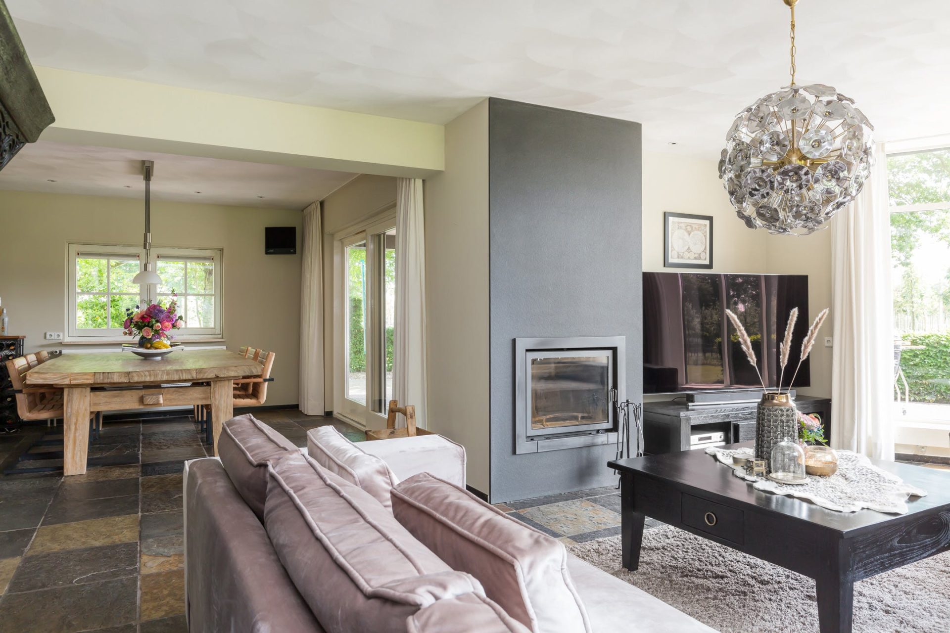 De lichte, speels ingedeelde woonkamer heeft een erker, grote raampartijen en een schuifpui naar het overdekte terras. Blikvangers zijn de leistenen vloer en de schouw met inbouwhaard.