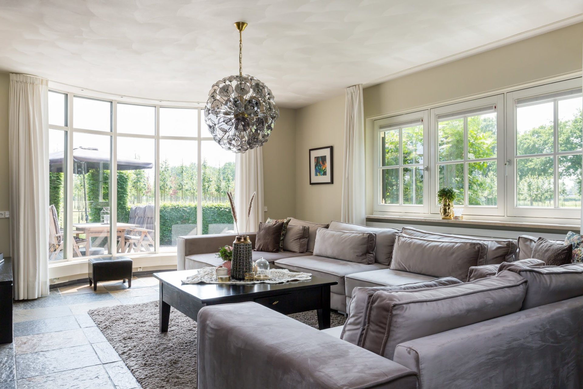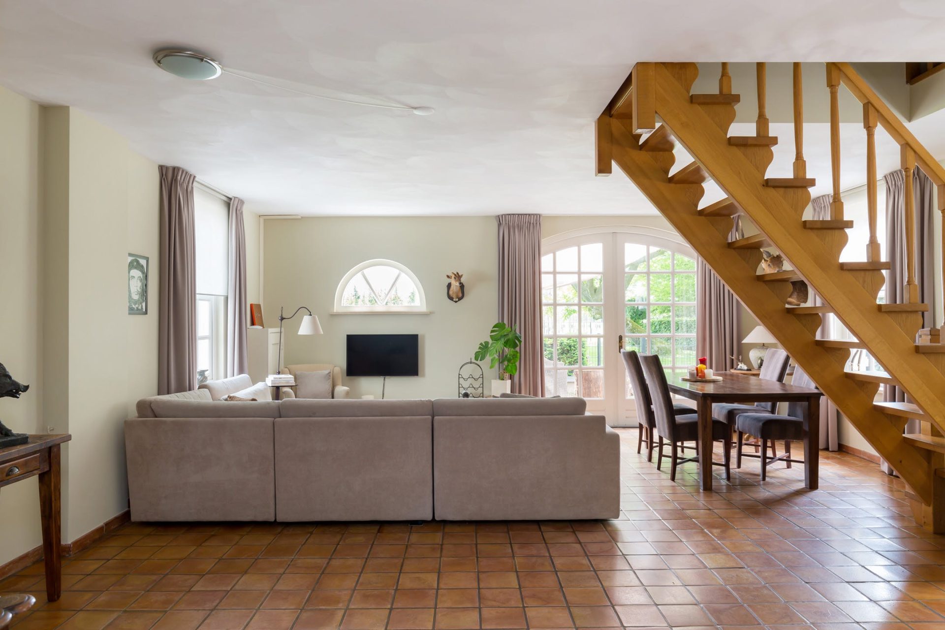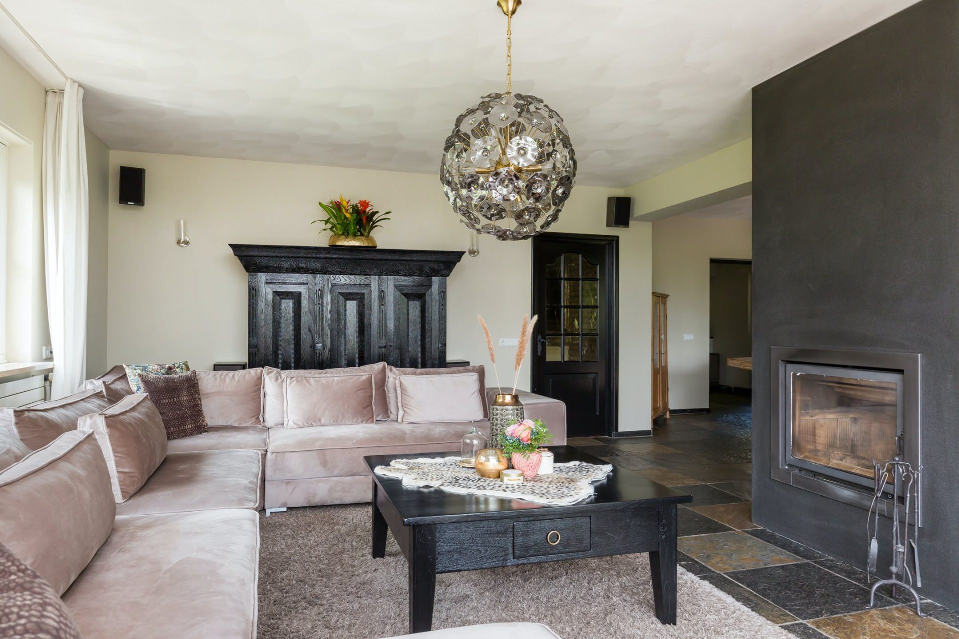 De lichte, speels ingedeelde woonkamer heeft een erker, grote raampartijen en een schuifpui naar het overdekte terras. Blikvangers zijn de leistenen vloer en de schouw met inbouwhaard.