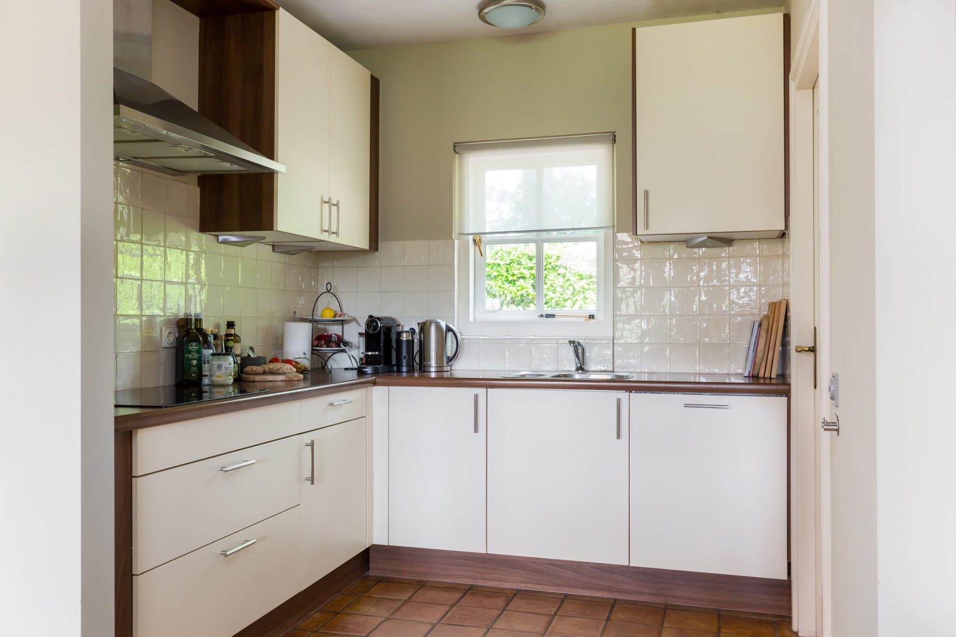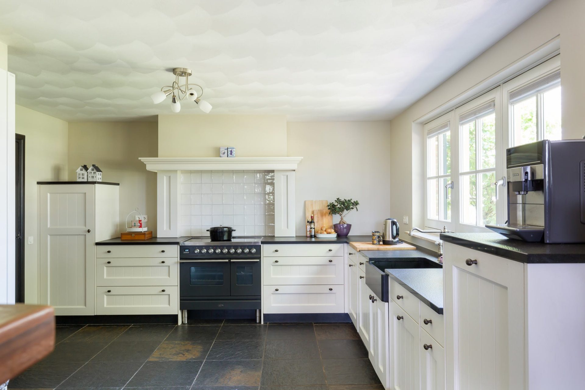 De woonkeuken heeft een op maat gemaakte inrichting in hoekopstelling met een getrommeld granieten werkblad. Alle benodigde apparatuur is ingebouwd: een inductiefornuis met dubbele oven, een afzuigkap, koelkast en een vaatwasser. Vanuit de keuken bereikt u ook de kelder.