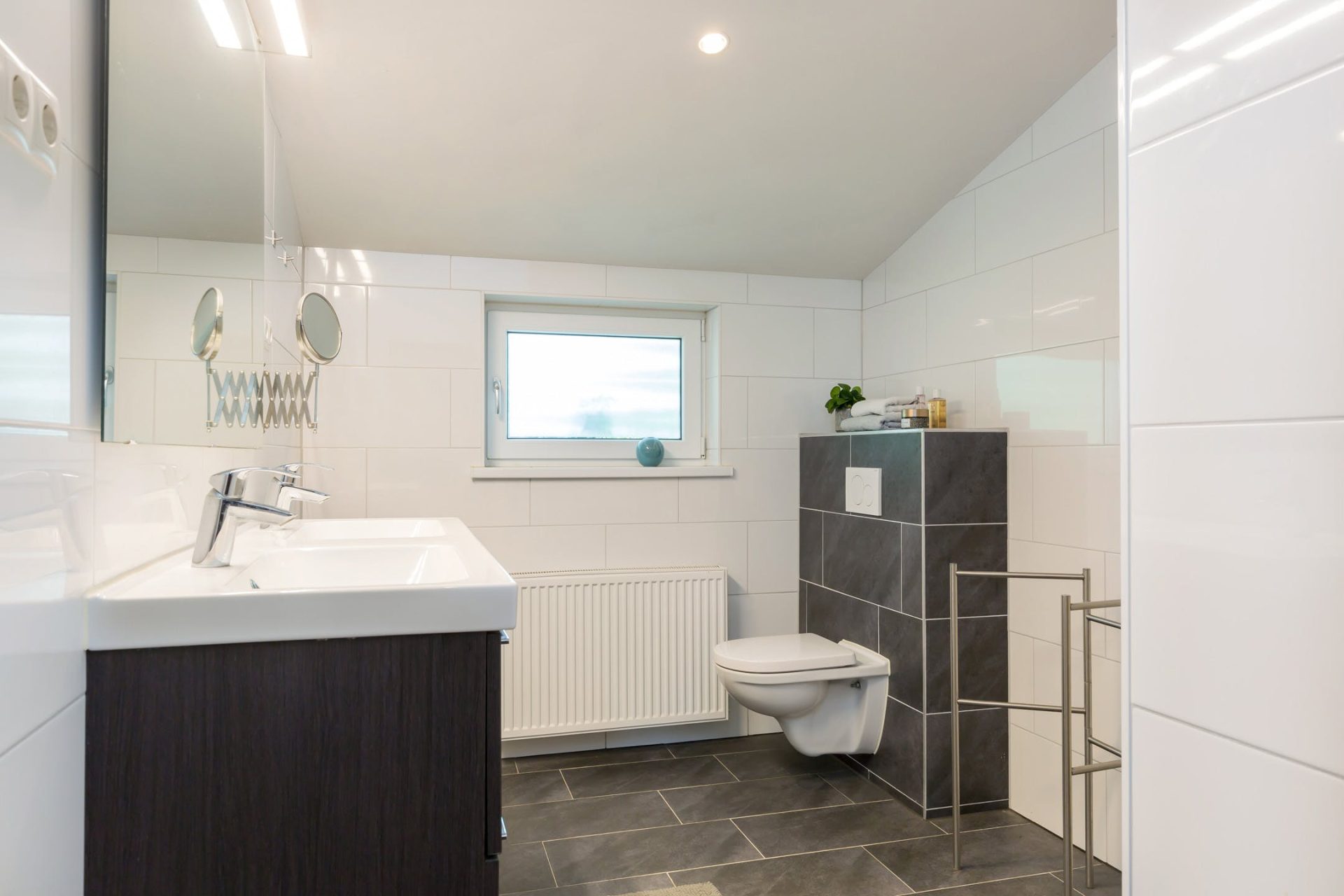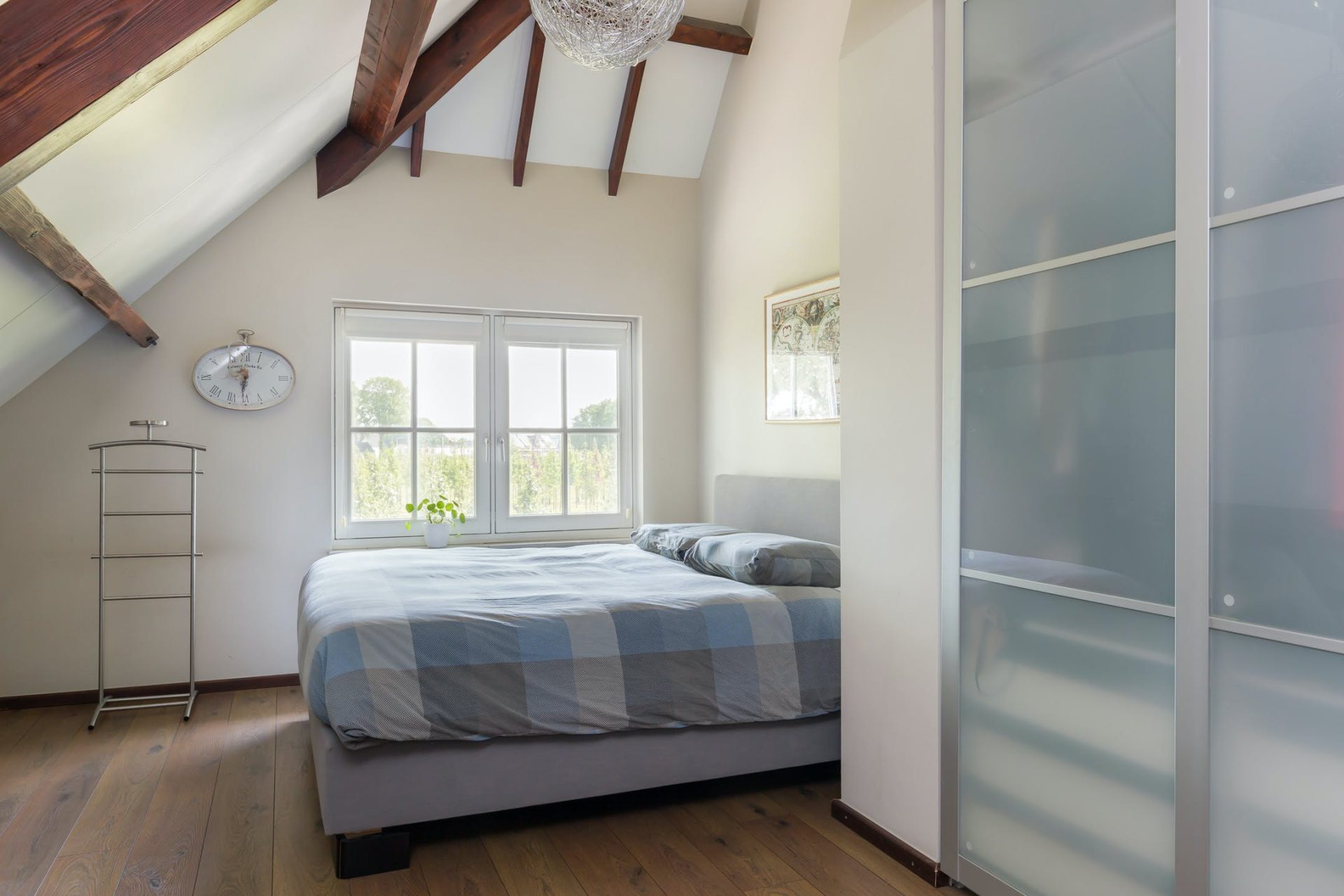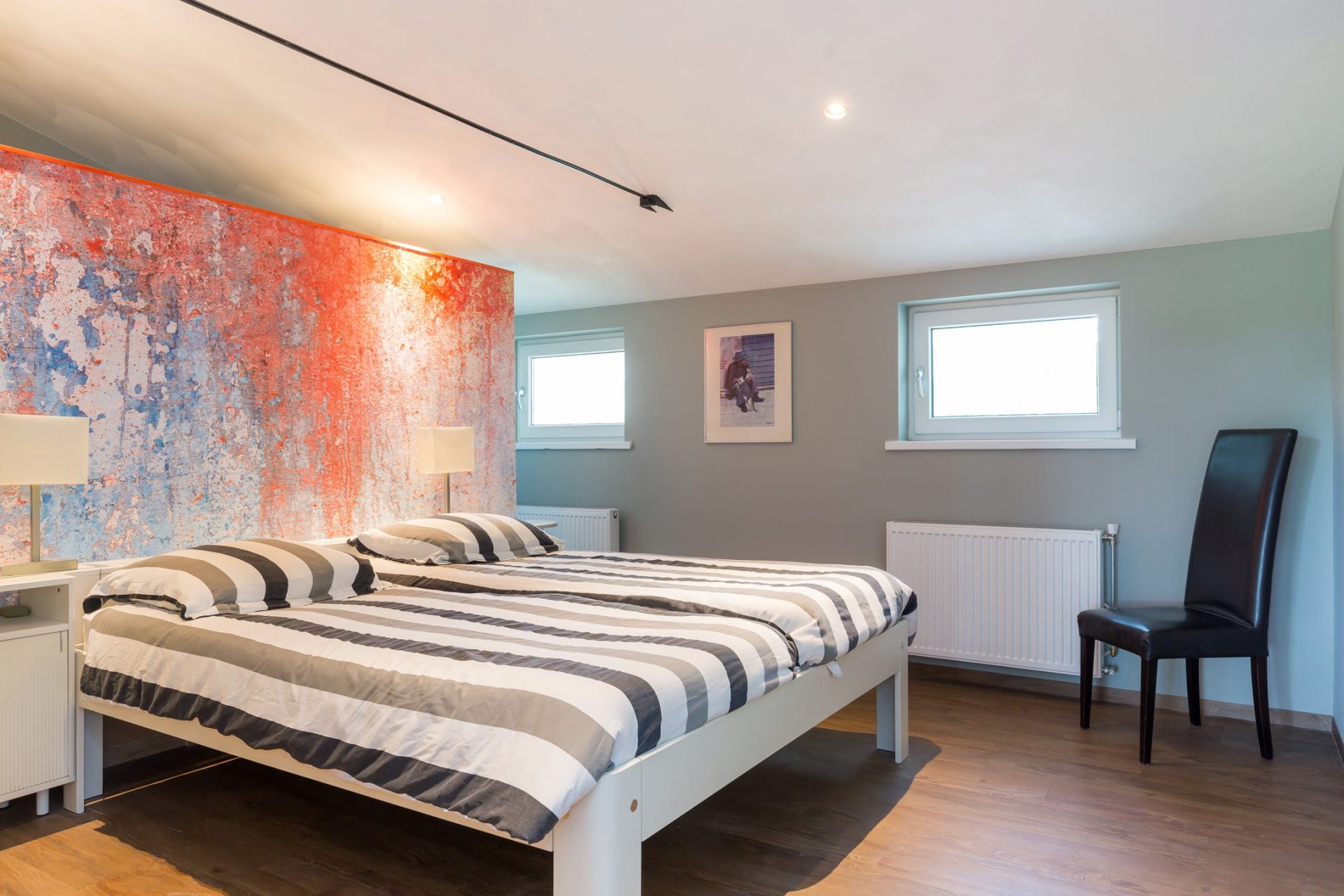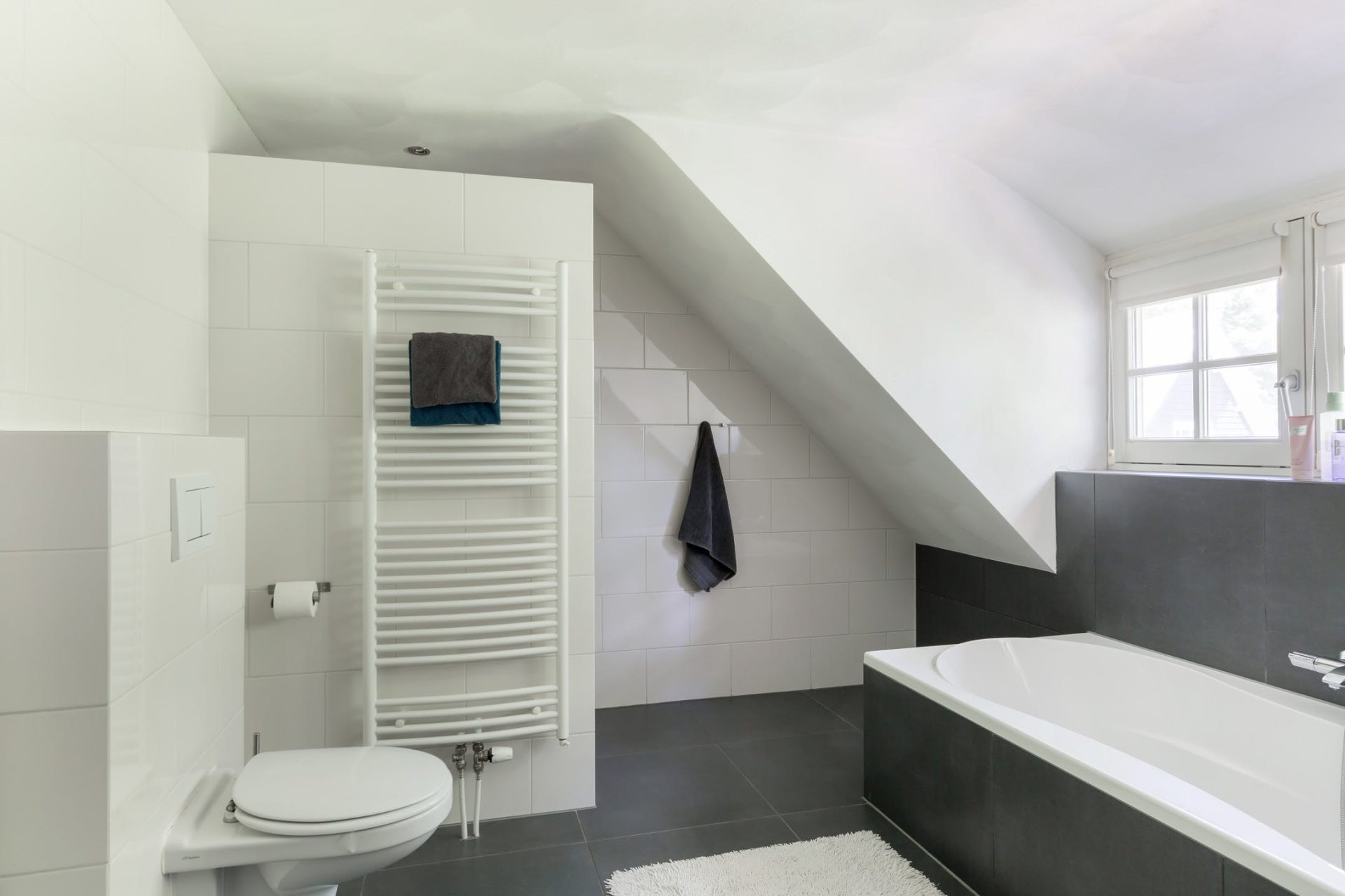 De slaapkamers aan de achterzijde zijn ingericht als tweepersoonskamer en een van deze kamers is op de foto ingericht als woonkamer. De moderne badkamer heeft een dakkapel, ligbad, inloopdouche, toilet, vloerverwarming en een wastafelmeubel met twee wastafels.