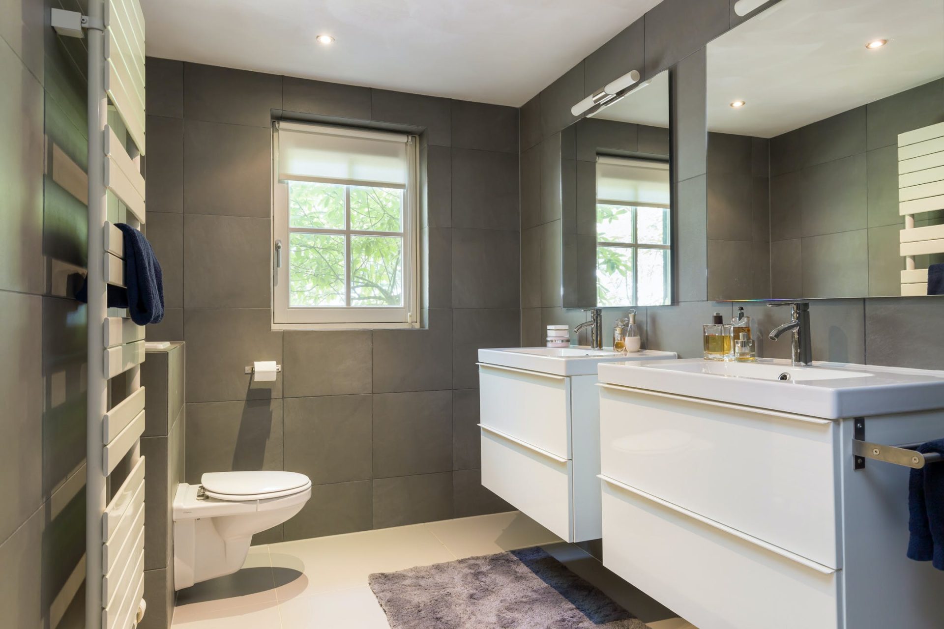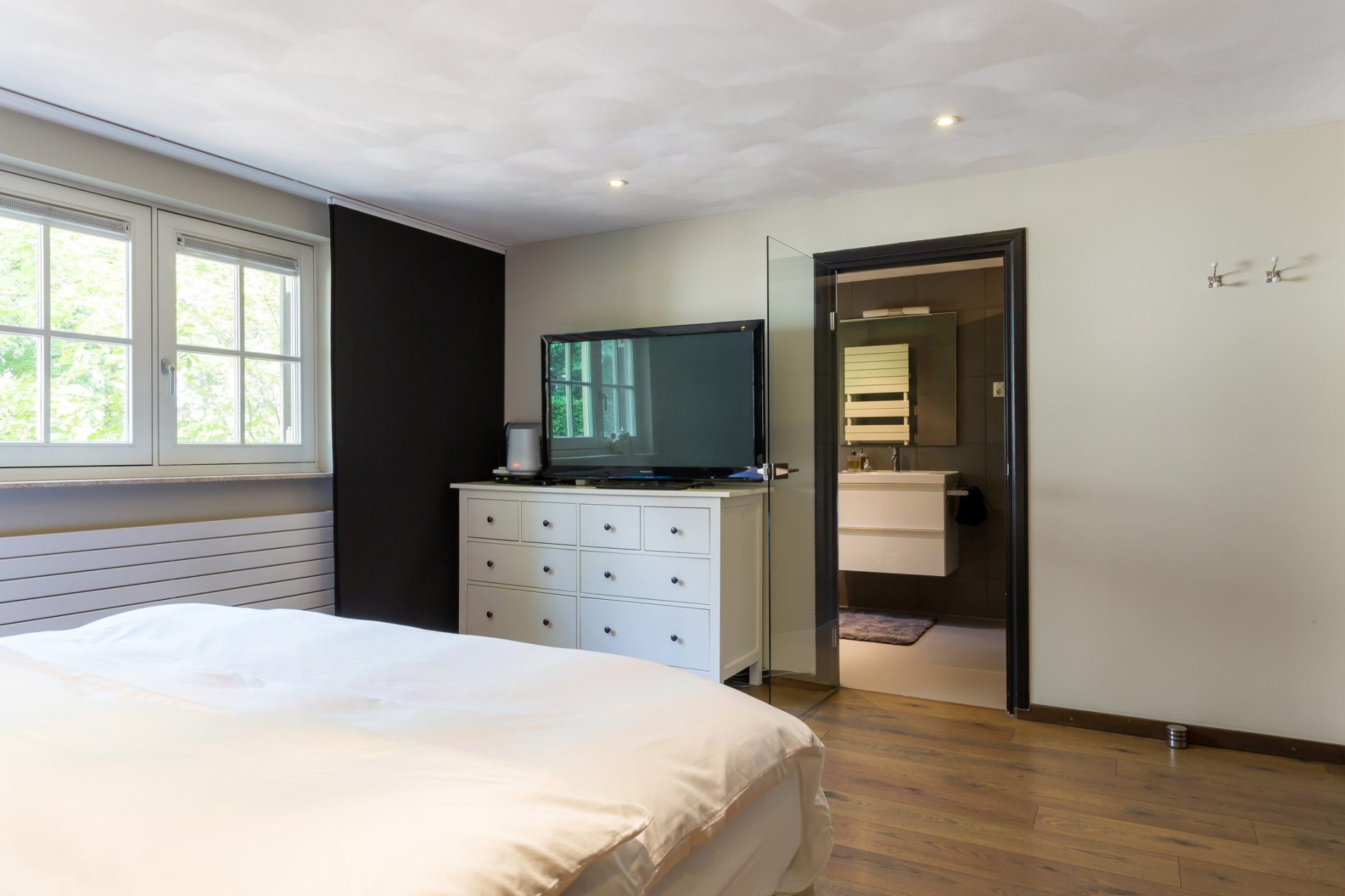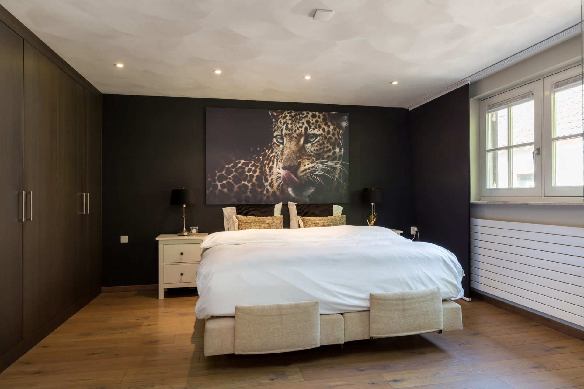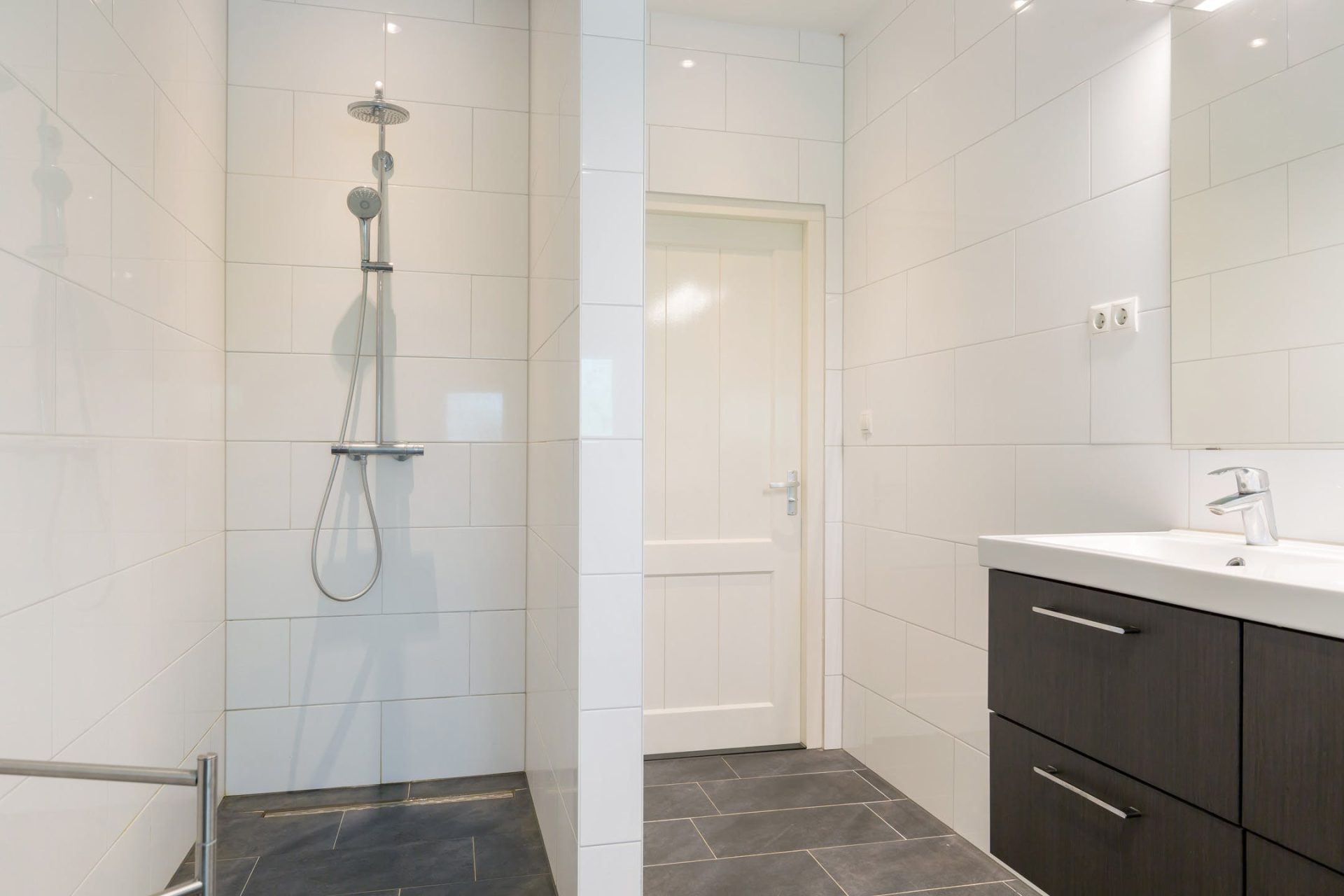 De slaapkamers aan de achterzijde zijn ingericht als tweepersoonskamer en een van deze kamers is op de foto ingericht als woonkamer. De moderne badkamer heeft een dakkapel, ligbad, inloopdouche, toilet, vloerverwarming en een wastafelmeubel met twee wastafels.