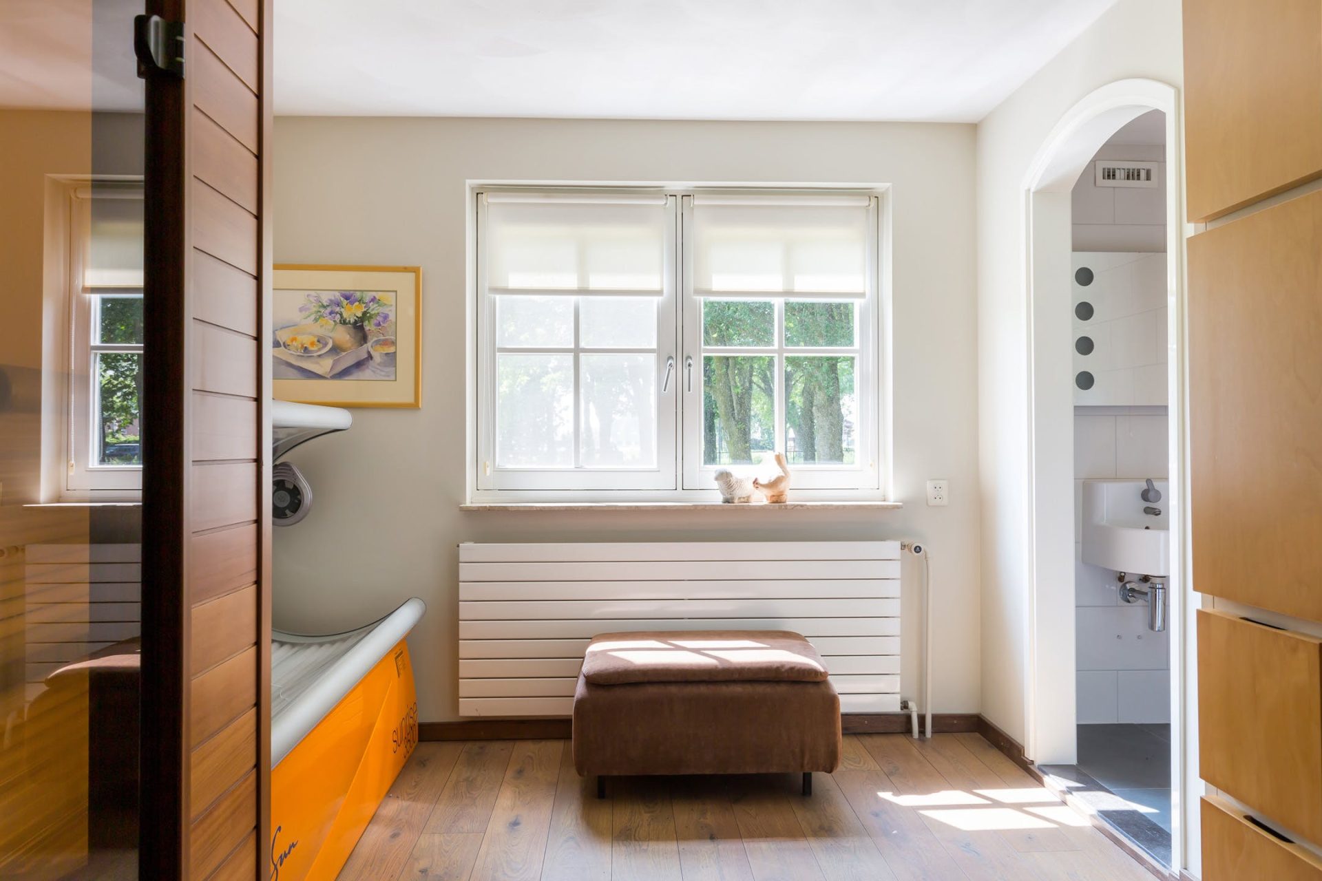 De tweede slaapkamer is momenteel ingericht als werkkamer omdat het een fraai uitzicht heeft op de voortuin. Naast deze slaap-/werkkamer ligt de tweede badkamer met een inloopdouche, wastafel, infraroodsauna en een plek voor een zonnebank.