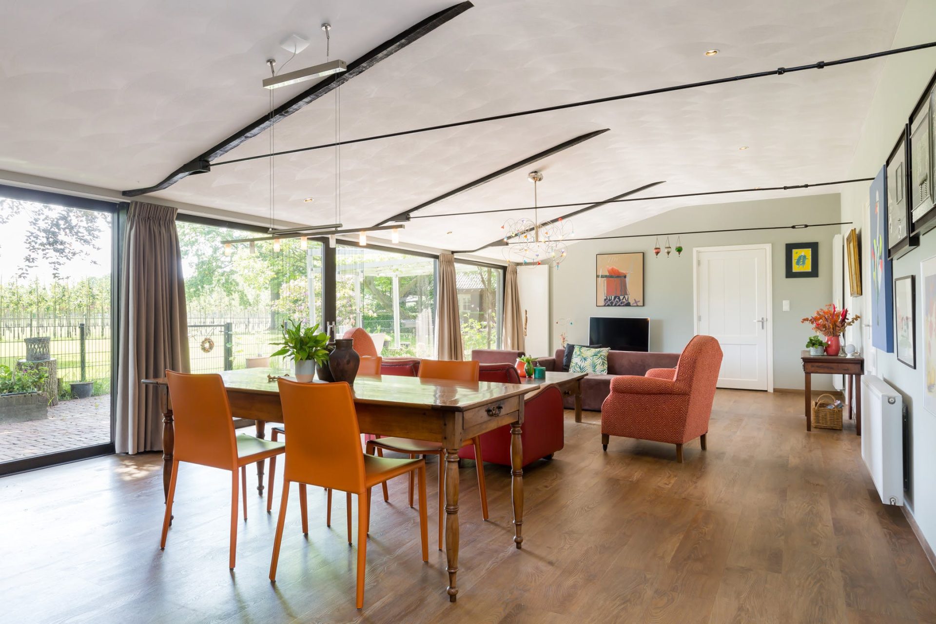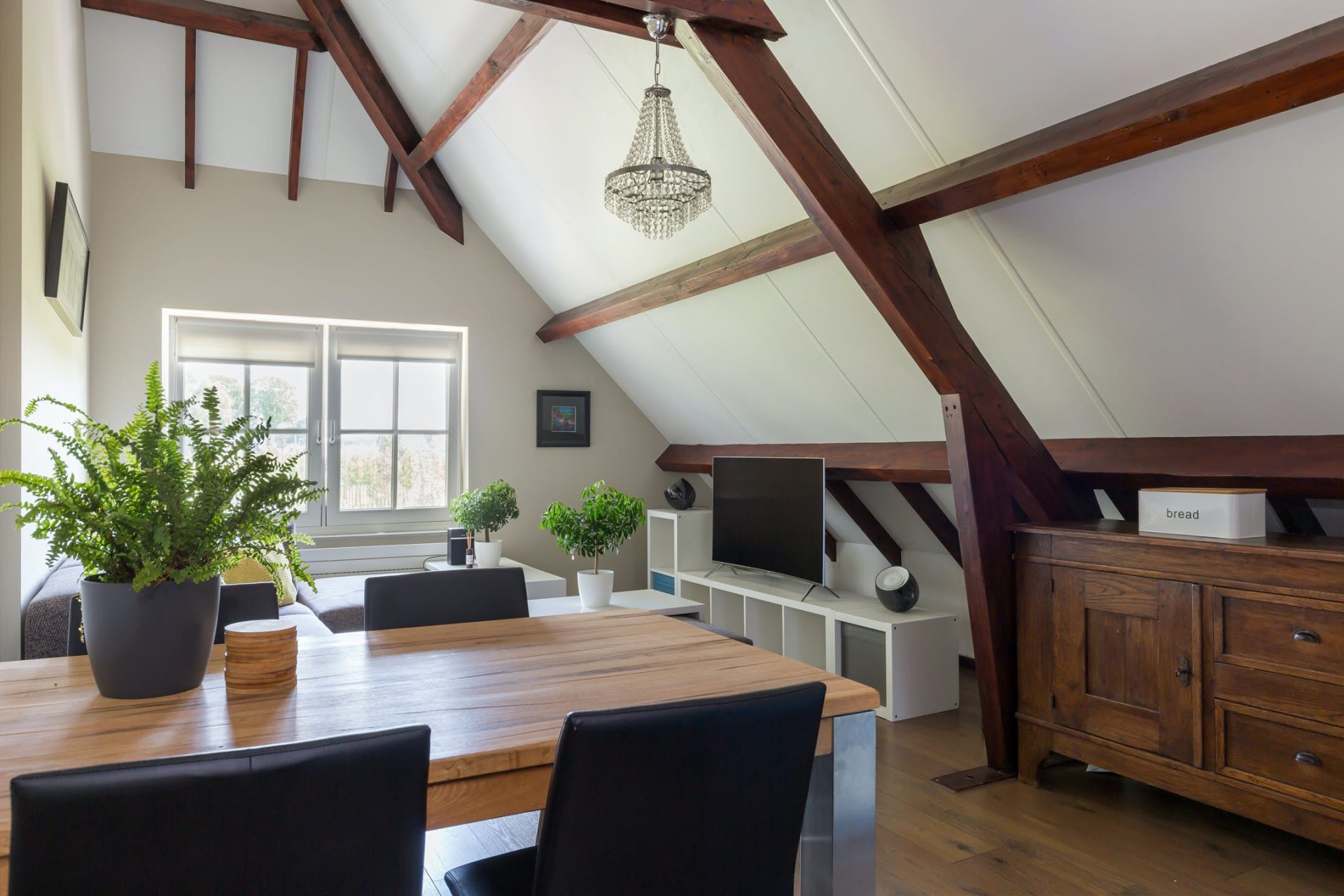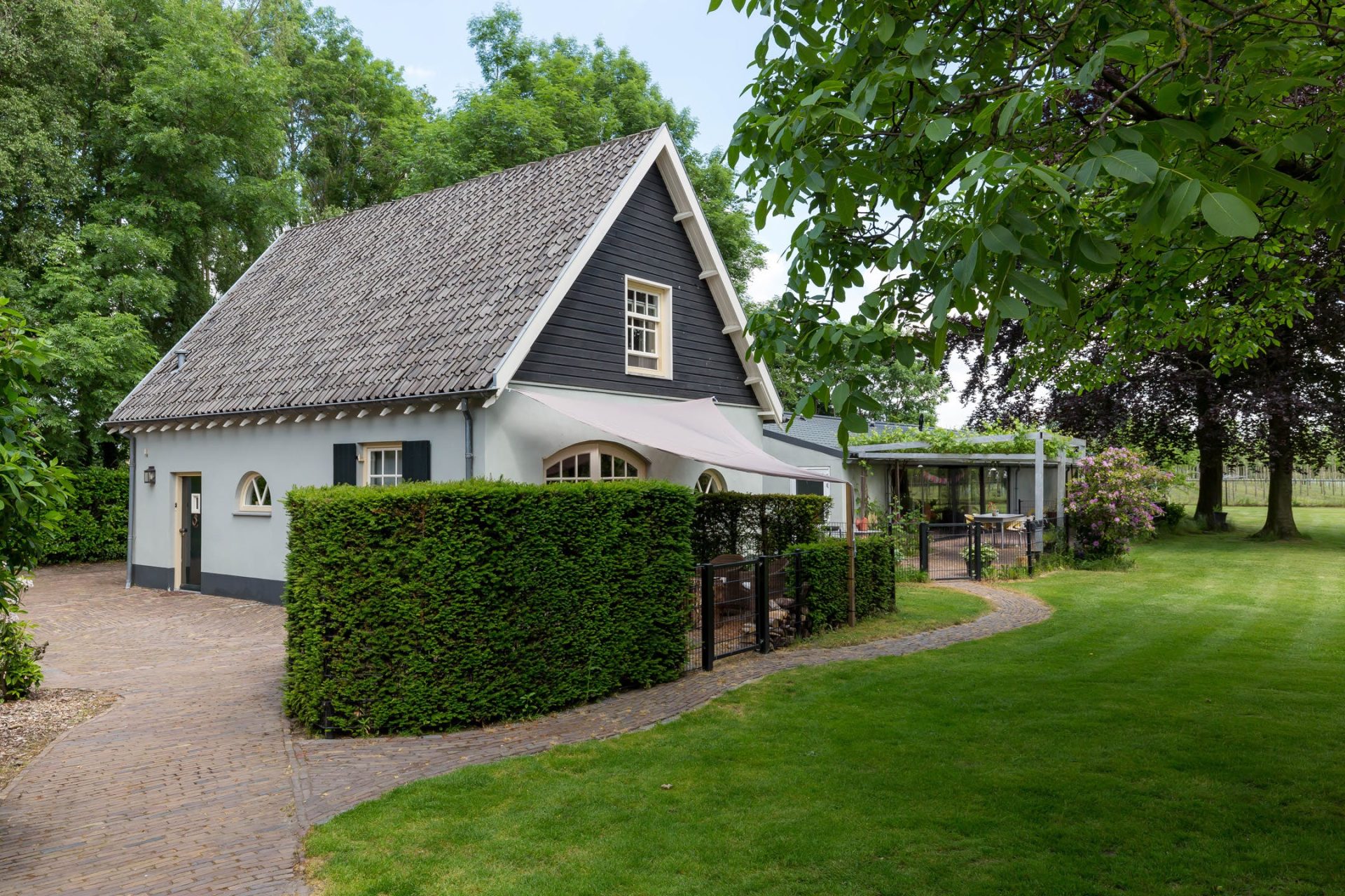 Achter de woonboerderij staat je eigen ‘white house’, inclusief een charmant pannendak deels gestucte gevels. Voor het ontvangen van gasten is dit een fantastische plek, waarbij wederzijdse privacy gewaarborgd is. Op de begane grond zijn een hal met toilet, een sfeervolle woonkamer met open keuken en een bijkeuken met eigen entree. De schuiframen met roedeverdeling, het halfronde stalraam en de openslaande deuren naar het terras zorgen voor een aangename sfeer.