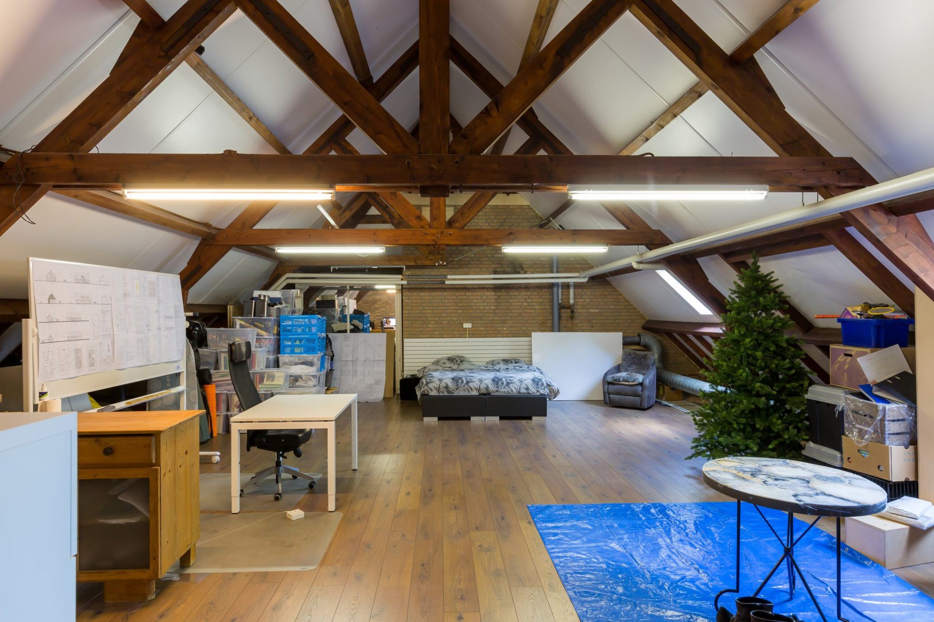 Op de eerste verdieping zijn de overloop met vide, twee slaapkamers, een enorme werkkamer en de derde badkamer. De werkkamer aan de voorzijde is dermate groot dat de realisatie van meerdere kamers mogelijk is. Nu is deze kamer ingericht als werk- en logeerkamer waarbij de houten dakconstructie prominent aanwezig is.
