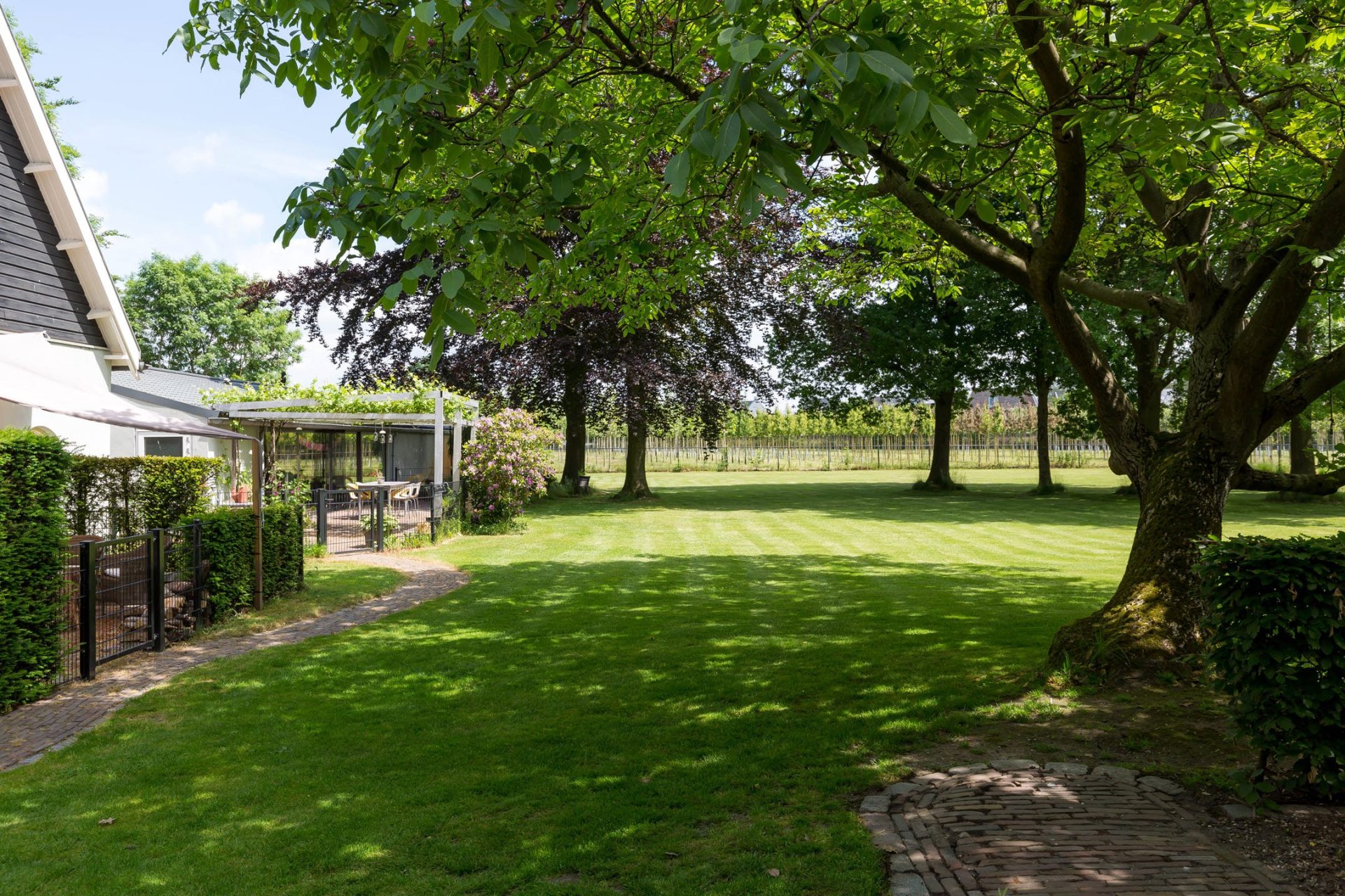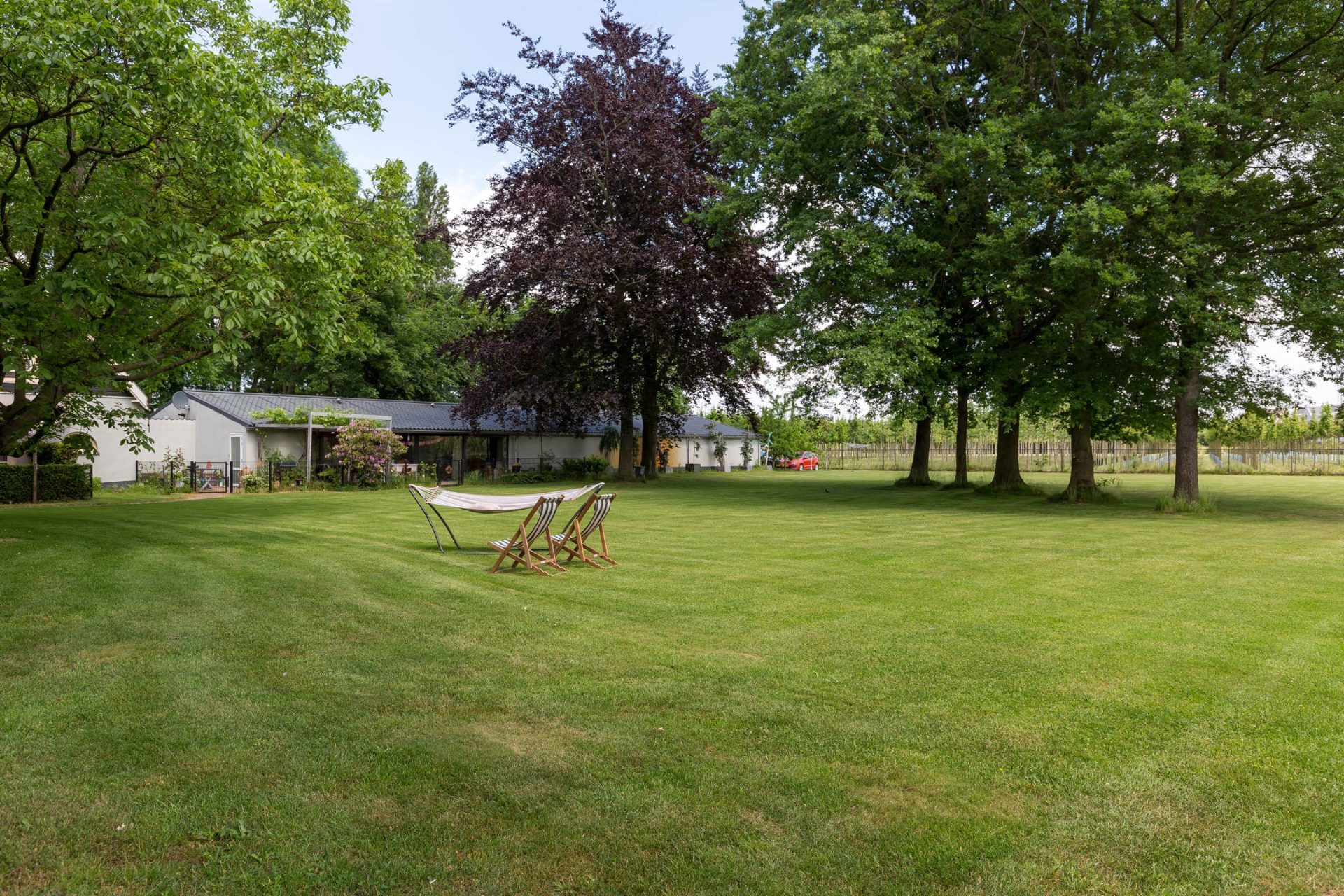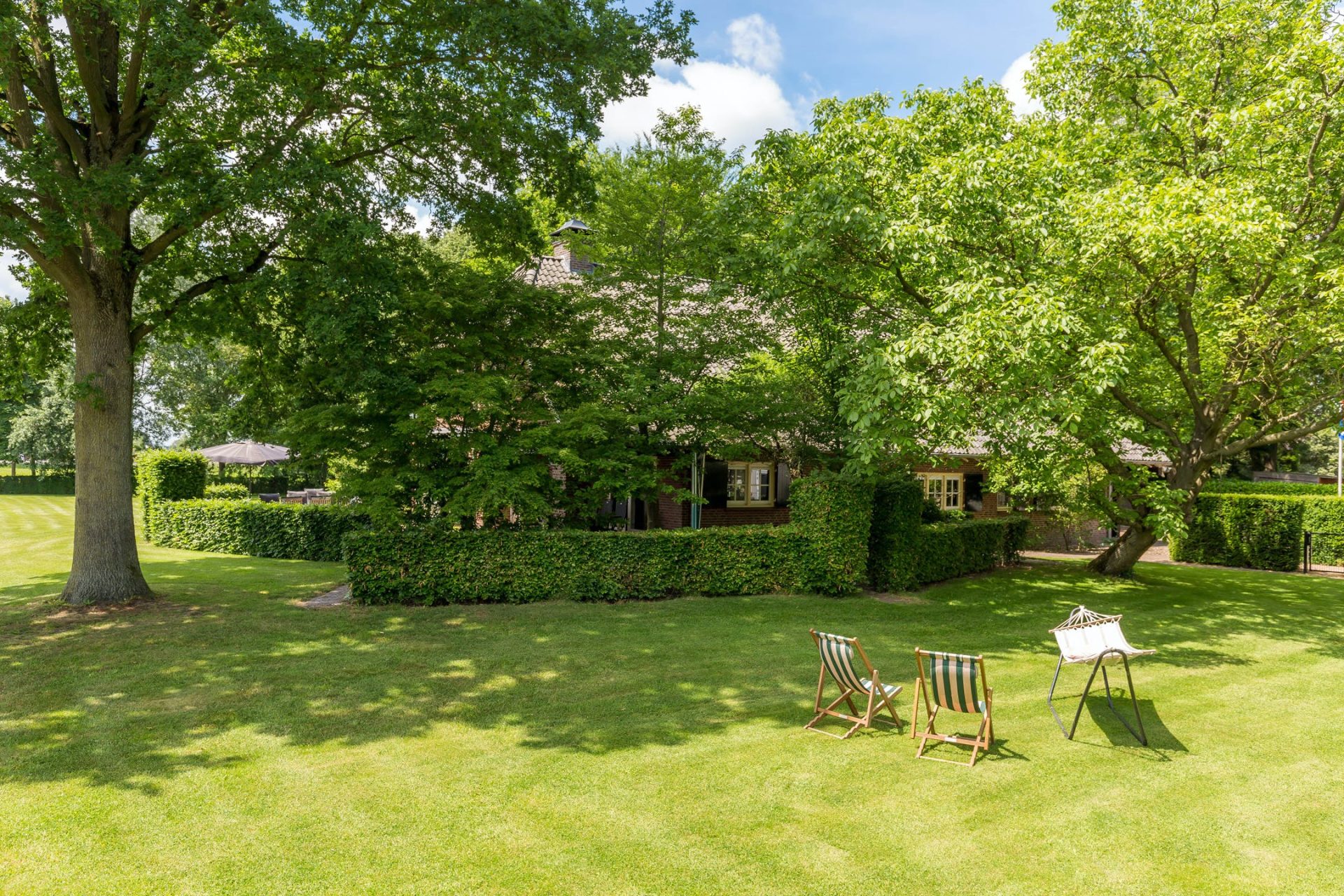 De lange oprijlaan, het gazon en het grote terras aan de zuidkant vormen een smaakvol geheel en bieden een uitnodigend decor voor kinderen, huisdieren en tuinliefhebbers. De bijgebouwen hebben elk een eigen terras waarbij de hoge bomen tijdens een deel van de dag zorgen voor schaduw.