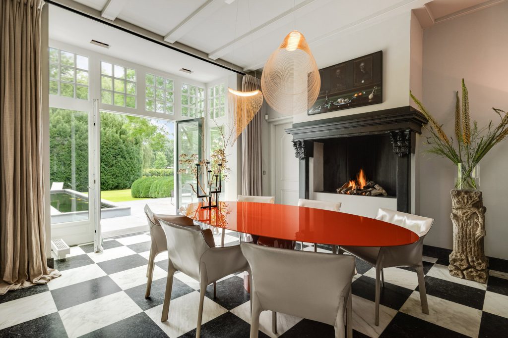 De eetkamer is buitengewoon sfeervol met een prachtige schouw, een gasgestookte open haard, marmeren vloer en een erker met dubbele openslaande deuren naar het terras met vijver