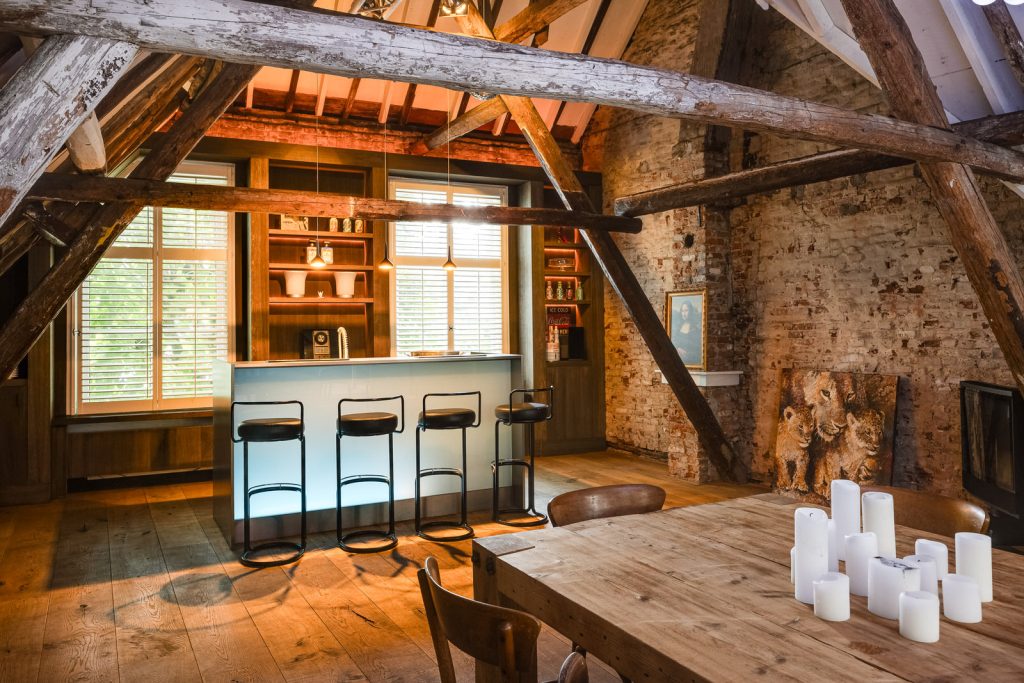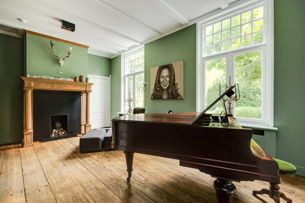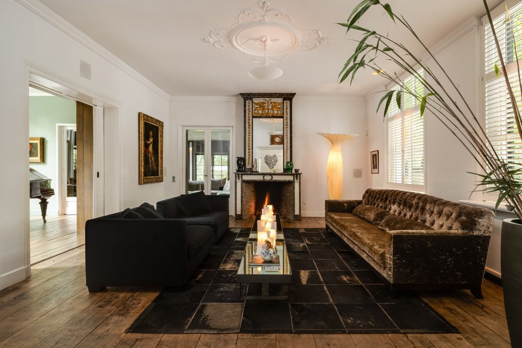De woonkamer straalt warmte en gezelligheid uit met brede, oude eikenhouten vloerdelen voorzien van vloerverwarming en shutters die zorgen voor zacht gedempt licht. Hier ontdekt u natuurlijk ook een sfeervolle schouw met open haard, een van de elf schouwen in deze woning.
