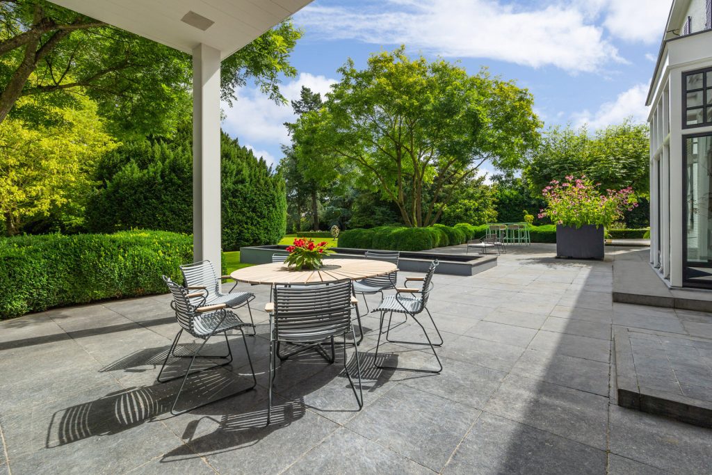 Aan de achterzijde strekt zich een riant hardstenen terras uit, gedeeltelijk overdekt met terrasverwarming. Dit terras omvat tevens een strakke en eigentijdse vijver met koi-karpers, die een kleurrijk accent toevoegt aan de buitenruimte.