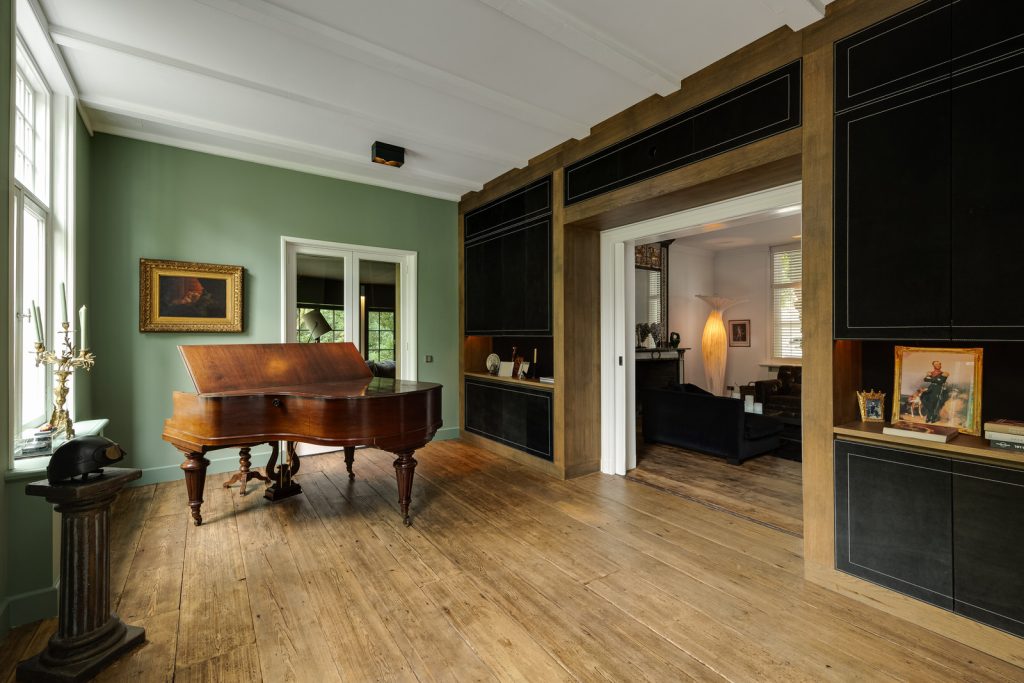 De bibliotheek, eveneens gelegen aan de tuinzijde, is voorzien van originele ensuite-deuren, grenen vloerdelen, een fraaie schouw en op maat gemaakte boekenkasten bekleed met zwart suède.