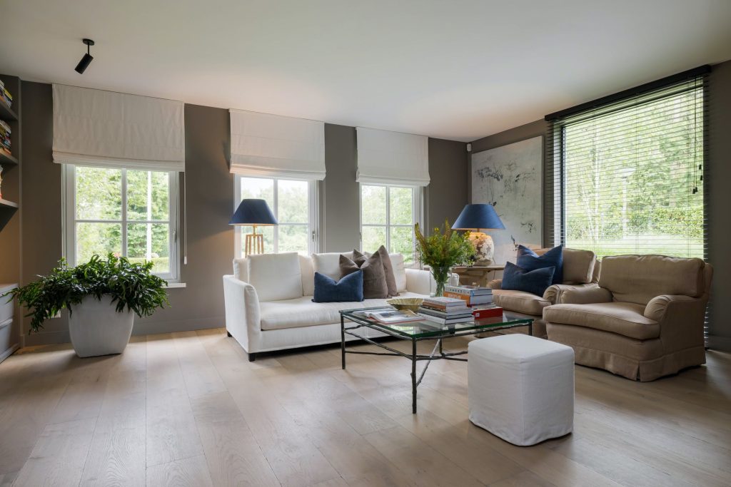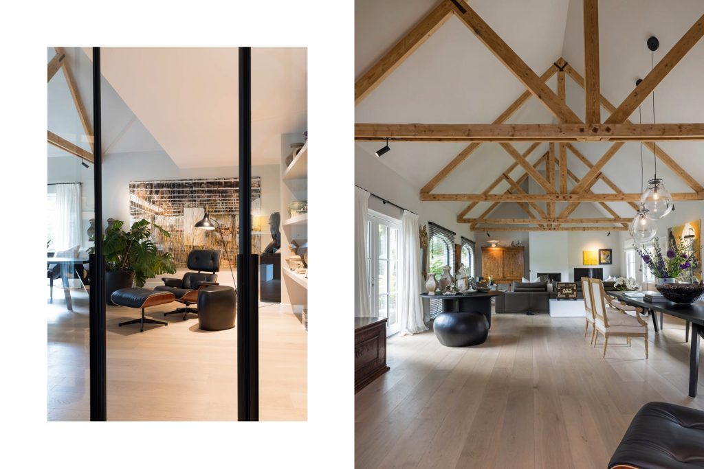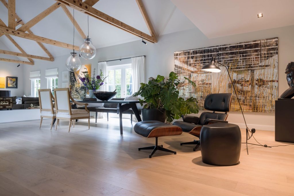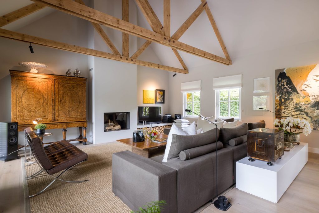 Verrassend en indrukwekkend: zo mag de woonkamer gerust worden genoemd. Dubbele deuren vanuit de woonkeuken geven toegang tot een prachtige living met grote raampartijen aan weerszijden, openslaande deuren naar de tuin en zicht tot in de nok. De fraaie houten vloer, het strakke witte stucwerk, de open haard bij het zitgedeelte en de houten kapconstructie vormen een ‘perfect match’.