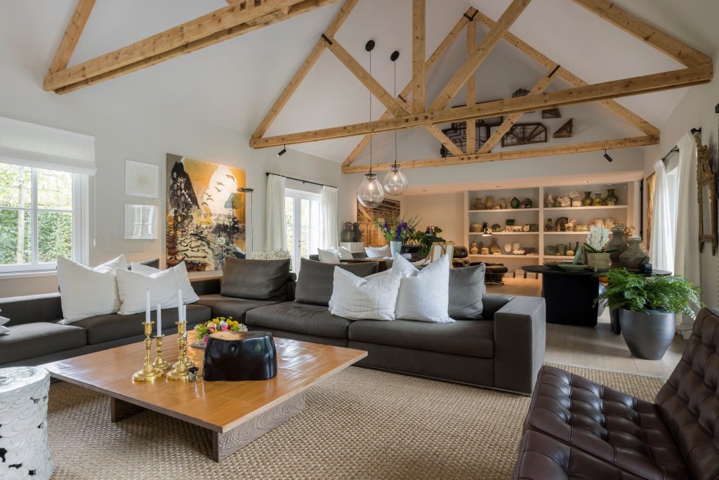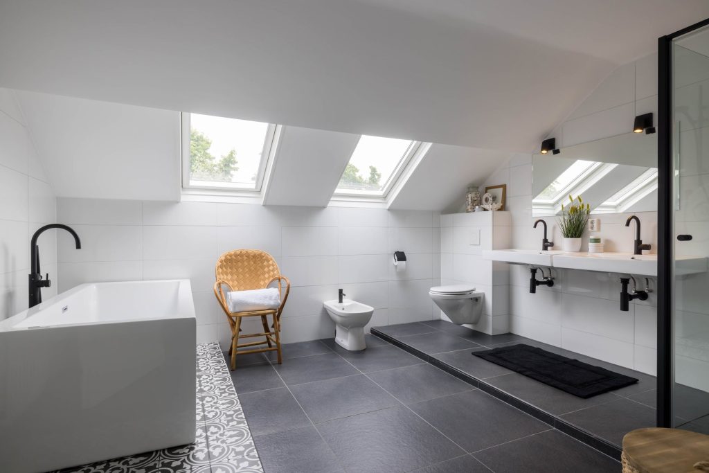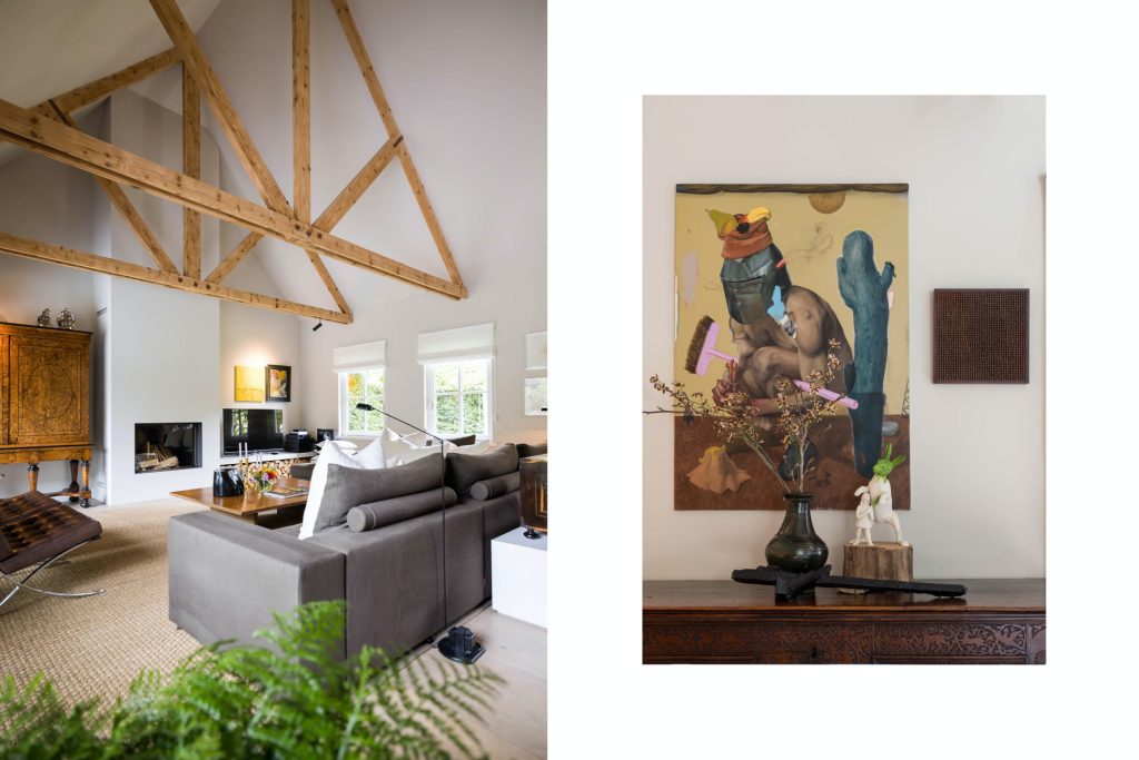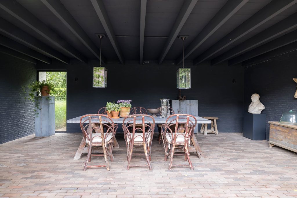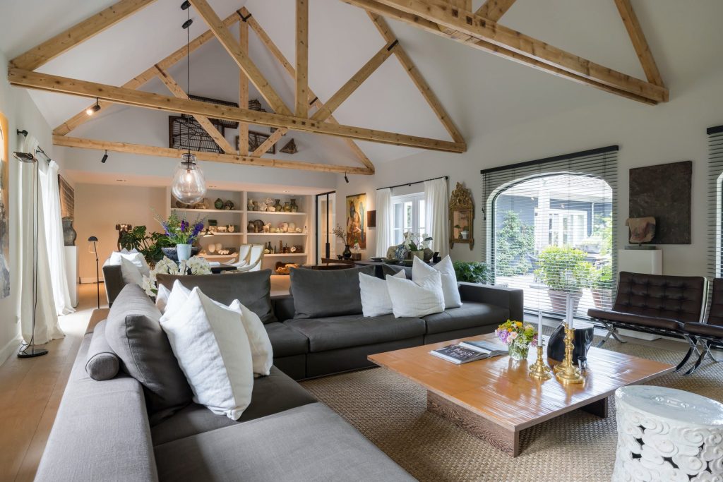 Verrassend en indrukwekkend: zo mag de woonkamer gerust worden genoemd. Dubbele deuren vanuit de woonkeuken geven toegang tot een prachtige living met grote raampartijen aan weerszijden, openslaande deuren naar de tuin en zicht tot in de nok. De fraaie houten vloer, het strakke witte stucwerk, de open haard bij het zitgedeelte en de houten kapconstructie vormen een ‘perfect match’.