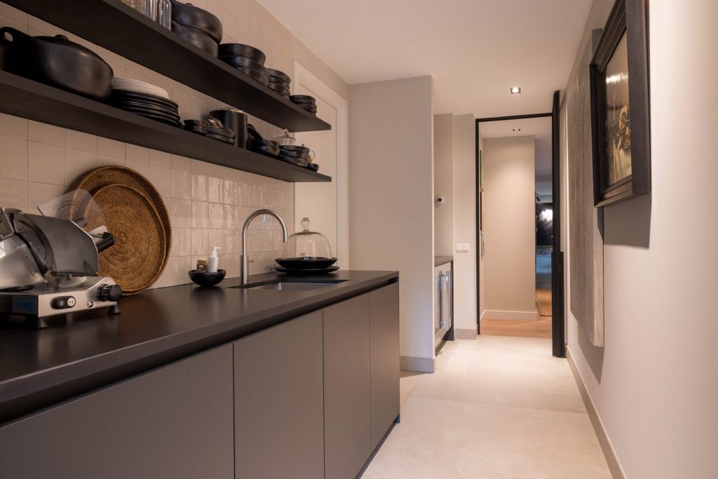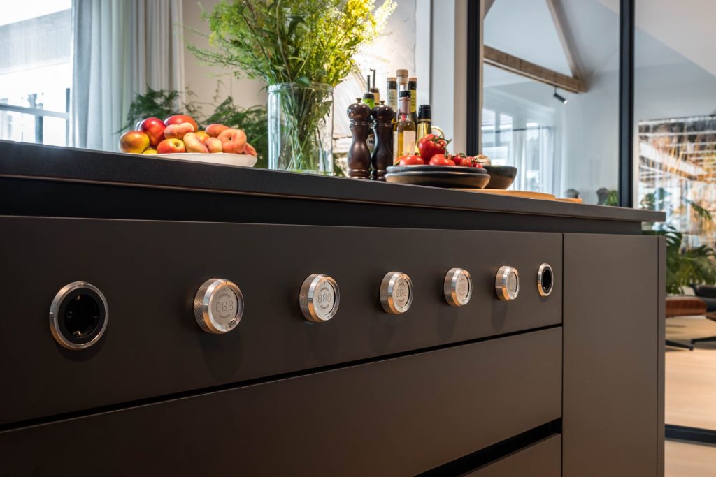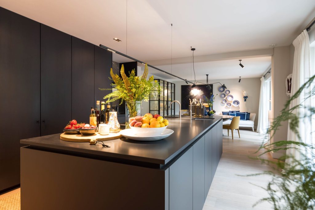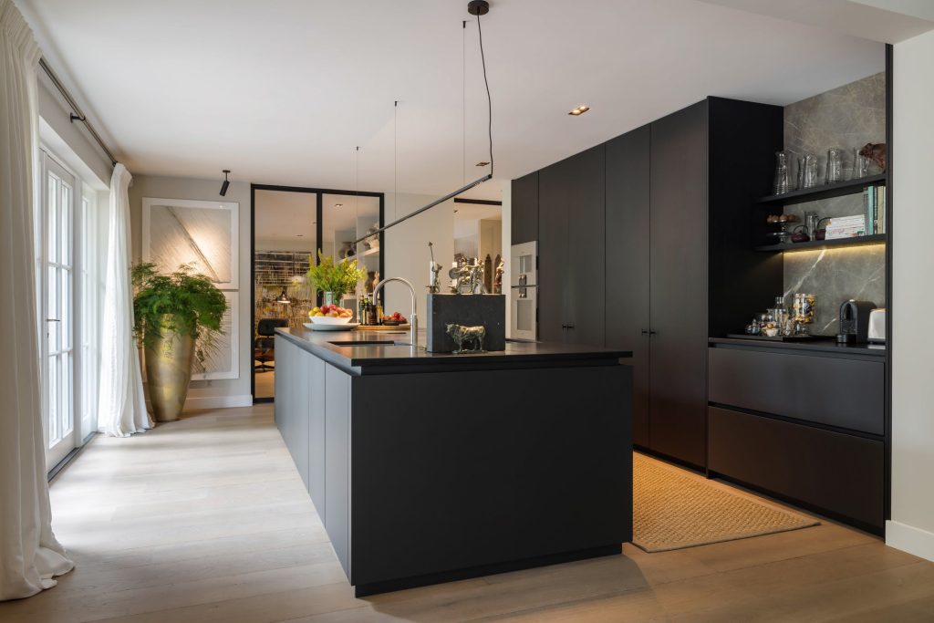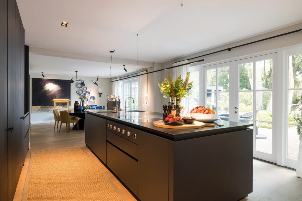 Vanuit de centrale hal komt u in de grote woonkeuken, voorzien van een ruim eet- en kookgedeelte. Openslaande tuindeuren zorgen voor optimaal contact met de tuin en een directe verbinding met het grote terras, zodat u bij mooi weer ook heerlijk buiten kunt eten. Uw blik valt direct op de designkeuken met een groot kook- en spoeleiland en een ruime kastenwand met koffiecorner. Alle benodigde inbouwapparatuur is van topkwaliteit — iets dat de echte kookliefhebber zeker zal aanspreken.