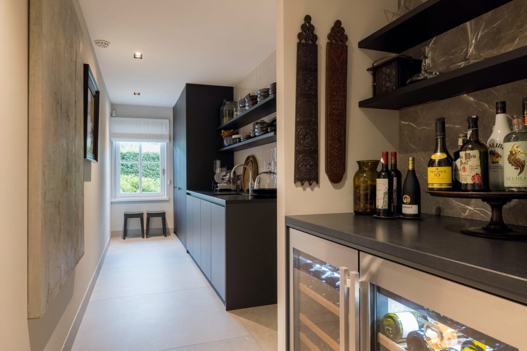 Vanuit de woonkeuken is de bijkeuken bereikbaar, met een tweede, eveneens op maat gemaakte keukenopstelling. Dit is een uitstekend en praktisch verlengstuk van de woonkeuken dankzij de grote hoeveelheid extra bergruimte en een tweede aanrechtblad met gootsteen. De bijkeuken staat in verbinding met de dubbele inpandige garage en de daarboven gelegen hobbyzolder.