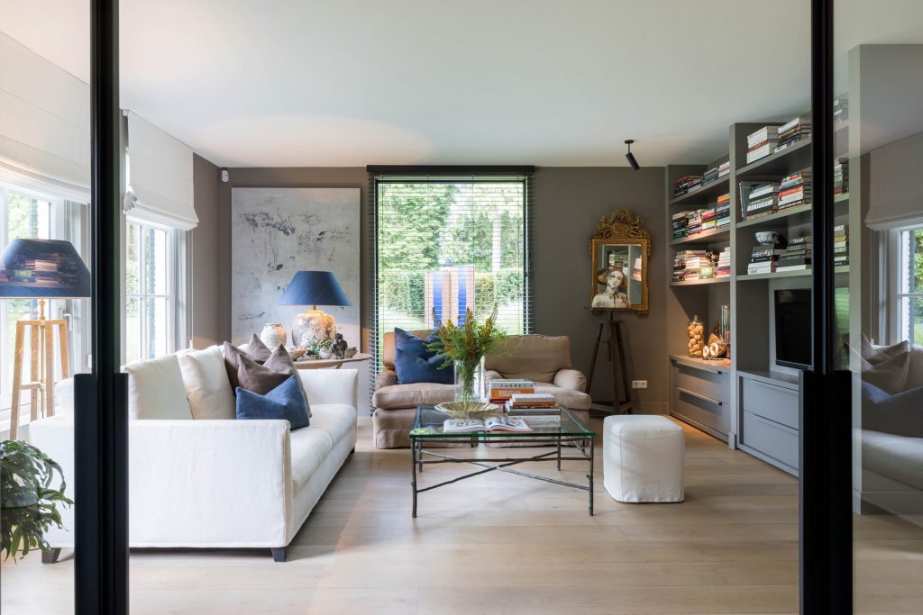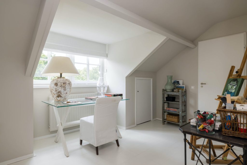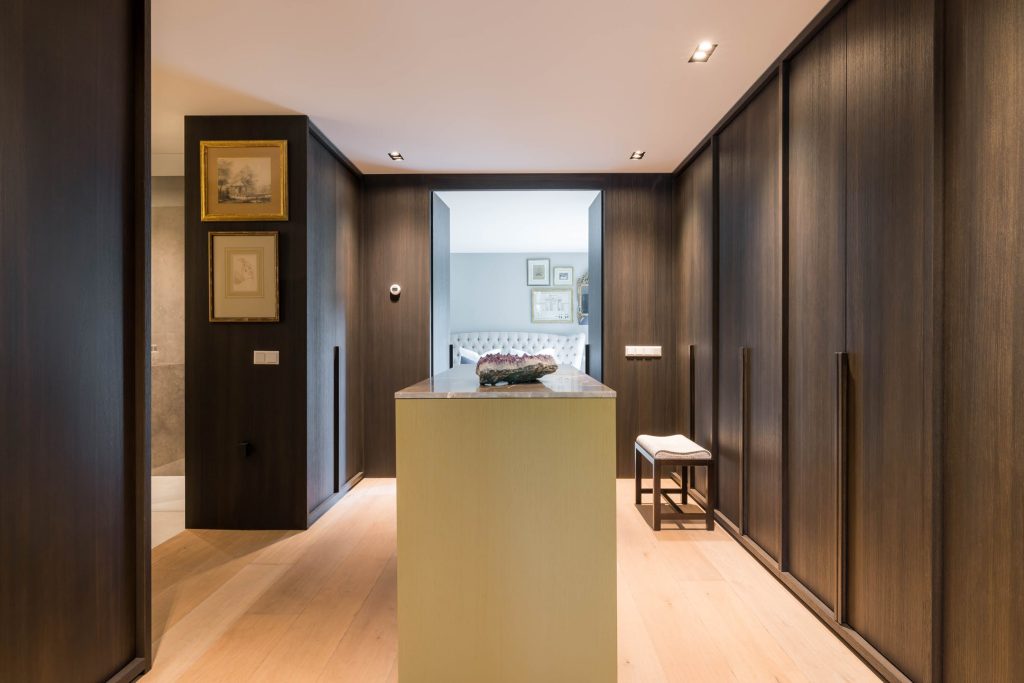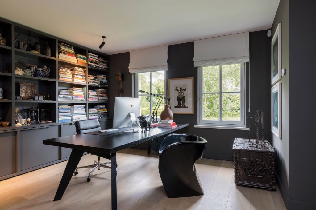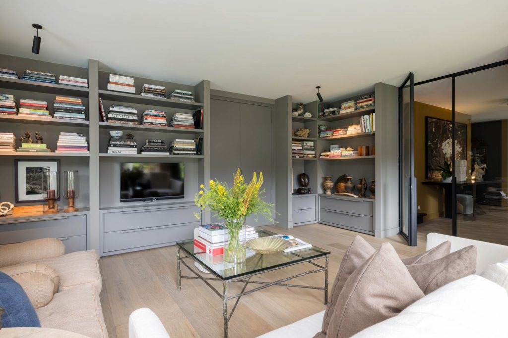 Aan de voorzijde van de woning liggen twee mooie kamers. Eén is ingericht als home office en de ander als tweede living c.q. tv-kamer. De home office heeft een op maat gemaakte kastenwand, net als de tv-kamer. Via openslaande deuren bereikt u vanuit deze kamer de kleedkamer, die op haar beurt in verbinding staat met de badkamer en master bedroom op de begane grond.