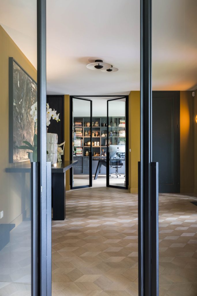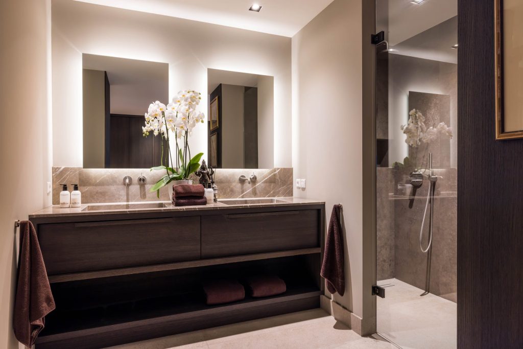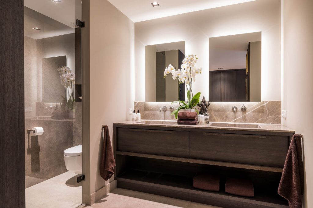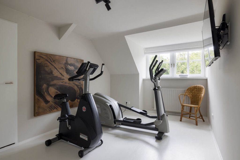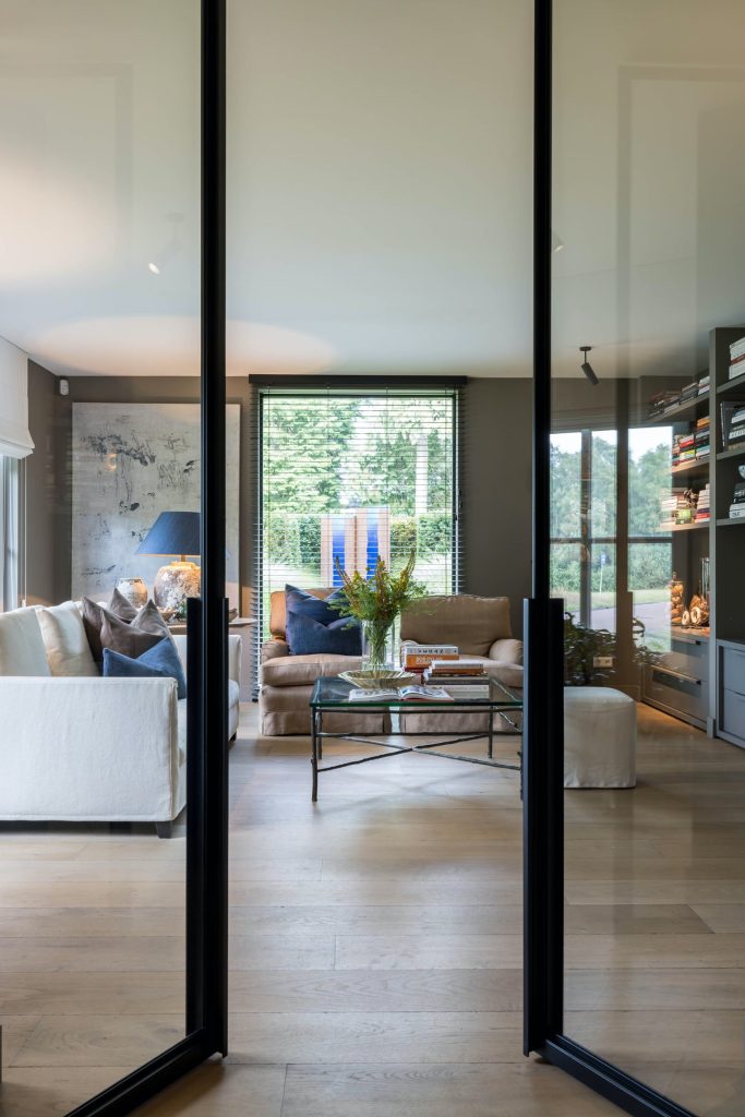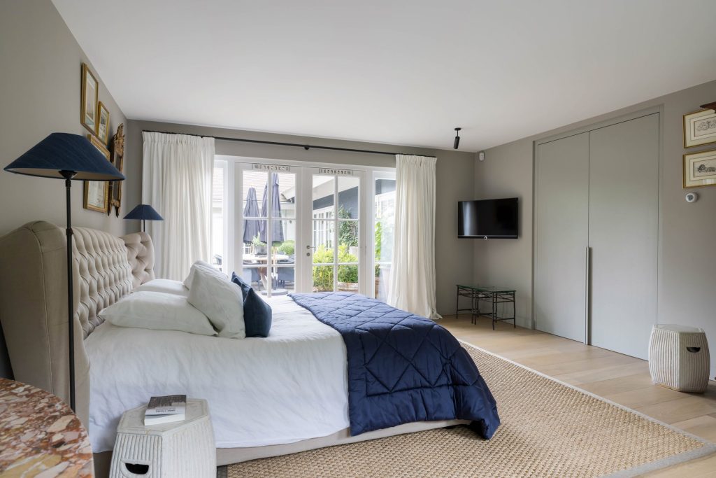 Aan de voorzijde van de woning liggen twee mooie kamers. Eén is ingericht als home office en de ander als tweede living c.q. tv-kamer. De home office heeft een op maat gemaakte kastenwand, net als de tv-kamer. Via openslaande deuren bereikt u vanuit deze kamer de kleedkamer, die op haar beurt in verbinding staat met de badkamer en master bedroom op de begane grond.