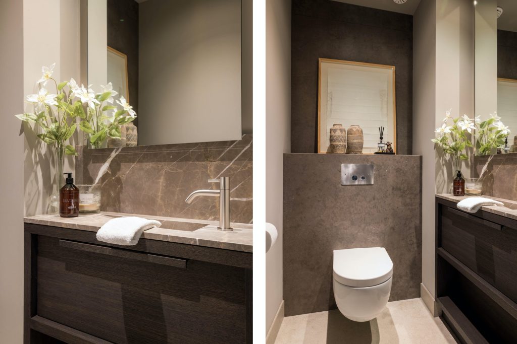 De begane grond heeft een vloeroppervlakte van bijna 300 m². Stijl en kwaliteit komen hier samen in pure schoonheid en luxe, zodat het u aan niets ontbreekt. In de prachtige en ruime ontvangsthal ziet u zwarte stalen binnendeuren gecombineerd met warme kleuren en hoogwaardige materialen. In deze hal bevinden zich de garderobe, een toiletruimte, de trapopgang naar de verdieping en de wijn-/provisiekelder.