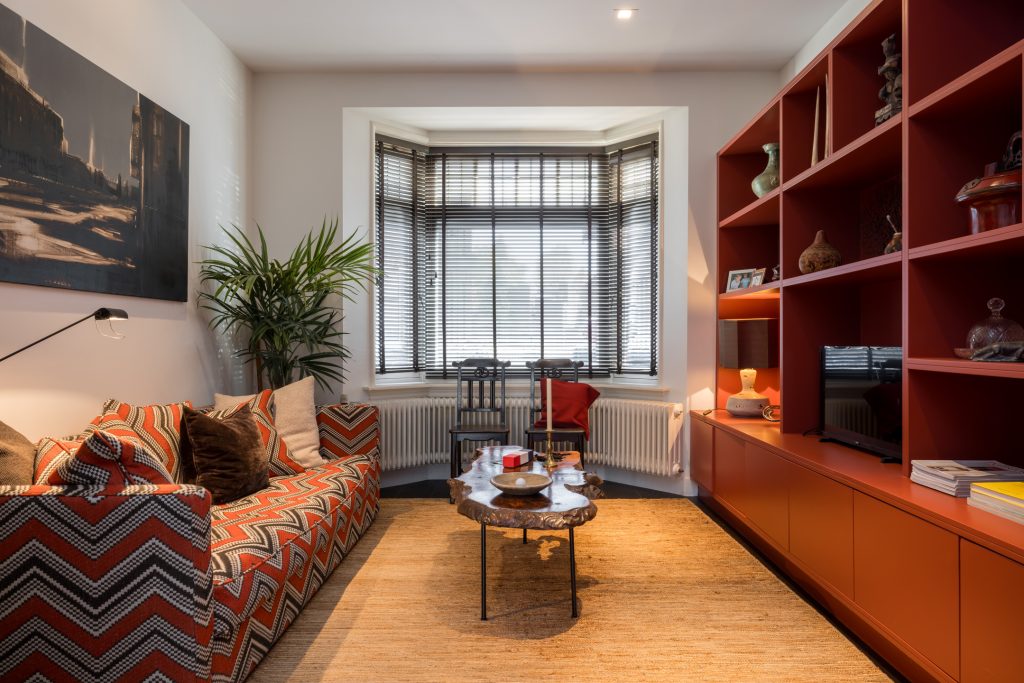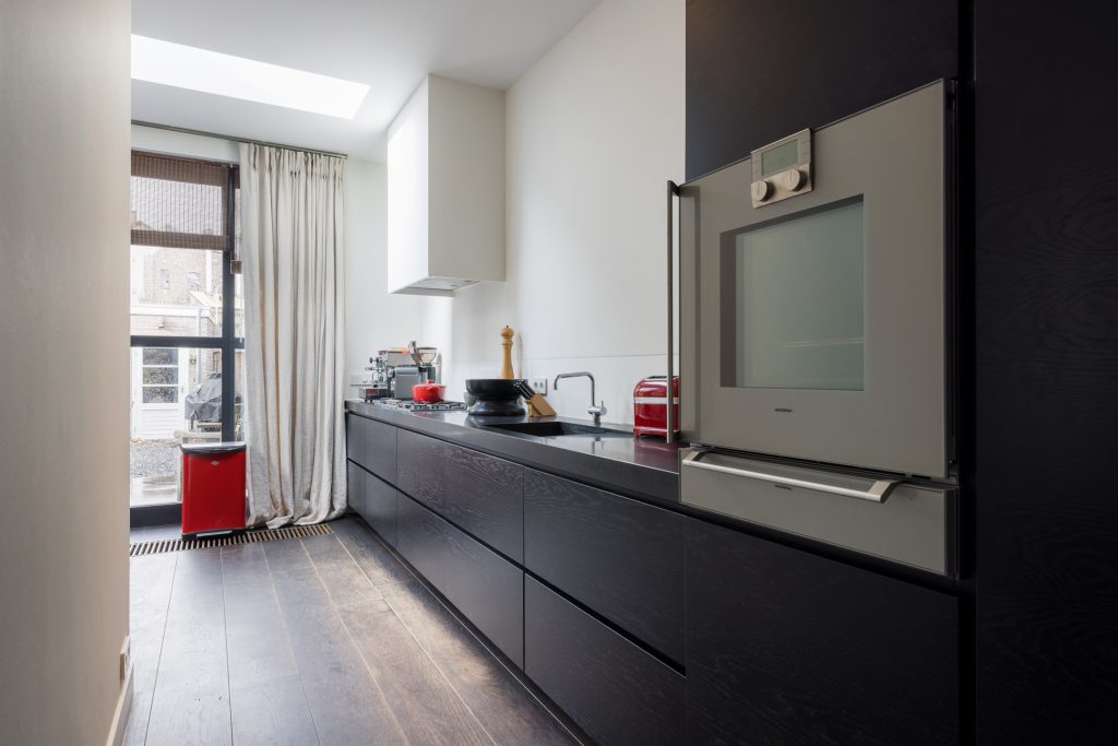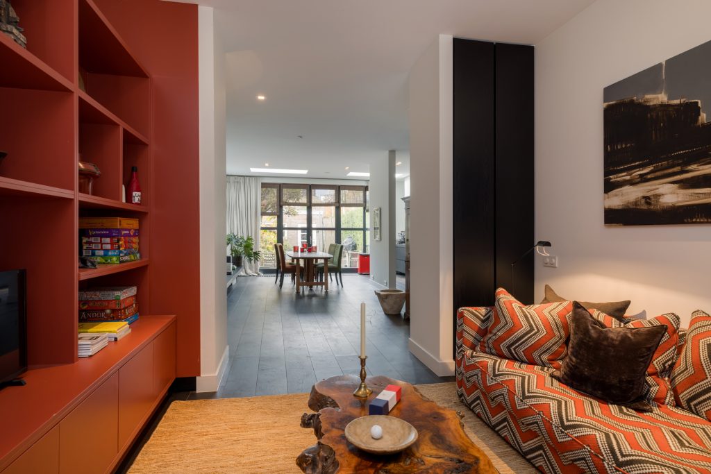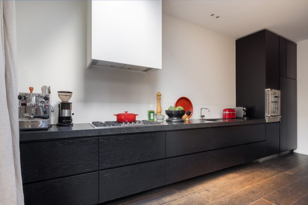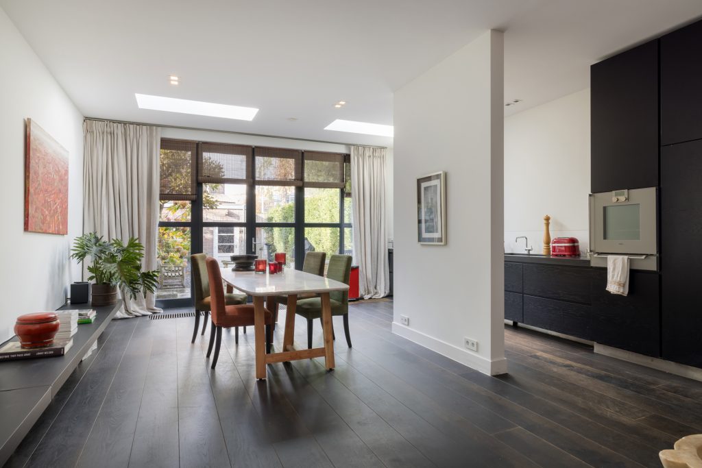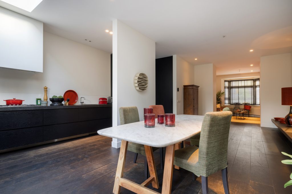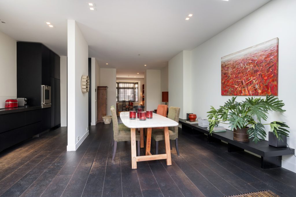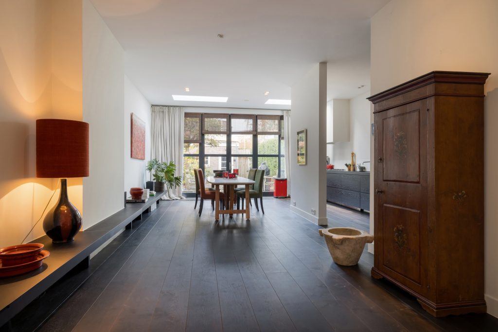 De woonkamer met keuken is een zeer royale leefruimte, waar sfeer en stijl volop aanwezig zijn. Aan de voorzijde is het zitgedeelte met een erker, een vaste kast en een maatwerk wandmeubel. Het eetgedeelte vormt samen met de keuken een fantastische plek om te koken, eten en om gasten te ontvangen. De luxe keukenopstelling met Gaggenau inbouwapparatuur biedt alles wat een kookliefhebber nodig heeft.