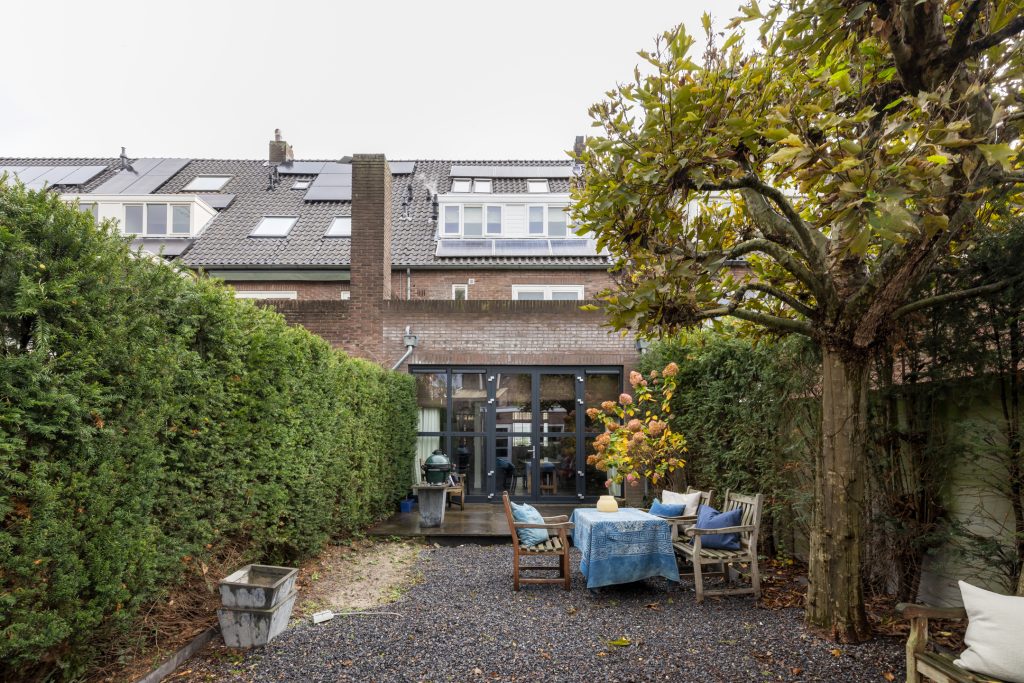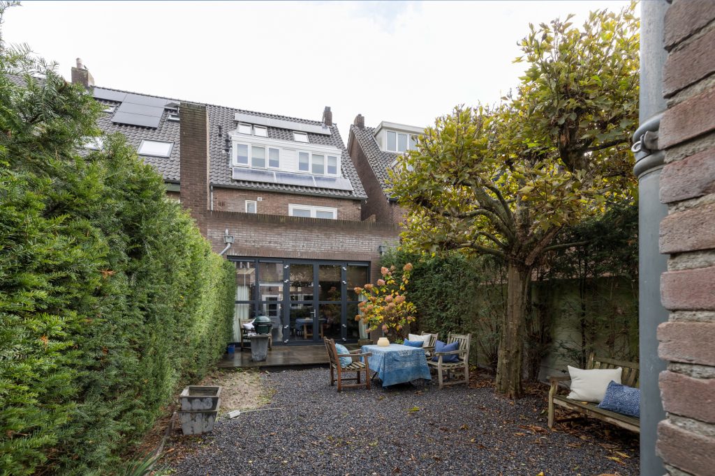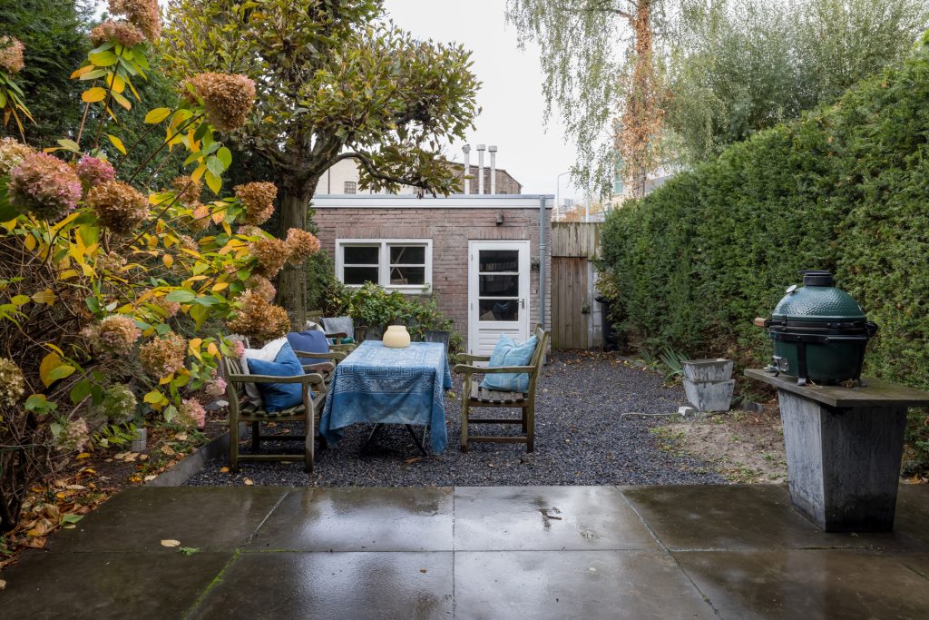 De woonkamer en keuken staan op een fraaie wijze in verbinding met de tuin, gesitueerd op het westen. Er zijn meerdere plekken om buiten te zitten, zowel in de zon als schaduw. Opvallend is dat er veel privacy in de tuin is, mede dankzij de hoge beplanting aan weerszijden. Het stadsleven wordt compleet gemaakt door de (fietsen)berging en achterom.