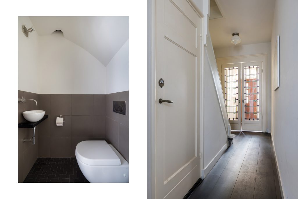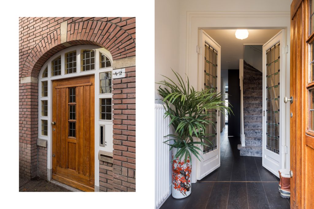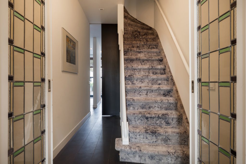 Bewonder de prachtige voorgevel van dit herenhuis en loop naar de entree, omlijst met glas-in loodramen. Via de hardhouten voordeur loop je de vestibule in, die in verbinding met de fraaie hal staat. Dubbele deuren met glas-in lood en de originele trap, bekleed met tapijt, bepalen de sfeer. Aan het einde van de hal is het stijlvolle gastentoilet.